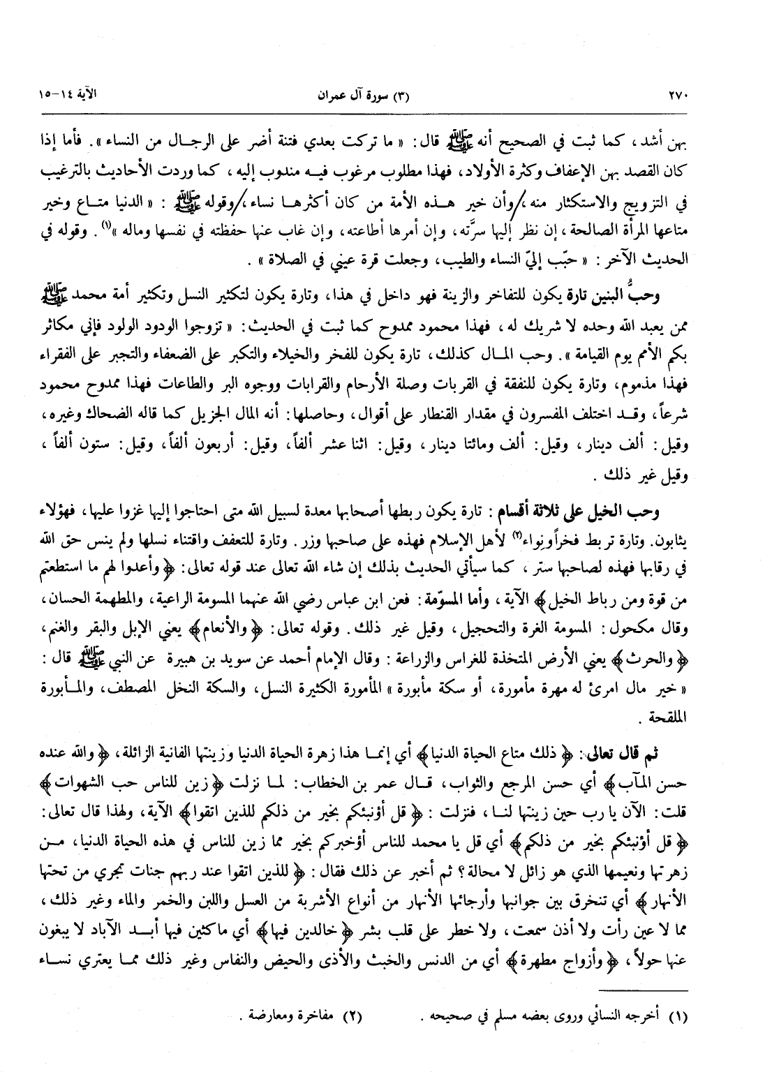 وحبُّ الْبَنِينَ تَارَةً يَكُونُ لِلتَّفَاخُرِ وَالزِّينَةِ فَهُوَ دَاخِلٌ فِي هَذَا، وَتَارَةً يَكُونُ لِتَكْثِيرِ النَّسْلِ وَتَكْثِيرِ أُمَّةِ مُحَمَّدٍ صَلَّى اللَّهُ عَلَيْهِ وَسَلَّمَ مِمَّنْ يَعْبُدُ اللَّهَ وَحْدَهُ لَا شَرِيكَ لَهُ، فَهَذَا مَحْمُودٌ مَمْدُوحٌ كَمَا ثَبَتَ فِي الْحَدِيثِ: «تَزَوَّجُوا الْوَدُودَ الْوَلُودَ فَإِنِّي مُكَاثِرٌ بِكُمُ الْأُمَمَ يَوْمَ الْقِيَامَةِ» وَحُبُّ الْمَالِ كَذَلِكَ، تَارَةً يَكُونُ لِلْفَخْرِ وَالْخُيَلَاءِ وَالتَّكَبُّرِ عَلَى الضُّعَفَاءِ وَالتَّجَبُّرِ عَلَى الْفُقَرَاءِ فَهَذَا مَذْمُومٌ، وَتَارَةً يَكُونُ لِلنَّفَقَةِ فِي الْقُرُبَاتِ وَصِلَةِ الْأَرْحَامِ وَالْقَرَابَاتِ وَوُجُوهِ الْبِرِّ وَالطَّاعَاتِ فهذا ممدوح محمود شَرْعًا، وَقَدِ اخْتَلَفَ الْمُفَسِّرُونَ فِي مِقْدَارِ الْقِنْطَارِ على أقول، وحاصلها: أنه المال الجزيل كما قال الضَّحَّاكُ وَغَيْرُهُ، وَقِيلَ: أَلْفُ دِينَارٍ، وَقِيلَ: أَلْفٌ وَمِائَتَا دِينَارٍ، وَقِيلَ: اثْنَا عَشَرَ أَلْفًا، وَقِيلَ: أربعون ألفاً، وقيل: ستون ألفاً، وقيل غير ذلك.