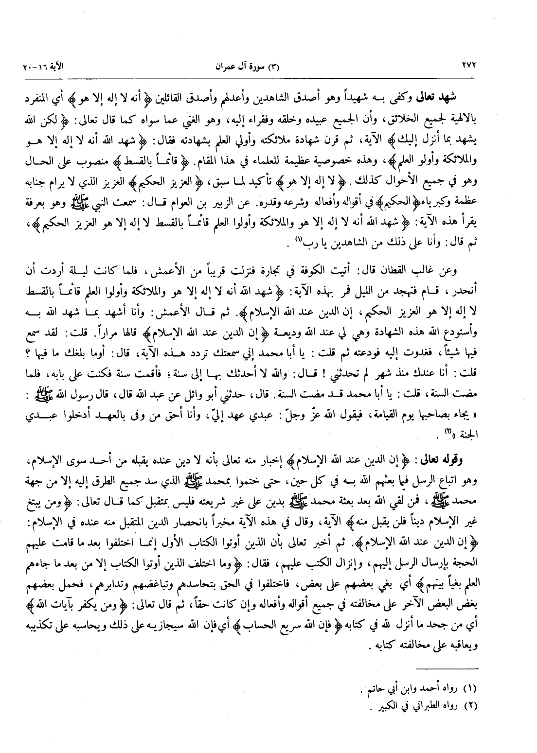 شَهِدَ تَعَالَى وَكَفَى بِهِ شَهِيدًا وَهُوَ أَصْدَقُ الشَّاهِدِينَ وَأَعْدَلُهُمْ وَأَصْدَقُ الْقَائِلِينَ {أَنَّهُ لَا إِلَهَ إِلاَّ هُوَ} أي المنفرد بِالْإِلَهِيَّةِ لِجَمِيعِ الْخَلَائِقِ، وَأَنَّ الْجَمِيعَ عَبِيدُهُ وَخَلْقُهُ وفقراء إِلَيْهِ، وَهُوَ الْغَنِيُّ عَمَّا سِوَاهُ كَمَا قَالَ تَعَالَى: {لَكِنِ اللَّهُ يَشْهَدُ بِمَآ أَنزَلَ إِلَيْكَ} الآية، ثُمَّ قَرَنَ شَهَادَةَ مَلَائِكَتِهِ وَأُولِي الْعِلْمِ بِشَهَادَتِهِ فَقَالَ: {شَهِدَ اللَّهُ أَنَّهُ لاَ إِلَهَ إِلَّا هو والملائكة وألو الْعِلْمِ}، وَهَذِهِ خُصُوصِيَّةٌ عَظِيمَةٌ لِلْعُلَمَاءِ فِي هَذَا الْمَقَامِ. {قَآئِمَاً بِالْقِسْطِ} مَنْصُوبٌ عَلَى الْحَالِ وَهُوَ فِي جَمِيعِ الْأَحْوَالِ كَذَلِكَ. {لَا إِلَهَ إِلَّا هُوَ} تَأْكِيدٌ لِمَا سَبَقَ، {الْعَزِيزُ الْحَكِيمُ} الْعَزِيزُ الَّذِي لَا يُرَامُ جَنَابُهُ عَظَمَةً وَكِبْرِيَاءً {الْحَكِيمُ} في أقواله وأفعاله وشرعه وقدره. عن الزبير بن العوام قَالَ: سَمِعْتُ النَّبِيَّ صَلَّى اللَّهُ عَلَيْهِ وَسَلَّمَ وَهُوَ بِعَرَفَةَ يَقْرَأُ هَذِهِ الْآيَةَ: {شَهِدَ اللَّهُ إِنَّهُ لاَ إله إلا هو والملائكة وأول الْعِلْمِ قَآئِمَاً بِالْقِسْطِ لَا إِلَهَ إِلَّا هُوَ العزيز الحكيم}، ثم قال: وَأَنَا عَلَى ذَلِكَ مِنَ الشَّاهِدِينَ يَا رَبِّ (رواه أحمد وابن أبي حاتم)