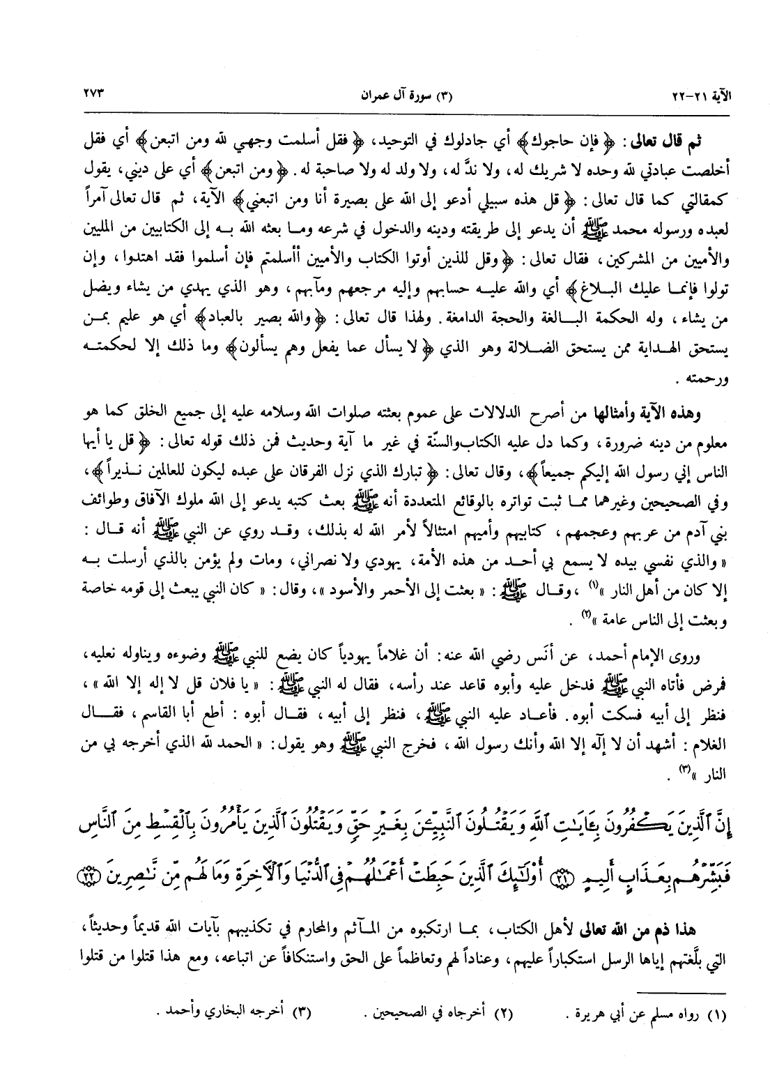 ثُمَّ قَالَ تَعَالَى: {فَإنْ حَآجُّوكَ} أَيْ جَادَلُوكَ فِي التَّوْحِيدِ، {فَقُلْ أَسْلَمْتُ وَجْهِيَ للَّهِ وَمَنِ اتَّبَعَنِ} أَيْ فَقُلْ أَخْلَصْتُ عِبَادَتِي لِلَّهِ وَحْدَهُ لَا شَرِيكَ لَهُ، وَلاَ ندَّ لَهُ، وَلَا وَلَدَ لَهُ وَلَا صَاحِبَةَ لَهُ. {وَمَنِ اتبعن} أي عَلَى دِينِي، يَقُولُ كَمَقَالَتِي كَمَا قَالَ تَعَالَى: {قُلْ هَذِهِ سَبِيلِي أَدْعُو إِلَى اللَّهِ عَلَى بَصِيرَةٍ أَنَاْ وَمَنِ اتبعني} الآية، ثُمَّ قَالَ تَعَالَى آمِرًا لِعَبْدِهِ وَرَسُولِهِ مُحَمَّدٍ صَلَّى اللَّهُ عَلَيْهِ وَسَلَّمَ أَنْ يَدْعُوَ إِلَى طَرِيقَتِهِ وَدِينِهِ وَالدُّخُولِ فِي شَرْعِهِ وَمَا بَعَثَهُ الله به إلى الكتابيين من المليين؟؟ والأميين من المشركين، فقال تَعَالَى: {وَقُلْ لِّلَّذِينَ أُوتُواْ الْكِتَابَ وَالْأُمِّيِّينَ أَأَسْلَمْتُمْ فَإِنْ أَسْلَمُواْ فَقَدِ اهْتَدَوْا، وَّإِن تَوَلَّوْاْ فَإِنَّمَا عَلَيْكَ الْبَلَاغُ} أَيْ وَاللَّهُ عَلَيْهِ حِسَابُهُمْ وَإِلَيْهِ مَرْجِعُهُمْ وَمَآبُهُمْ، وَهُوَ الَّذِي يَهْدِي مَنْ يَشَاءُ وَيُضِلُّ مَنْ يَشَاءُ، وَلَهُ الْحِكْمَةُ الْبَالِغَةُ وَالْحُجَّةُ الدَّامِغَةُ. وَلِهَذَا قَالَ تعالى: {وَاللَّهُ بَصِيرٌ بِالْعِبَادِ} أَيْ هُوَ عَلِيمٌ بِمَنْ يَسْتَحِقُّ الْهِدَايَةَ مِمَّنْ يَسْتَحِقُّ الضَّلَالَةَ وَهُوَ الَّذِي {لَا يُسْأَلُ عَمَّا يَفْعَلُ وَهُمْ يُسْأَلُونَ} وما ذلك إلا لحمكته وَرَحْمَتِهِ.