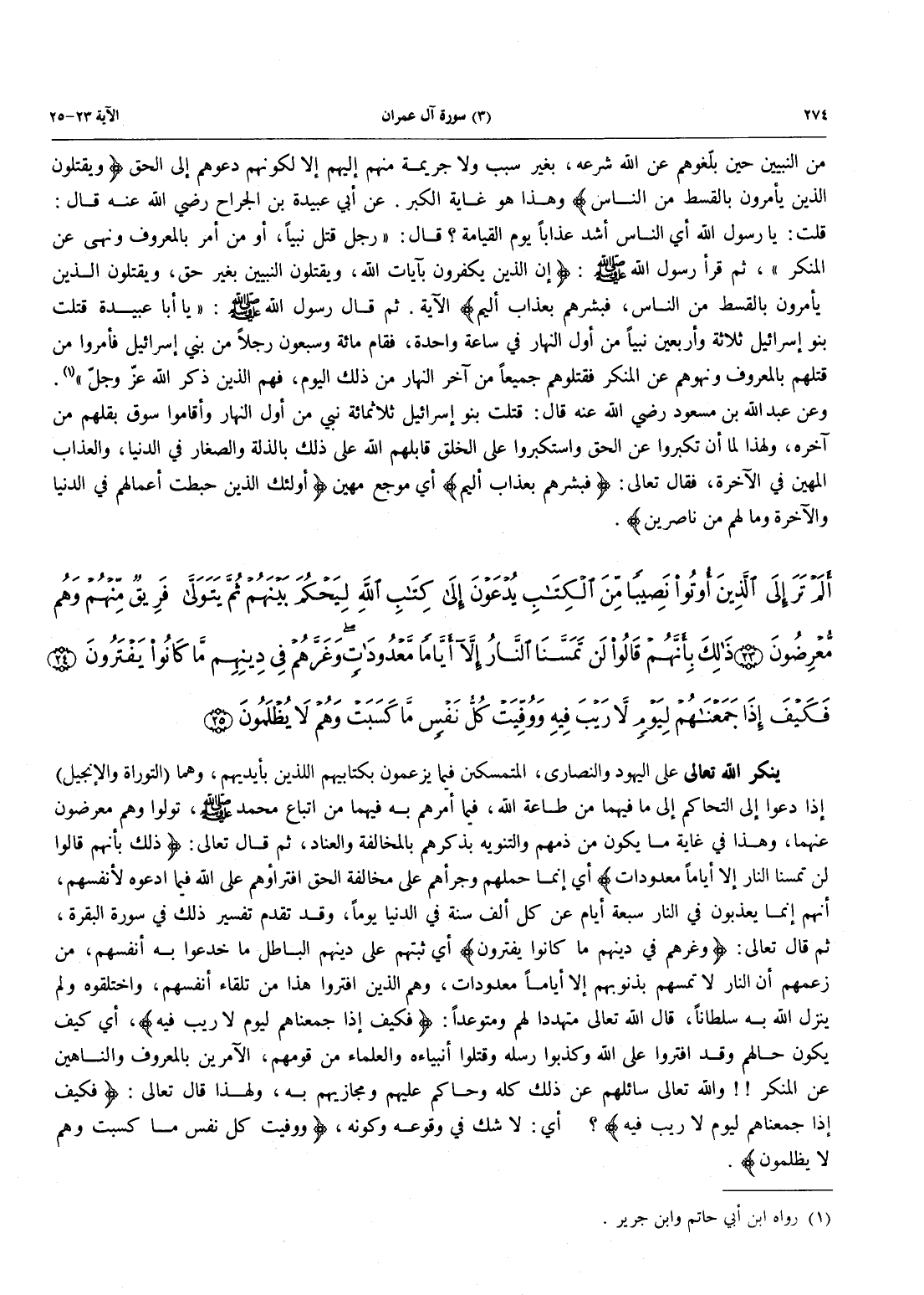 مِنَ النَّبِيِّينَ حِينَ بَلَّغُوهُمْ عَنِ اللَّهِ شَرْعَهُ، بغير سبب ولا جريمة منهم إليهم إِلَيْهِمْ إِلَّا لِكَوْنِهِمْ دَعَوْهُمْ إِلَى الْحَقِّ {وَيَقْتُلُونَ الَّذِينَ يَأْمُرُونَ بِالْقِسْطِ مِنَ النَّاسِ} وَهَذَا هُوَ غاية الكبر. عَنْ أَبِي عُبَيْدَةَ بْنِ الْجَرَّاحِ رَضِيَ اللَّهُ عَنْهُ قَالَ: قُلْتُ: يَا رَسُولَ الله أي النَّاسِ أَشَدُّ عَذَابًا يَوْمَ الْقِيَامَةِ؟ قَالَ: «رَجُلٌ قَتَلَ نَبِيًّا، أَوْ مَنْ أَمَرَ بِالْمَعْرُوفِ وَنَهَى عَنِ الْمُنْكَرِ» ثُمَّ قَرَأَ رَسُولُ اللَّهِ صَلَّى اللَّهُ عَلَيْهِ وَسَلَّمَ: {إِنَّ الَّذِينَ يَكْفُرُونَ بِآيَاتِ اللَّهِ، وَيَقْتُلُونَ النَّبِيِّينَ بِغَيْرِ حَقٍّ وَيَقْتُلُونَ الَّذِينَ يَأْمُرُونَ بِالْقِسْطِ مِنَ النَّاسِ، فَبَشِّرْهُم بِعَذَابٍ أَلِيمٍ} الْآيَةَ. ثُمَّ قَالَ رَسُولُ اللَّهِ صَلَّى اللَّهُ عَلَيْهِ وَسَلَّمَ: «يَا أَبَا عُبَيْدَةَ قَتَلَتْ بَنُو إِسْرَائِيلَ ثَلَاثَةً وَأَرْبَعِينَ نَبِيًّا مِنْ أَوَّلِ النَّهَارِ في ساعة واحد، فَقَامَ مِائَةٌ وَسَبْعُونَ رَجُلًا مِنْ بَنِي إِسْرَائِيلَ فَأَمَرُوا مَنْ قَتَلَهُمْ بِالْمَعْرُوفِ وَنَهَوْهُمْ عَنِ الْمُنْكَرِ فقتلوهم جَمِيعًا مِنْ آخِرِ النَّهَارِ مِنْ ذَلِكَ الْيَوْمِ، فهم الذين ذكر اللَّهِ عزَّ وجلَّ» (رَوَاهُ ابْنُ أَبِي حَاتِمٍ وابن جرير) وَعَنْ عَبْدِ اللَّهِ بْنِ مَسْعُودٍ رَضِيَ اللَّهُ عَنْهُ قَالَ: قَتَلَتْ بَنُو إِسْرَائِيلَ ثَلَاثَمِائَةِ نَبِيٍّ مِنْ أَوَّلِ النَّهَارِ وَأَقَامُوا سُوقَ بَقْلِهِمْ مِنْ آخره، وَلِهَذَا لَمَّا أَنْ تَكَبَّرُوا عَنِ الْحَقِّ وَاسْتَكْبَرُوا عَلَى الْخَلْقِ قَابَلَهُمُ اللَّهُ عَلَى ذَلِكَ بِالذِّلَّةِ وَالصَّغَارِ فِي الدُّنْيَا، وَالْعَذَابِ الْمُهِينِ فِي الْآخِرَةِ، فقال تعالى: {فَبَشِّرْهُم بِعَذَابٍ أَلِيمٌ} أَيْ مُوجِعٍ مُهِينٍ {أُولَئِكَ الَّذِينَ حَبِطَتْ أَعْمَالُهُمْ فِي الدُّنْيَا وَالْآخِرَةِ وَمَا لَهُمْ مِّن نَّاصِرِينَ}.