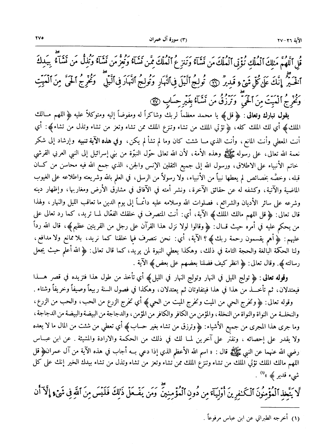 يقول تبارك وتعالى: {قل} يا محمد معظماً لربك وشاكراً له ومفوضاً إليه ومتوكلاً عليه {اللَّهُمَّ مَالِكَ الْمُلْكِ} أَيْ لَكَ الْمُلْكُ كُلُّهُ، {تُؤْتِي الْمُلْكَ مَن تَشَآءُ وَتَنزِعُ الْمُلْكَ مِمَّنْ تَشَآءُ وَتُعِزُّ مَن تَشَآءُ وَتُذِلُّ مَن تَشَآءُ}: أَيْ أَنْتَ الْمُعْطِي وَأَنْتَ الْمَانِعُ، وَأَنْتَ الَّذِي مَا شِئْتَ كَانَ وَمَا لَمْ تَشَأْ لَمْ يَكُنْ، وَفِي هَذِهِ الْآيَةِ تَنْبِيهٌ وَإِرْشَادٌ إِلَى شُكْرِ نِعْمَةِ اللَّهِ تَعَالَى، عَلَى رَسُولِهِ صَلَّى اللَّهُ عَلَيْهِ وَسَلَّمَ وَهَذِهِ الْأُمَّةِ، لِأَنَّ اللَّهَ تعالى حَوَّلَ النُّبُوَّةَ مِنْ بَنِي إِسْرَائِيلَ إِلَى النَّبِيِّ العربي القرشي خَاتَمِ الْأَنْبِيَاءِ عَلَى الْإِطْلَاقِ، وَرَسُولِ اللَّهِ إِلَى جَمِيعِ الثَّقَلَيْنِ الْإِنْسِ وَالْجِنِّ، الَّذِي جَمَعَ اللَّهُ فِيهِ مَحَاسِنَ مَنْ كَانَ قَبْلَهُ، وخصَّه بِخَصَائِصَ لَمْ يُعْطِهَا نَبِيًّا مِنَ الْأَنْبِيَاءِ، وَلَا رَسُولًا مِنَ الرُّسُلِ، فِي الْعِلْمِ بِاللَّهِ وَشَرِيعَتِهِ وَإِطْلَاعِهِ على الغيوب الماضية والآتية، وكشفه له عَنْ حَقَائِقِ الْآخِرَةِ، وَنَشْرِ أُمَّتِهِ فِي الْآفَاقِ فِي مَشَارِقِ الْأَرْضِ وَمَغَارِبِهَا، وَإِظْهَارِ دِينِهِ وَشَرْعِهِ عَلَى سَائِرِ الْأَدْيَانِ وَالشَّرَائِعِ فَصَلَوَاتُ اللَّهِ وَسَلَامُهُ عَلَيْهِ دَائِمًا إِلَى يَوْمِ الدِّينِ مَا تَعَاقَبَ اللَّيْلُ وَالنَّهَارُ، وَلِهَذَا قَالَ تَعَالَى: {قُلِ اللَّهُمَّ مَالِكَ الملك} الآية، أَيْ: أَنْتَ الْمُتَصَرِّفُ فِي خَلْقِكَ الْفَعَّالُ لِمَا تريد، كما رد تعالى على من يحكم عَلَيْهِ فِي أَمْرِهِ حَيْثُ قَالَ: {وَقَالُواْ لَوْلاَ نُزِّلَ هَذَا الْقُرْآنُ عَلَى رَجُلٍ مِّنَ الْقَرْيَتَيْنِ عَظِيمٍ}، قال الله رداً عليهم: {أَهُمْ يَقْسِمُونَ رحمة ربك}؟ الآية: نحن نتصرف فيما خَلْقِنَا كَمَا نُرِيدُ، بِلَا مُمَانِعٍ وَلَا مُدَافِعٍ، ولنا الحكمة البالغة والحجة التامة في ذلك، وهكذا يعطي النبوة لمن يريد، كما قال تعالى: {والله أعلم حَيْثُ يَجْعَلُ رِسَالَتَهُ} وَقَالَ تَعَالَى {انْظُرْ كَيْفَ فَضَّلْنَا بَعْضَهُمْ عَلَى بَعْضٍ} الآية.