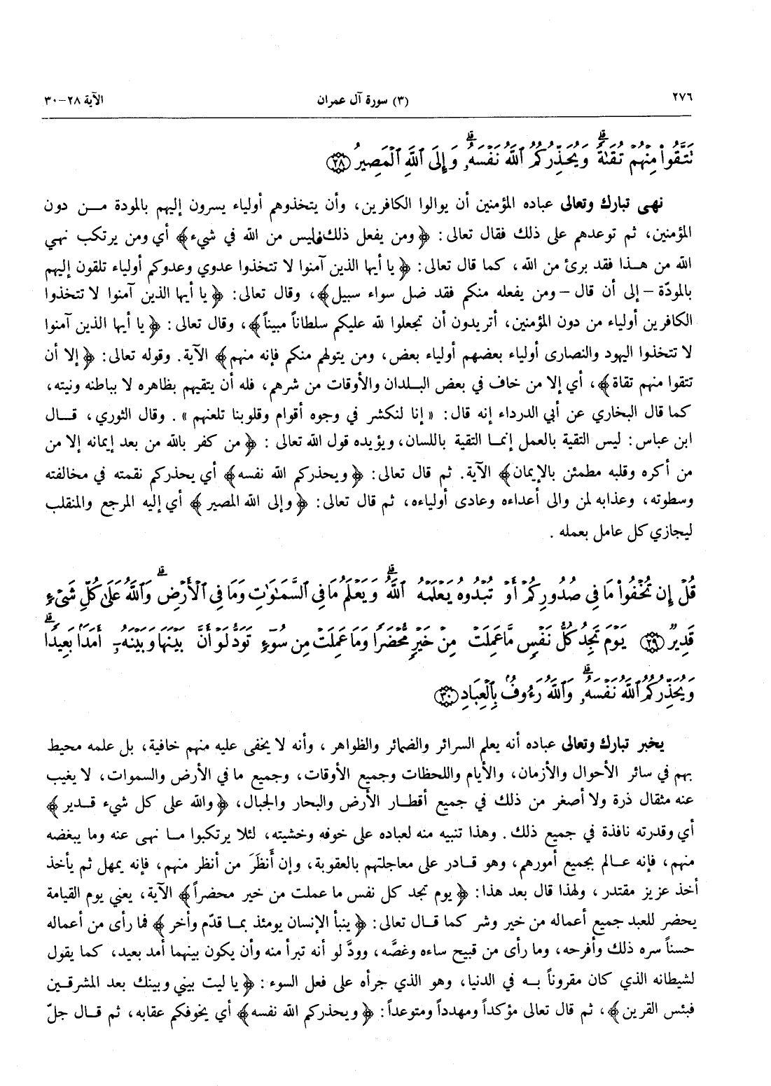نهى تَبَارَكَ وَتَعَالَى عِبَادَهُ الْمُؤْمِنِينَ أَنْ يُوَالُوا الْكَافِرِينَ، وَأَنْ يَتَّخِذُوهُمْ أَوْلِيَاءَ يُسِرُّونَ إِلَيْهِمْ بِالْمَوَدَّةِ مِن دُونِ المؤمنين، ثم توعدهم على ذلك فقال تعالى: {وَمَن يَفْعَلْ ذلك ليس من الله في شَيْءٍ} أي ومن يرتكب نهي الله من هذا فقد برىء مِنَ اللَّهِ، كَمَا قَالَ تَعَالَى: {يَا أَيُّهَا الَّذِينَ آمَنُواْ لاَ تَتَّخِذُواْ عَدُوِّي وَعَدُوَّكُمْ أَوْلِيَآءَ تُلْقُونَ إِلَيْهِمْ بِالْمَوَدَّةِ - إِلَى أَنْ قَالَ - وَمَن يَفْعَلْهُ مِنكُمْ فَقَدْ ضَلَّ سَوَآءَ السَّبِيلِ}، وَقَالَ تَعَالَى: {يَا أَيُّهَا الَّذِينَ آمَنُواْ لاَ تَتَّخِذُواْ الْكَافِرِينَ أَوْلِيَآءَ مِن دُونِ الْمُؤْمِنِينَ، أَتُرِيدُونَ أَن تَجْعَلُواْ للَّهِ عَلَيْكُمْ سلطاناً مبيناً}، وَقَالَ تَعَالَى: {يَا أَيُّهَا الَّذِينَ آمَنُواْ لاَ تَتَّخِذُواْ الْيَهُودَ وَالنَّصَارَى أَوْلِيَآءَ بَعْضُهُمْ أَوْلِيَآءُ بَعْضٍ، وَمَن يَتَوَلَّهُمْ مِّنكُمْ فَإِنَّهُ مِنْهُمْ} الآية. وقوله تعالى: {إِلاَّ أَن تَتَّقُواْ مِنْهُمْ تُقَاةً}، أَيْ إِلَّا من خاف في بعض البلدان والأوقات مِنْ شَرِّهِمْ، فَلَهُ أَنْ يَتَّقِيَهُمْ بِظَاهِرِهِ لَا بباطنه ونيته، كما قال الْبُخَارِيُّ عَنْ أَبِي الدَّرْدَاءِ أَنَّهُ قَالَ: «إنَّا لَنَكْشِرُ فِي وُجُوهِ أَقْوَامٍ وَقُلُوبُنَا تَلْعَنُهُمْ». وَقَالَ الثوري، قال ابن عباس: ليس التقية بالعمل إنما التقية باللسان، ويؤيده قَوْلُ اللَّهِ تَعَالَى: {مَن كَفَرَ بِاللَّهِ مِن بَعْدِ إيمَانِهِ إِلاَّ مَنْ أُكْرِهَ وَقَلْبُهُ مُطْمَئِنٌّ بالإيمان} الآية. ثُمَّ قَالَ تَعَالَى: {وَيُحَذِّرُكُمُ اللَّهُ نَفْسَهُ} أَيْ يحذركم نقمته في مخالفته وسطوته، وعذابه والى أعدءه وَعَادَى أَوْلِيَاءَهُ، ثُمَّ قَالَ تَعَالَى: {وَإِلَى اللَّهِ المصير} أي إليه المرجع والمنقلب ليجازى كل عامل بعمله.