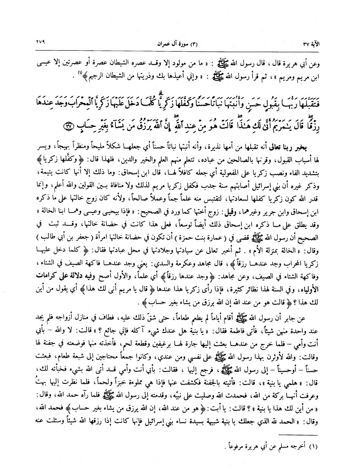 - 37 - فَتَقَبَّلَهَا رَبُّهَا بِقَبُولٍ حَسَنٍ وَأَنبَتَهَا نَبَاتاً حَسَناً وَكَفَّلَهَا زَكَرِيَّا كُلَّمَا دَخَلَ عَلَيْهَا زَكَرِيَّا الْمِحْرَابَ وَجَدَ عِندَهَا رِزْقاً قَالَ يَا مَرْيَمُ أَنَّى لَكِ هَذَا قَالَتْ هُوَ مِنْ عِنْدِ اللَّهِ إِنَّ اللَّهَ يَرْزُقُ مَن يَشَآءُ بِغَيْرِ حساب