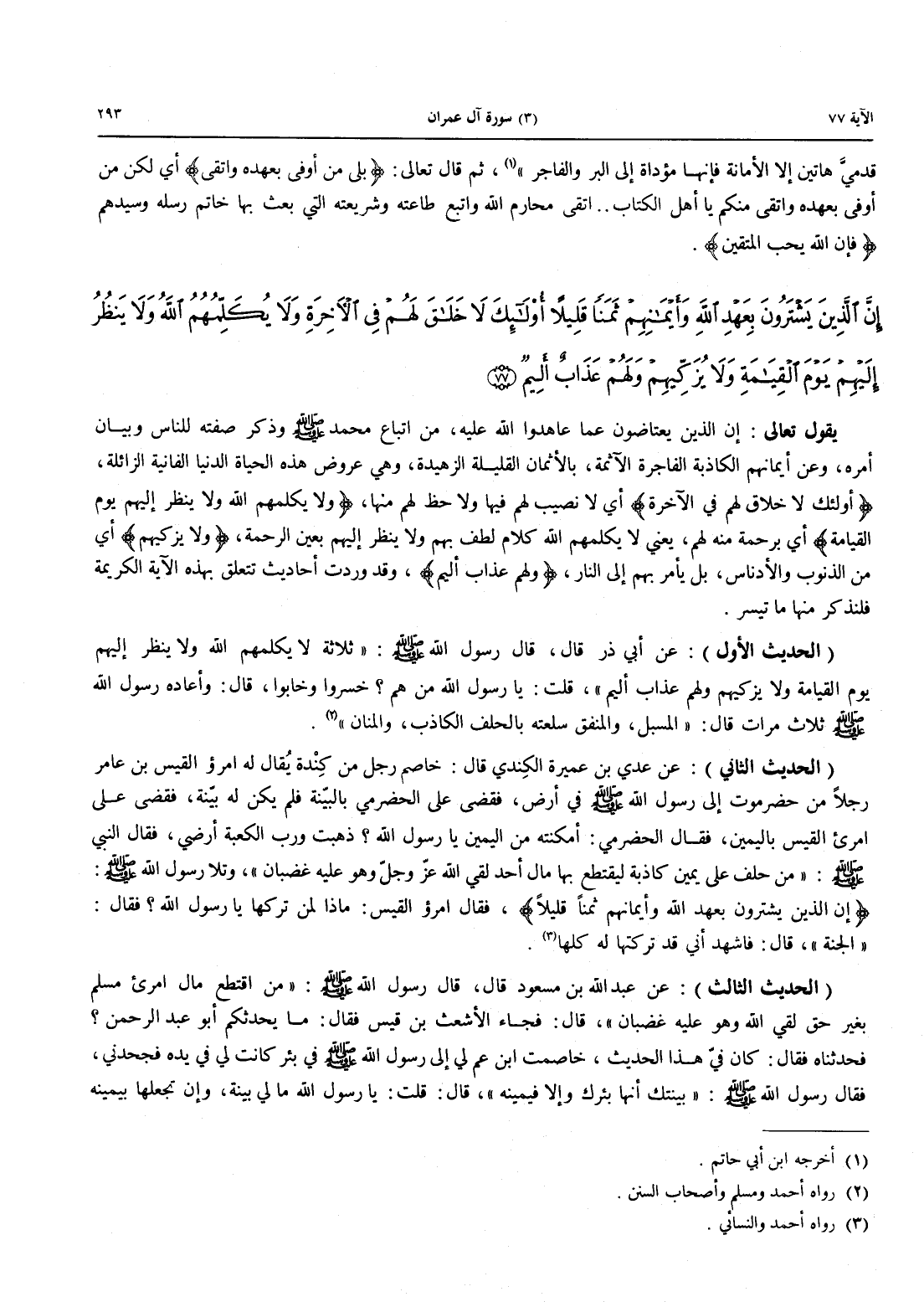 - 77 - إِنَّ الَّذِينَ يَشْتَرُونَ بِعَهْدِ اللَّهِ وَأَيْمَانِهِمْ ثَمَنًا قَلِيلًا أُولَئِكَ لاَ خَلاَقَ لَهُمْ فِي الْآخِرَةِ وَلاَ يُكَلِّمُهُمُ اللَّهُ وَلَا يَنْظُرُ إِلَيْهِمْ يَوْمَ الْقِيَامَةِ وَلَا يُزَكِّيهِمْ وَلَهُمْ عَذَابٌ أَلِيمٌ