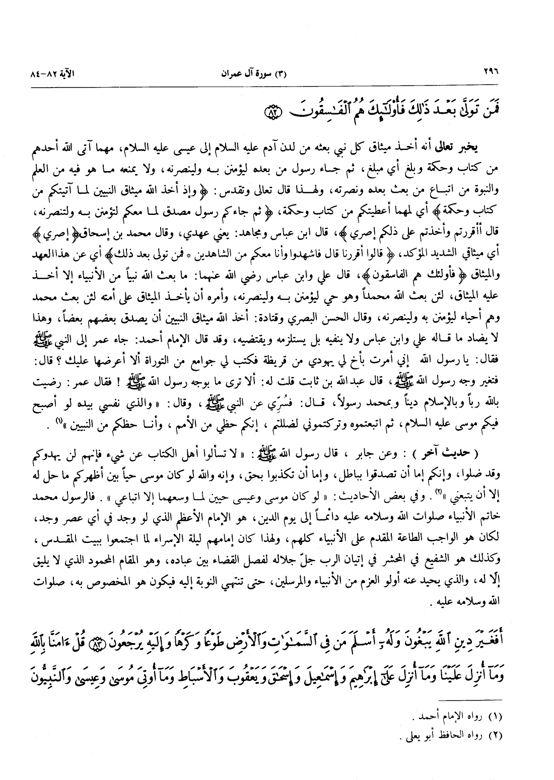 يخبر تعلاى أَنَّهُ أَخَذَ مِيثَاقَ كُلِّ نَبِيٍّ بَعَثَهُ مِنْ لدن آدم عليه السلام إلىعيسى عليه السلام، مهما آتى الله أحدهم من كتاب وحمكة وبلغ أي مبلغ، ثم جاء رَسُولٌ مِنْ بَعْدِهِ لَيُؤْمِنَنَّ بِهِ وَلَيَنْصُرَنَّهُ، وَلَا يَمْنَعْهُ مَا هُوَ فِيهِ مِنَ الْعِلْمِ وَالنُّبُوَّةِ مِنَ اتِّبَاعِ مَنْ بُعِثَ بَعْدَهُ وَنُصْرَتِهِ، وَلِهَذَا قَالَ تَعَالَى وَتَقَدَّسَ: {وَإِذْ أَخَذَ اللَّهُ مِيثَاقَ النَّبِيِّينَ لَمَآ آتَيْتُكُم مِّن كِتَابٍ وَحِكْمَةٍ} أَيْ لَمَهْمَا أَعْطَيْتُكُمْ مِّن كِتَابٍ وَحِكْمَةٍ، {ثُمَّ جَآءَكُمْ رَسُولٌ مُّصَدِّقٌ لِّمَا مَعَكُمْ لَتُؤْمِنُنَّ بِهِ وَلَتَنصُرُنَّهُ، قَالَ أَأَقْرَرْتُمْ وَأَخَذْتُمْ على ذلكم إِصْرِي}، قال ابن عباس ومجاهد: يَعْنِي عَهْدِي، وَقَالَ مُحَمَّدُ بْنُ إِسْحَاقَ {إِصْرِي} أَيْ مِيثَاقِي الشَّدِيدِ الْمُؤَكَّدِ، {قَالُوا أَقْرَرْنَا قَالَ فَاشْهَدُوا وَأَنَاْ مَعَكُمْ مِّنَ الشَّاهِدِينَ، فَمَنْ تَوَلَّى بَعْدَ ذَلِكَ} أَيْ عَنْ هَذَا الْعَهْدِ وَالْمِيثَاقِ {فأولئك هُمُ الفاسقون}، قال علي وابن عَبَّاسٍ رَضِيَ اللَّهُ عَنْهُمَا: مَا بَعَثَ اللَّهُ نَبِيًّا مِنَ الْأَنْبِيَاءِ إِلَّا أُخِذَ عَلَيْهِ الْمِيثَاقُ، لئن بعث الله محمداً وَهُوَ حَيٌّ لَيُؤْمِنَنَّ بِهِ وَلَيَنْصُرَنَّهُ، وَأَمَرَهُ أَنْ يَأْخُذَ الْمِيثَاقَ عَلَى أُمّته لَئِنْ بُعِثَ مُحَمَّدٌ وَهُمْ أَحْيَاءٌ ليؤمنن به ولينصرنه، وقال الحسن الْبَصْرِيُّ وَقَتَادَةُ: أَخَذَ اللَّهُ مِيثَاقَ النَّبِيِّينَ أَنْ يَصْدُقَ بَعْضُهُمْ بَعْضًا، وَهَذَا لَا يُضَادُّ مَا قَالَهُ عَلِيٌّ وَابْنُ عَبَّاسٍ وَلَا يَنْفِيهِ بَلْ يستلزمه ويقتضيه، وقد قال الإمام أحمد: جَاءَ عُمَرُ إِلَى النَّبِيِّ صَلَّى اللَّهُ عَلَيْهِ وَسَلَّمَ فَقَالَ: يا رسول الله إني أمرت بأخ لي يهودي مِنْ قُرَيْظَةَ فَكَتَبَ لِي جَوَامِعَ مِنَ التَّوْرَاةِ أَلَا أَعْرِضُهَا عَلَيْكَ؟ قَالَ: فَتَغَيَّرَ وَجْهُ رَسُولِ اللَّهِ صَلَّى اللَّهُ عَلَيْهِ وَسَلَّمَ، قَالَ عَبْدُ اللَّهِ بْنُ ثَابِتٍ قُلْتُ لَهُ: أَلَا تَرَى مَا بِوَجْهِ رَسُولِ اللَّهِ! فقال عمر: رضيت بِاللَّهِ رِبَّا وَبِالْإِسْلَامِ دِينًا وَبِمُحَمَّدٍ رَسُولًا، قَالَ: فسُرِّي عَنِ النَّبِيِّ صَلَّى اللَّهُ عَلَيْهِ وَسَلَّمَ، وَقَالَ: «والذي نفسي بِيَدِهِ لَوْ أَصْبَحَ فِيكُمْ مُوسَى عَلَيْهِ السَّلَامُ، ثُمَّ اتَّبَعْتُمُوهُ وَتَرَكْتُمُونِي لَضَلَلْتُمْ، إِنَّكُمْ حَظِّي مِنَ الأمم، وأنا حظكم من النبيين» (رواه الإمام أحمد)