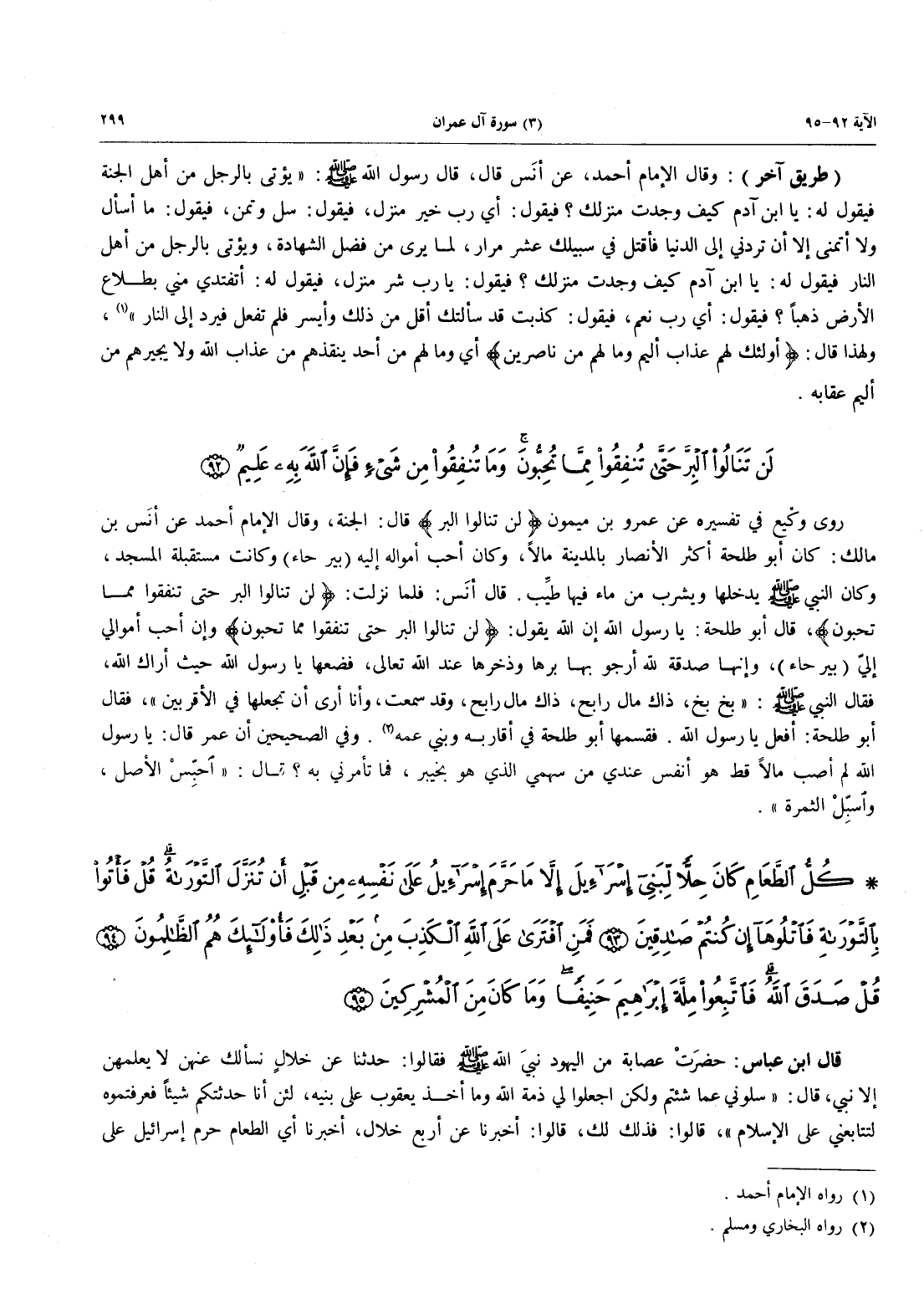روى وكيع في تفسيره عَنْ عَمْرِو بْنِ مَيْمُونٍ {لَن تَنَالُواْ الْبِرَّ} قال: الجنة، وقال الإمام أحمد عن أنَس بن مالك: كان أبو طلحة أكثر الأنصار بالمدينة مالاً، وكان أحب أمواله إليه (بير حاء) وَكَانَتْ مُسْتَقْبِلَةَ الْمَسْجِدِ، وَكَانَ النَّبِيُّ صَلَّى اللَّهُ عَلَيْهِ وَسَلَّمَ يَدْخُلُهَا وَيَشْرَبُ مِنْ مَاءٍ فِيهَا طيِّب. قَالَ أنَس: فَلَمَّا نَزَلَتْ: {لَن تَنَالُواْ الْبِرَّ حَتَّى تُنْفِقُواْ مِمَّا تُحِبُّونَ} قَالَ أَبُو طَلْحَةَ: يَا رَسُولَ اللَّهِ إِنَّ اللَّهَ يَقُولُ: {لَن تَنَالُواْ الْبِرَّ حَتَّى تُنْفِقُواْ مِمَّا تُحِبُّونَ} وإن أحب أموالي إليّ (بير حاء)، وإنها صدقة لله أرجو بها بِرَّهَا وَذُخْرَهَا عِنْدَ اللَّهِ تَعَالَى، فَضَعْهَا يَا رسول الله حيث أراك اللَّهِ، فَقَالَ النَّبِيُّ صَلَّى اللَّهُ عَلَيْهِ وَسَلَّمَ: «بَخٍ بَخٍ، ذَاكَ مَالٌ رَابِحٌ، ذَاكَ مَالٌ رَابِحٌ، وَقَدْ سَمِعْتُ، وَأَنَا أَرَى أَنْ تَجْعَلَهَا فِي الْأَقْرَبِينَ»، فَقَالَ أَبُو طَلْحَةَ: أَفْعَلُ يَا رَسُولَ اللَّهِ. فَقَسَمَهَا أَبُو طَلْحَةَ فِي أَقَارِبِهِ وَبَنِي عمه (رواه البخاري ومسلم) وفي الصحيحين أن عمر قَالَ: يَا رَسُولَ اللَّهِ لَمْ أُصِبْ مَالًا قَطُّ هُوَ أَنْفَسُ عِنْدِي مِنْ سَهْمِي الَّذِي هو بخيبر، فما تأمرني به؟ قال: «أحبِسْ الأصل، وأسبِلْ الثمرة».