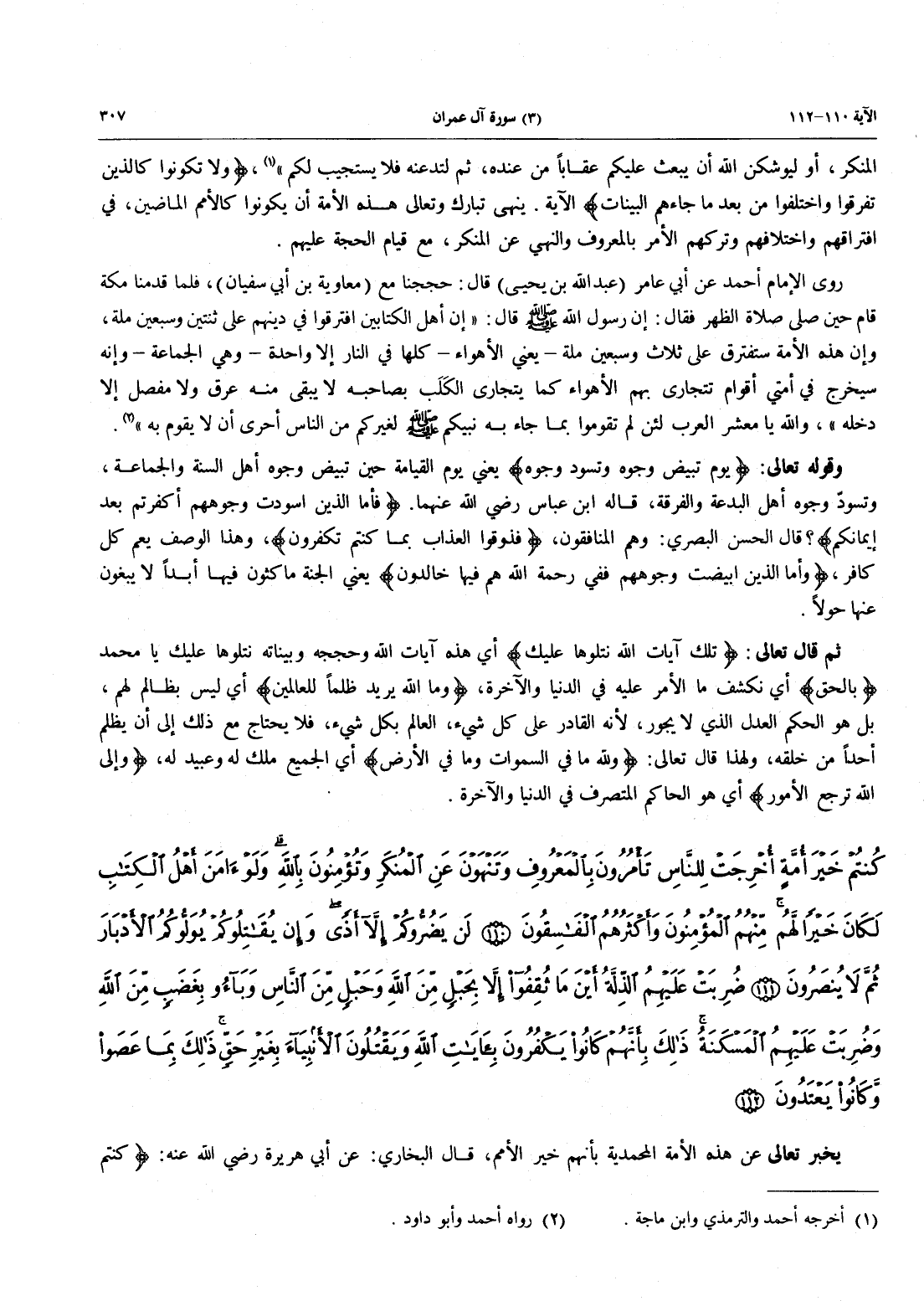 الْمُنْكَرِ، أَوْ لَيُوشِكَنَّ اللَّهُ أَنْ يَبْعَثَ عَلَيْكُمْ عِقَابًا مِنْ عِنْدِهِ ثُمَّ لَتَدْعُنَّهُ فَلَا يَسْتَجِيبُ لكم" (أخرجه أحمد والترمذي وابن ماجة) {وَلاَ تَكُونُواْ كالذين تفروقا واختلفوا مِن بَعْدِ مَا جَآءَهُمُ البينات} الآية. ينهى تبارك وتعالى هذه الأمة أن يكونوا كالأمم الماضين، في افتراقهم وَاخْتِلَافِهِمْ وَتَرْكِهِمُ الْأَمْرَ بِالْمَعْرُوفِ وَالنَّهْيَ عَنِ الْمُنْكَرِ، مع قيام الحجة عليهم.