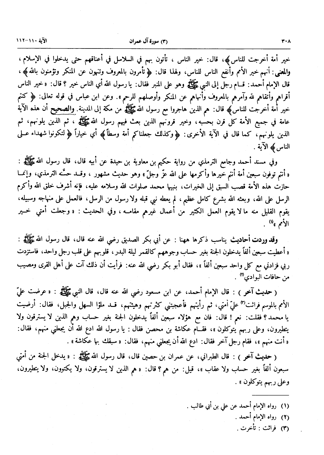 خَيْرَ أُمَّةٍ أُخْرِجَتْ لِلنَّاسِ}، قَالَ: خَيْرَ النَّاسِ، تَأْتُونَ بِهِمْ فِي السَّلَاسِلِ فِي أَعْنَاقِهِمْ حَتَّى يدخلوا في الإسلام، وَالْمَعْنَى: أَنَّهُمْ خَيْرُ الْأُمَمِ وَأَنْفَعُ النَّاسِ لِلنَّاسِ، ولهذا قال: {تَأْمُرُونَ بالمعروف وَتَنْهَوْنَ عن النكر وَتُؤْمِنُونَ بالله}، قال الإمام أحمد: قَامَ رَجُلٌ إِلَى النَّبِيِّ صَلَّى اللَّهُ عَلَيْهِ وَسَلَّمَ وَهُوَ عَلَى الْمِنْبَرِ فَقَالَ: يَا رَسُولَ الله أي الناس خير؟ قال: «خير الناس أقرأهم وَأَتْقَاهُمْ لِلَّهِ وَآمَرُهُمْ بِالْمَعْرُوفِ وَأَنْهَاهُمْ عَنِ الْمُنْكَرِ وَأَوْصَلُهُمْ لِلرَّحِمِ» وعن ابن عباس في قَوْلِهِ تَعَالَى: {كُنْتُمْ خَيْرَ أُمَّةٍ أُخْرِجَتْ لِلنَّاسِ} قَالَ: هُمُ الَّذِينَ هَاجَرُوا مَعَ رَسُولِ اللَّهِ صَلَّى اللَّهُ عَلَيْهِ وَسَلَّمَ مِنْ مَكَّةَ إِلَى المدينة. والصحيح أنه هَذِهِ الْآيَةَ عَامَّةٌ فِي جَمِيعِ الْأُمَّةِ كُلُّ قَرْنٍ بِحَسْبِهِ، وَخَيْرُ قُرُونِهِمُ الَّذِينَ بُعِثَ فِيهِمْ رَسُولُ اللَّهِ صَلَّى اللَّهُ عَلَيْهِ وَسَلَّمَ، ثم الَّذِينَ يَلُونَهُمْ، ثُمَّ الَّذِينَ يَلُونَهُمْ، كَمَا قَالَ فِي الْآيَةِ الْأُخْرَى: وَكَذَلِكَ جَعَلْنَاكُمْ أُمَّةً وَسَطاً} أي خياراً {لِّتَكُونُواْ شُهَدَآءَ عَلَى الناس} الآية.