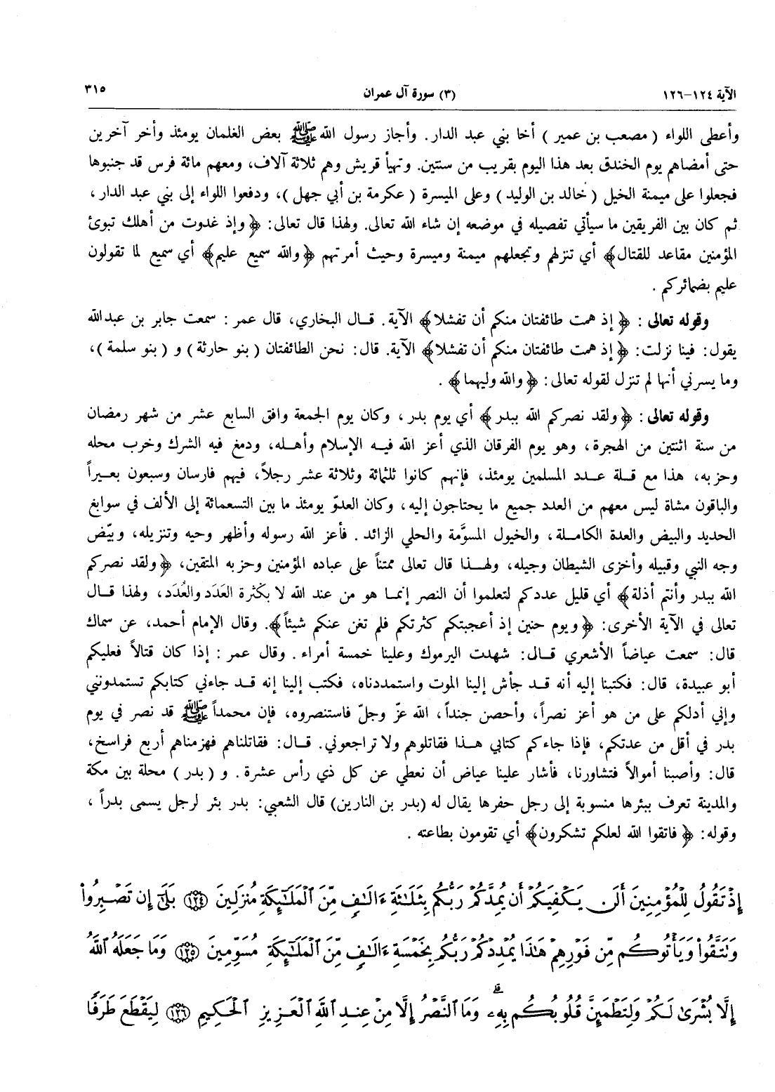 - 124 - إِذْ تَقُولُ لِلْمُؤْمِنِينَ أَلَنْ يَكْفِيكُمْ أَن يُمِدَّكُمْ رَبُّكُمْ بِثَلاَثَةِ آلَافٍ مِنَ الْمَلَائِكَةِ مُنْزَلِينَ