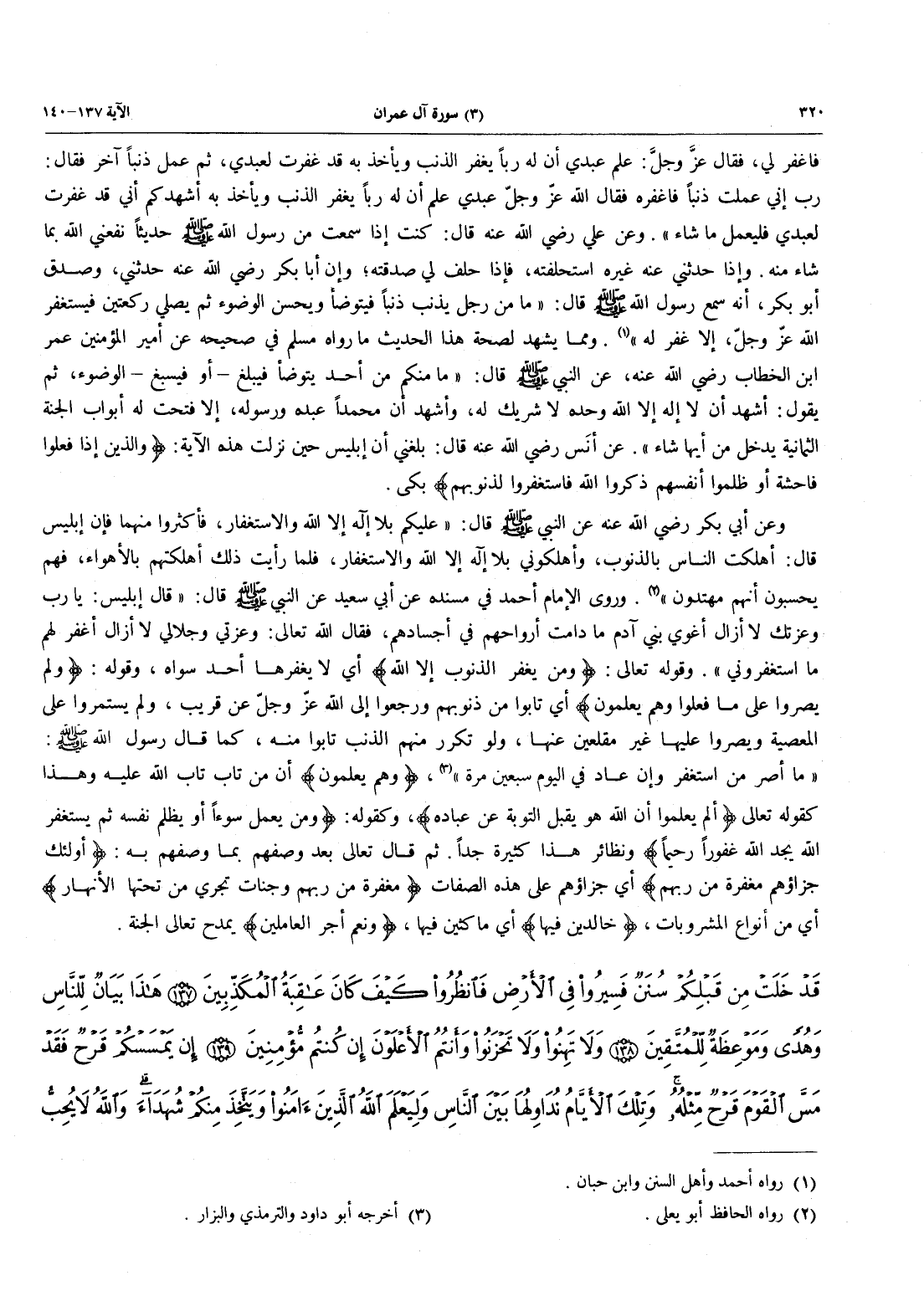 وعن أَبِي بَكْرٍ رَضِيَ اللَّهُ عَنْهُ عَنِ النَّبِيِّ صَلَّى اللَّهُ عَلَيْهِ وَسَلَّمَ قَالَ: "عَلَيْكُمْ بِلَا إِلَهَ إِلَّا اللَّهُ وَالِاسْتِغْفَارِ، فَأَكْثِرُوا مِنْهُمَا فَإِنَّ إِبْلِيسَ قَالَ: أَهْلَكْتُ النَّاسَ بِالذُّنُوبِ، وَأَهْلَكُونِي بِلَا إله إلا الله والاستغفار، فلم رَأَيْتُ ذَلِكَ أَهْلَكْتُهُمْ بِالْأَهْوَاءِ، فَهُمْ يَحْسَبُونَ أَنَّهُمْ مهتدون" (رواه الحافظ أبو يعلى) وروى الإمام أحمد في مسنده عَنْ أَبِي سَعِيدٍ عَنِ النَّبِيِّ صَلَّى اللَّهُ عَلَيْهِ وَسَلَّمَ قَالَ: "قَالَ إِبْلِيسُ: يَا رَبِّ وعزتك لا أزال أغوي بني آدم مَا دَامَتْ أَرْوَاحُهُمْ فِي أَجْسَادِهِمْ، فَقَالَ اللَّهُ تعالى: وَعِزَّتِي وَجَلَالِي لَا أَزَالُ أَغْفِرُ لَهُمْ مَا استغفروني" وقوله تعالى: {وَمَنْ يَغْفِرُ الذُّنُوبَ إِلَّا اللَّهُ} أَيْ لَا يغفرها أحد سواه، وَقَوْلُهُ: {وَلَمْ يُصِرُّواْ عَلَى مَا فَعَلُوا وَهُمْ يَعْلَمُونَ} أَيْ تَابُوا مِنْ ذُنُوبِهِمْ وَرَجَعُوا إِلَى الله عز وجل عَنْ قَرِيبٍ، وَلَمْ يَسْتَمِرُّوا عَلَى الْمَعْصِيَةِ وَيُصِرُّوا عَلَيْهَا غَيْرَ مُقْلِعِينَ عَنْهَا وَلَوْ تَكَرَّرَ مِنْهُمُ الذنب تابوا منه، كَمَا قَالَ رَسُولُ اللَّهِ صَلَّى اللَّهُ عَلَيْهِ وَسَلَّمَ: «مَا أَصَرَّ مَنِ اسْتَغْفَرَ وَإِنْ عَادَ في اليوم سبعين مرة» (أخرجه أبو داود والترمذي والبزار) {وَهُمْ يَعْلَمُونَ} أَنَّ مَنْ تَابَ تَابَ اللَّهُ عَلَيْهِ وَهَذَا كَقَوْلِهِ تَعَالَى {أَلَمْ يَعْلَمُوا أَنَّ اللَّهَ هُوَ يَقْبَلُ التَّوْبَةَ عَنْ عِبَادِهِ} وكقوله: {ومن يعلم سُوءًا أَوْ يَظْلِمْ نَفْسَهُ ثُمَّ يَسْتَغْفِرِ اللَّهَ يَجِدِ الله غَفُوراً رَّحِيماً} ونظائر هذا كثيرة جداً، ثُمَّ قَالَ تَعَالَى بَعْدَ وَصْفِهِمْ بِمَا وَصَفَهُمْ به: {أولئك جَزَآؤُهُمْ مَّغْفِرَةٌ مِّن رَّبِّهِمْ} أَيْ جَزَاؤُهُمْ عَلَى هَذِهِ الصِّفَاتِ {مَّغْفِرَةٌ مِّن رَّبِّهِمْ وَجَنَّاتٌ تَجْرِي مِنْ تَحْتِهَا الْأَنْهَارُ} أَيْ مِنْ أَنْوَاعِ الْمَشْرُوبَاتِ، {خَالِدِينَ فِيهَا} أَيْ مَاكِثِينَ فِيهَا، {وَنِعْمَ أَجْرُ الْعَامِلِينَ} يَمْدَحُ تَعَالَى الْجَنَّةَ.