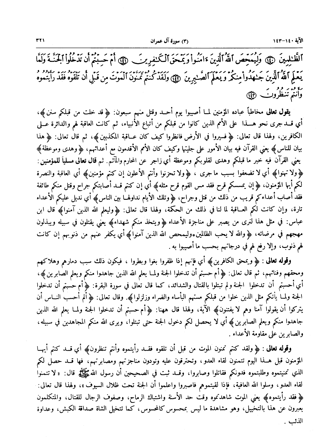 يَقُولُ تَعَالَى مُخَاطِبًا عباده المؤمنين لما أُصِيبُوا يَوْمَ أُحُدٍ وَقُتِلَ مِنْهُمْ سَبْعُونَ: {قَدْ خَلَتْ مِن قَبْلِكُمْ سُنَنٌ}، أَيْ قَدْ جَرَى نَحْوَ هَذَا عَلَى الْأُمَمِ الَّذِينَ كَانُواْ مِن قَبْلِكُمْ مِنْ أَتْبَاعِ الْأَنْبِيَاءِ، ثُمَّ كَانَتِ الْعَاقِبَةُ لهم والدائرة على الكافرين، ولهذا قال تعالى: {فَسِيرُواْ فِي الْأَرْضِ فَانْظُرُوا كَيْفَ كَانَ عَاقِبَةُ المكذبين}، ثم قال تعالى: {هَذَا بَيَانٌ لِّلنَّاسِ} يَعْنِي الْقُرْآنَ فِيهِ بَيَانٌ الأمور عَلَى جَلِيَّتِهَا وَكَيْفَ كَانَ الْأُمَمُ الْأَقْدَمُونَ مَعَ أَعْدَائِهِمْ، {وَهُدًى وَمَوْعِظَةٌ} يَعْنِي الْقُرْآنَ فِيهِ خَبَرُ ما قبلكم وهدى لقلوبكم وموعظة أَيْ زَاجِرٌ عَنِ الْمَحَارِمِ وَالْمَآثِمِ. ثُمَّ قَالَ تعالى مُسَلِّيًا لِلْمُؤْمِنِينَ: {وَلاَ تَهِنُوا} أَيْ لَا تَضْعُفُوا بِسَبَبِ مَا جَرَى، {وَلاَ تَحْزَنُوا وَأَنْتُمُ الأَعْلَوْنَ إِنْ كُنْتُمْ مُؤْمِنِينَ} أَيِ الْعَاقِبَةُ وَالنُّصْرَةُ لَكُمْ أَيُّهَا الْمُؤْمِنُونَ، {إِنْ يَمْسَسْكُمْ قَرْحٌ فَقَدْ مَسَّ الْقَوْمَ قَرْحٌ مِّثْلُهُ} أَيْ إِنْ كُنْتُمْ قَدْ أصبتكم جراح وقتل منكم طائفة فقد أصاب أعدائكم قَرِيبٌ مِنْ ذَلِكَ مِنْ قَتْلٍ وَجِرَاحٍ، {وَتِلْكَ الْأَيَّامُ نُدَاوِلُهَا بَيْنَ النَّاسِ} أَيْ نُدِيلُ عَلَيْكُمُ الأعداء تارة، وإن كانت لكم العاقبة لما لنا في ذلك من الحكمة، وَلِهَذَا قَالَ تَعَالَى: {وَلِيَعْلَمَ اللَّهُ الَّذِينَ آمَنُواْ} قَالَ ابْنُ عَبَّاسٍ: فِي مِثْلِ هَذَا لِنَرَى مَنْ يَصْبِرُ عَلَى مُنَاجَزَةِ الْأَعْدَاءِ {وَيَتَّخِذَ مِنكُمْ شُهَدَآءَ} يَعْنِي يُقْتَلُونَ فِي سَبِيلِهِ وَيَبْذُلُونَ مُهَجَهُمْ فِي مَرْضَاتِهِ، {وَاللَّهُ لاَ يُحِبُّ الظَّالِمِينَ* وَلِيُمَحِّصَ اللَّهُ الَّذِينَ آمَنُواْ} أَيْ يكفِّر عَنْهُمْ مِنْ ذنوبهم إن كانت لَهُمْ ذُنُوبٌ، وَإِلَّا رُفِعَ لَهُمْ فِي دَرَجَاتِهِمْ بحسب ما أصيبوا به.