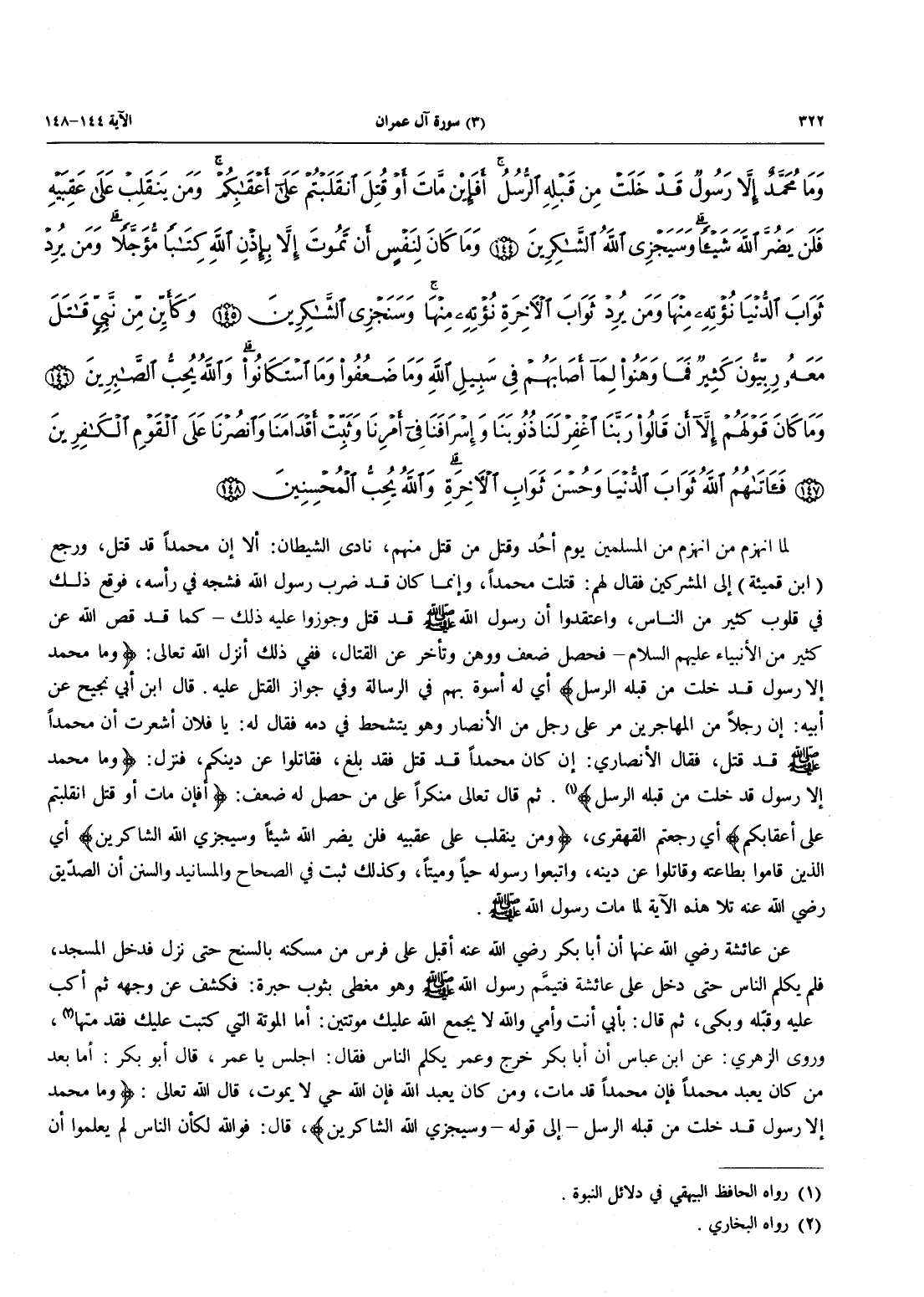 لَمَّا انْهَزَمَ مَنِ انْهَزَمَ مِنَ الْمُسْلِمِينَ يَوْمَ أحُد وَقُتِلَ مَنْ قُتِلَ مِنْهُمْ، نَادَى الشَّيْطَانُ: أَلَا إِنَّ مُحَمَّدًا قَدْ قُتِلَ، وَرَجَعَ (ابْنُ قَمِيئَةَ) إِلَى الْمُشْرِكِينَ فَقَالَ لَهُمْ: قَتَلْتُ مُحَمَّدًا، وَإِنَّمَا كَانَ قَدْ ضَرَبَ رسول الله فَشَجَّهُ فِي رَأْسِهِ، فَوَقَعَ ذَلِكَ فِي قُلُوبِ كَثِيرٍ مِنَ النَّاسِ، وَاعْتَقَدُوا أَنَّ رَسُولَ اللَّهِ صلى الله عليه وسلم قَدْ قُتِلَ وَجَوَّزُوا عَلَيْهِ ذَلِكَ - كَمَا قَدْ قَصَّ اللَّهُ عَنْ كَثِيرٍ مِنَ الْأَنْبِيَاءِ عَلَيْهِمُ السلام - فحصل ضعف ووهن وَتَأَخُّرٌ عَنِ الْقِتَالِ، فَفِي ذَلِكَ أَنْزَلَ اللَّهُ تَعَالَى: {وَمَا مُحَمَّدٌ إِلاَّ رَسُولٌ قَدْ خَلَتْ مِن قَبْلِهِ الرُّسُلُ} أَيْ لَهُ أُسْوَةٌ بِهِمْ فِي الرِّسَالَةِ وَفِي جَوَازِ الْقَتْلِ عَلَيْهِ. قَالَ ابْنُ أَبِي نَجِيحٍ عَنْ أَبِيهِ: أَنَّ رَجُلًا مِنَ الْمُهَاجِرِينَ مَرَّ عَلَى رَجُلٍ مِنَ الْأَنْصَارِ وَهُوَ يَتَشَحَّطُ فِي دَمِهِ فَقَالَ لَهُ: يَا فُلَانُ أَشَعَرْتَ أَنَّ مُحَمَّدًا صَلَّى اللَّهُ عَلَيْهِ وَسَلَّمَ قَدْ قُتِلَ، فَقَالَ الْأَنْصَارِيُّ: إِنْ كَانَ محمداً قَدْ قُتِلَ فَقَدْ بلَّغ، فَقَاتِلُوا عَنْ دِينِكُمْ، فنزل: {وَمَا مُحَمَّدٌ إِلاَّ رسول فقد خَلَتْ مِن قَبْلِهِ الرسل} (رواه الحافظ الْبَيْهَقِيُّ فِي دَلَائِلِ النُّبُوَّةِ) ثُمَّ قَالَ تَعَالَى مُنْكِرًا عَلَى مَنْ حَصَلَ لَهُ ضَعْفٌ: {أَفإِنْ مَّاتَ أَوْ قُتِلَ انْقَلَبْتُمْ عَلَى أَعْقَابِكُمْ} أَيْ رَجَعْتُمُ الْقَهْقَرَى، {وَمَن يَنقَلِبْ عَلَى عَقِبَيْهِ فَلَن يَضُرَّ اللَّهَ شَيْئاً وَسَيَجْزِي اللَّهُ الشَّاكِرِينَ} أَيِ الَّذِينَ قَامُوا بِطَاعَتِهِ وَقَاتَلُوا عَنْ دِينِهِ، وَاتَّبَعُوا رَسُولَهُ حَيًّا وَمَيِّتًا، وَكَذَلِكَ ثَبَتَ فِي الصِّحَاحِ والمسانيد والسنن أن الصدّيق رضي الله عنه تلاهذه الْآيَةَ لَمَّا مَاتَ رَسُولُ اللَّهِ صَلَّى اللَّهُ عَلَيْهِ وَسَلَّمَ.