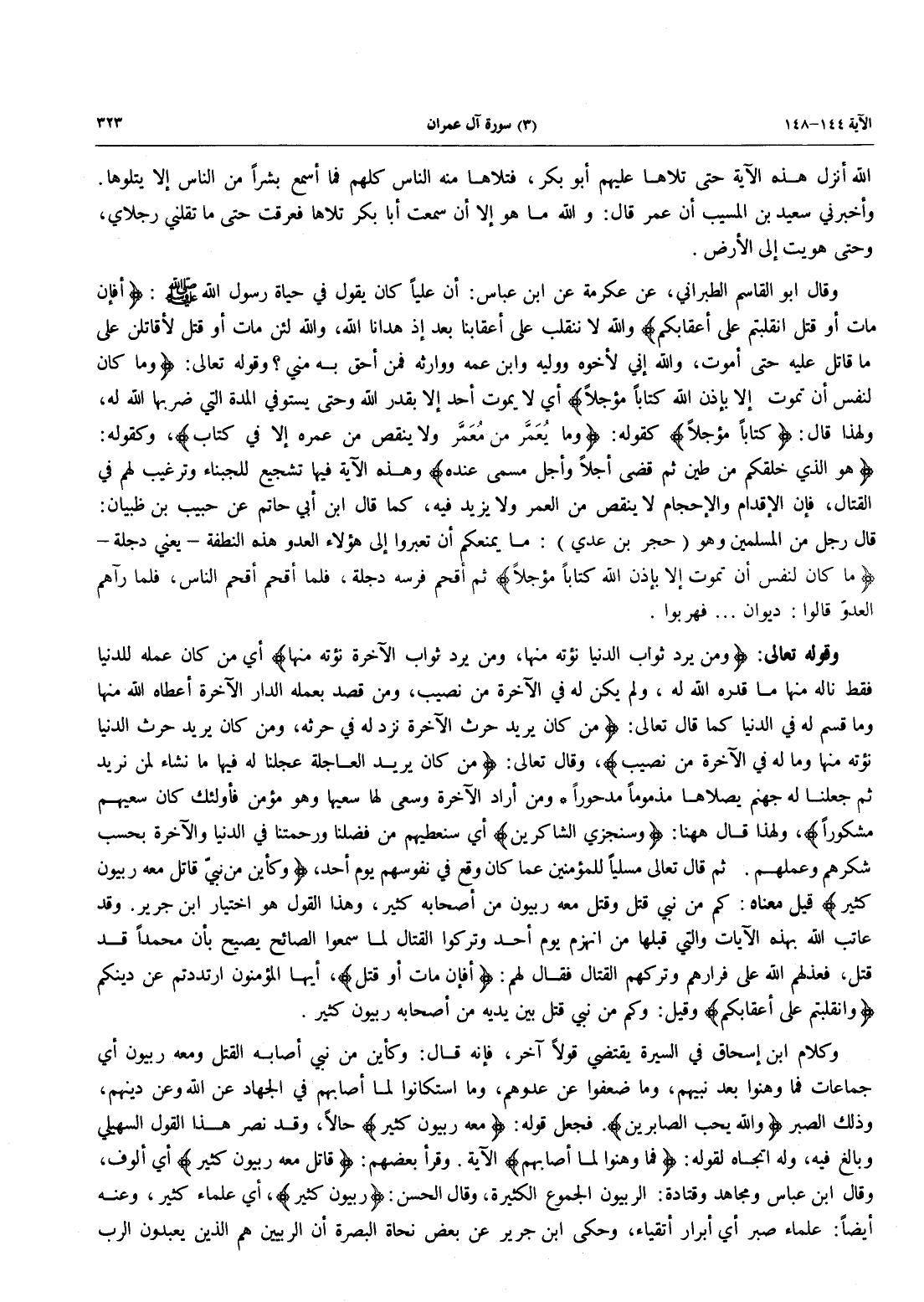 وقال أبو القاسم الطبراني، عَنْ عِكْرِمَةَ عَنِ ابْنِ عَبَّاسٍ: أَنَّ عَلِيًّا كان يقول فِي حَيَاةِ رَسُولِ اللَّهِ صَلَّى اللَّهُ عَلَيْهِ وسلم: {أَفإِنْ مَّاتَ أَوْ قُتِلَ انْقَلَبْتُمْ عَلَى أَعْقَابِكُمْ} والله لا ننقلب على أعقابنا عبد إذا هَدَانَا اللَّهُ، وَاللَّهُ لَئِنْ مَاتَ أَوْ قُتِلَ لَأُقَاتِلَنَّ عَلَى مَا قَاتَلَ عَلَيْهِ حَتَّى أَمُوتَ، وَاللَّهِ إِنِّي لَأَخُوهُ وَوَلِيُّهُ وَابْنُ عَمِّهِ وَوَارِثُهُ فم أحق به مني؟ وقوله تعالى: {وما كَانَ لِنَفْسٍ أَنْ تموت إلا ذبإذن اللَّهِ كِتَاباً مُّؤَجَّلاً} أَيْ لَا يَمُوتُ أَحَدٌ إِلَّا بِقَدَرِ اللَّهِ وَحَتَّى يَسْتَوْفِيَ الْمُدَّةَ الَّتِي ضَرَبَهَا اللَّهُ لَهُ، وَلِهَذَا قَالَ: {كِتَاباً مُّؤَجَّلاً} كَقَوْلِهِ: {وَمَا يُعَمَّر مِن مُعَمَّرٍ وَلاَ يُنقَصُ مِنْ عُمُرِهِ إِلاَّ فِي كِتَابٍ}، وَكَقَوْلِهِ: {هُوَ الَّذِي خَلَقَكُمْ مِّن طِينٍ ثُمَّ قَضَى أَجَلاً وَأَجَلٌ مُّسَمًّى عِندَهُ} وَهَذِهِ الْآيَةُ فِيهَا تَشْجِيعٌ لِلْجُبَنَاءِ وَتَرْغِيبٌ لَهُمْ في القتال، فإن الإقدام الإحجام لَا يَنْقُصُ مِنَ الْعُمُرِ وَلَا يَزِيدُ فِيهِ، كما قال ابن أبي حاتم عن حبيب بن ظبيان: قَالَ رَجُلٌ مِنَ الْمُسْلِمِينَ وَهُوَ (حُجْرُ بْنُ عَدِيٍّ): مَا يَمْنَعُكُمْ أَنْ تَعْبُرُوا إِلَى هَؤُلَاءِ العدو هذه النطفة - يعني دجلة - {ما كَانَ لِنَفْسٍ أَنْ تَمُوتَ إِلاَّ بِإِذْنِ اللَّهِ كِتَاباً مُّؤَجَّلاً} ثُمَّ أَقْحَمَ فَرَسَهُ دِجْلَةَ، فَلَمَّا أَقْحَمَ أَقْحَمَ النَّاسُ، فَلَمَّا رَآهُمُ الْعَدُوُّ قَالُوا: ديوان ... فهربوا.