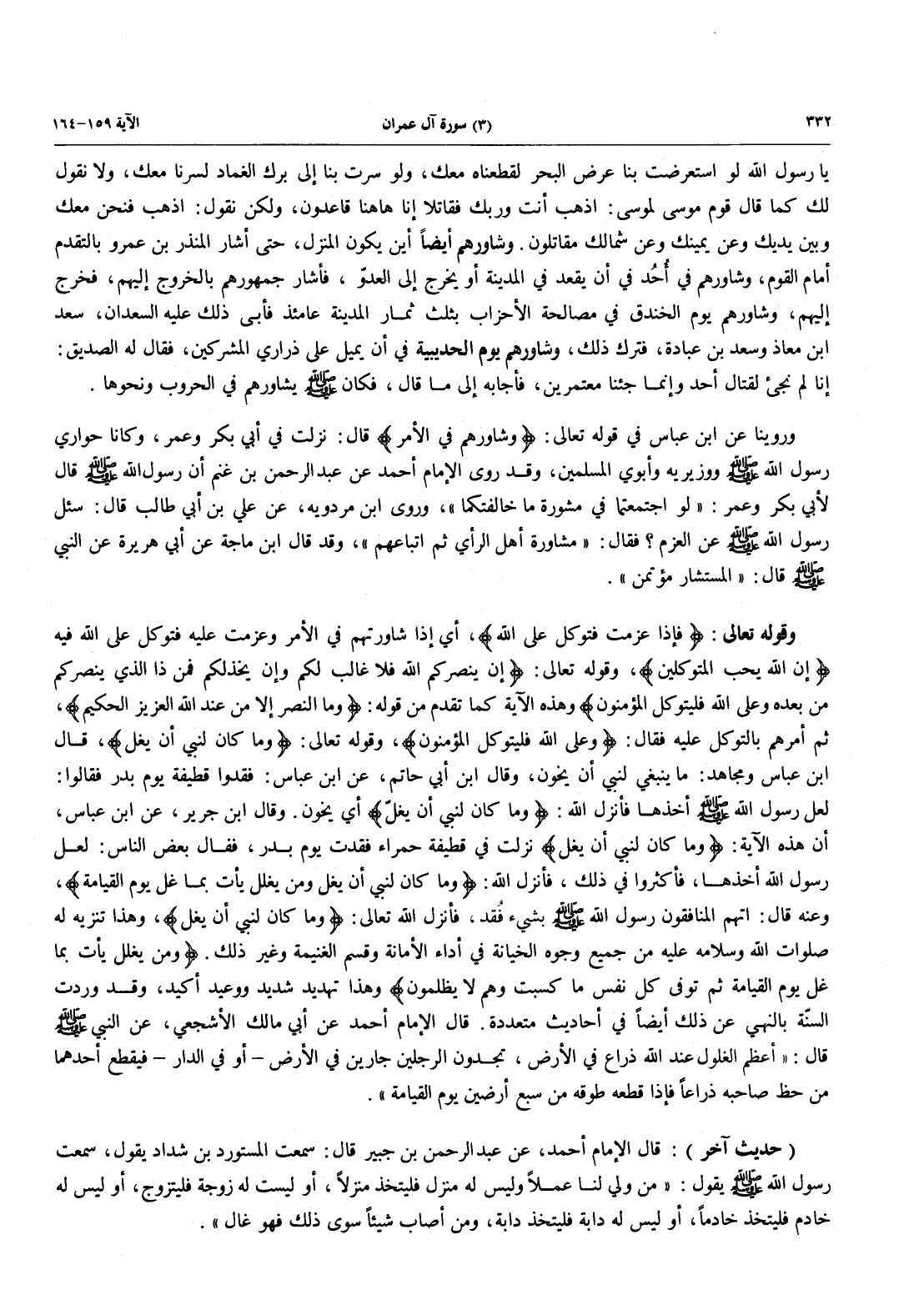 وقوله تعالى: {فَإِذَا عَزَمْتَ فَتَوَكَّلْ عَلَى اللَّهِ}، أَيْ إِذَا شَاوَرْتَهُمْ فِي الْأَمْرِ وَعَزَمْتَ عَلَيْهِ فَتَوَكَّلْ عَلَى اللَّهِ فِيهِ {إِنَّ اللَّهَ يُحِبُّ الْمُتَوَكِّلِينَ}، وَقَوْلُهُ تعالى: {إِن يَنصُرْكُمُ اللَّهُ فَلاَ غَالِبَ لَكُمْ وَإِن يَخْذُلْكُمْ فَمَن ذَا الَّذِي يَنصُرُكُم مِّنْ بَعْدِهِ وَعَلَى الله فَلْيَتَوَكَّلِ المؤمنون} وهذه الآية كَمَا تَقَدَّمَ مِنْ قَوْلِهِ: {وَمَا النَّصْرُ إِلاَّ من عند الله العزيز الحكيم}، ثُمَّ أَمَرَهُمْ بِالتَّوَكُّلِ عَلَيْهِ فَقَالَ: {وَعَلَى اللَّهِ فَلْيَتَوَكَّلِ المؤمنون}، وقوله تعالى: {وَمَا كَانَ لِنَبِيٍّ أَنْ يَغُلَّ}، قَالَ ابْنُ عباس ومجاهد: مَا يَنْبَغِي لِنَبِيٍّ أَنْ يَخُونَ، وَقَالَ ابْنُ أبي حاتم، عن ابن عباس: فَقَدُوا قَطِيفَةً يَوْمَ بَدْرٍ فَقَالُوا: لَعَلَّ رَسُولَ اللَّهِ صَلَّى اللَّهُ عَلَيْهِ وَسَلَّمَ أَخَذَهَا فَأَنْزَلَ اللَّهُ: {وَمَا كَانَ لِنَبِيٍّ أَنْ يَغُلَّ} أَيْ يخون. وقال ابن جرير، عن ابن عباسن أَنَّ هَذِهِ الْآيَةَ: {وَمَا كَانَ لِنَبِيٍّ أَنْ يَغُلَّ} نَزَلَتْ فِي قَطِيفَةٍ حَمْرَاءَ فُقِدَتْ يَوْمَ بدر، فقال بعض الناس: لعل رسول الله أخذها، فَأَكْثَرُوا فِي ذَلِكَ، فَأَنْزَلَ اللَّهُ: {وَمَا كَانَ لِنَبِيٍّ أَنْ يَغُلَّ وَمَن يَغْلُلْ يَأْتِ بِمَا غَلَّ يَوْمَ الْقِيَامَةِ}، وعنه قَالَ: اتَّهَمَ الْمُنَافِقُونَ رَسُولَ اللَّهِ صَلَّى اللَّهُ عَلَيْهِ وَسَلَّمَ بِشَيْءٍ فُقد، فأنزل الله تعالى: {وما كَانَ لِنَبِيٍّ أَن يَغُلَّ} وهذا تنزيه له صلوات الله وسلامه عليه من جَمِيعِ وُجُوهِ الْخِيَانَةِ فِي أَدَاءِ الْأَمَانَةِ وَقَسْمِ الغنيمة وغير ذلك {وَمَن يَغْلُلْ يَأْتِ بِمَا غَلَّ يَوْمَ الْقِيَامَةِ ثُمَّ تُوَفَّى كُلُّ نَفْسٍ مَّا كَسَبَتْ وَهُمْ لاَ يُظْلَمُونَ}، وَهَذَا تَهْدِيدٌ شَدِيدٌ وَوَعِيدٌ أَكِيدٌ، وَقَدْ وَرَدَتِ السُّنَّةُ بِالنَّهْيِ عَنْ ذَلِكَ أَيْضًا في أحاديث متعددة. قال الإمام أحمد عن أبي مالك الأشجعي، عَنِ النَّبِيِّ صَلَّى اللَّهُ عَلَيْهِ وَسَلَّمَ قَالَ: «أعظم الغلول عند الله ذراع في الْأَرْضِ، تَجِدُونَ الرَّجُلَيْنِ جَارَيْنِ فِي الْأَرْضِ - أَوْ فِي الدَّارِ - فَيَقْطَعُ أَحَدُهُمَا مِنْ حَظِّ صِاحِبِهِ ذراعاً فإذا قطعه طوّقه من سبع أرضين يوم القيامة».