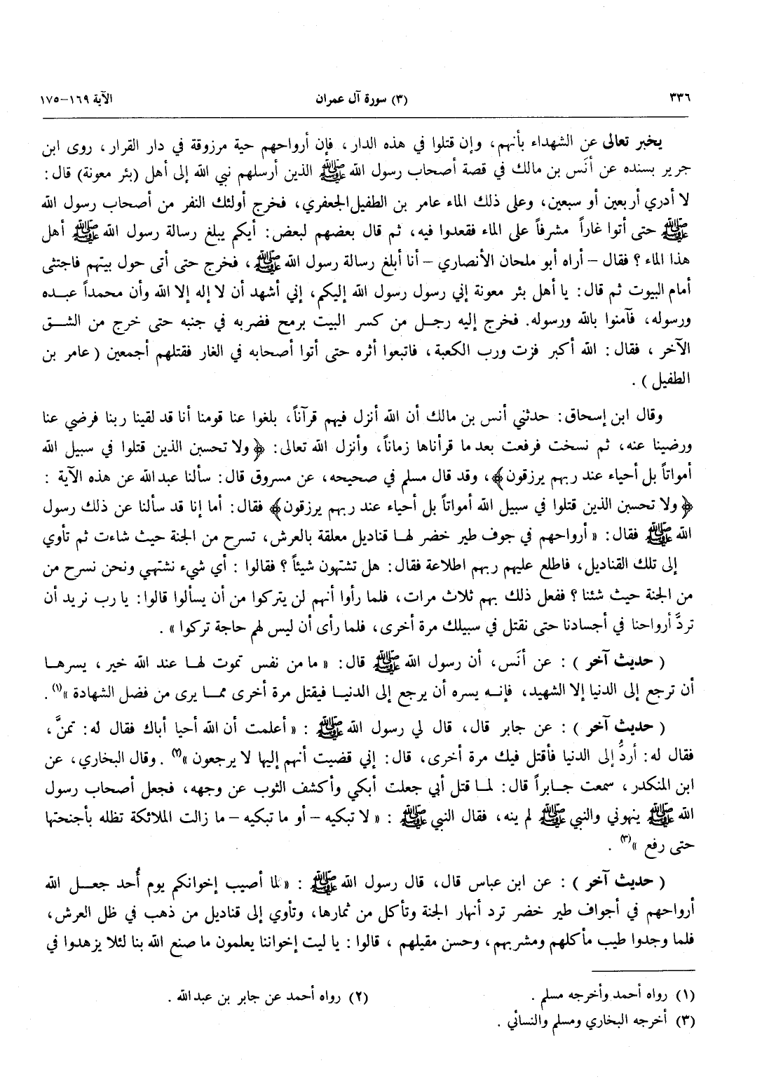 يُخْبِرُ تَعَالَى عَنِ الشُّهَدَاءِ بِأَنَّهُمْ، وَإِنْ قُتِلُوا فِي هَذِهِ الدَّارِ فَإِنَّ أَرْوَاحَهُمْ حَيَّةٌ مَرْزُوقَةٌ في دار القرار، روى ابن جرير بسنده عن أنَس بن مالك في قصة أصحاب رسول الله صلى الله عليه وسلم الذين أرسلهم نبي الله إلى أهل (بئر بعونة) قَالَ: لَا أَدْرِي أَرْبَعِينَ أَوْ سَبْعِينَ، وَعَلَى ذَلِكَ الْمَاءِ عَامِرُ بْنُ الطُّفَيْلِ الْجَعْفَرِيُّ، فَخَرَجَ أُولَئِكَ النَّفَرُ مِنْ أَصْحَابِ رَسُولِ اللَّهِ صَلَّى اللَّهُ عَلَيْهِ وسلم حتى أتو غَارًا مُشْرِفًا عَلَى الْمَاءِ فَقَعَدُوا فِيهِ، ثُمَّ قَالَ بَعْضُهُمْ لِبَعْضٍ: أَيُّكُمْ يُبَلِّغُ رِسَالَةَ رَسُولِ اللَّهِ صَلَّى اللَّهُ عَلَيْهِ وَسَلَّمَ أَهْلَ هَذَا الماء؟ فقال - اراه أبو مِلْحَانَ الْأَنْصَارِيَّ - أَنَا أُبَلِّغُ رِسَالَةَ رَسُولِ اللَّهِ صَلَّى اللَّهُ عَلَيْهِ وَسَلَّمَ، فَخَرَجَ حَتَّى أَتَى حول بيتهم فاجتثى أَمَامَ الْبُيُوتِ ثُمَّ قَالَ: يَا أَهْلَ بِئْرِ مَعُونَةَ إِنِّي رَسُولُ رَسُولِ اللَّهِ إِلَيْكُمْ، إِنِّي أَشْهَدُ أَنْ لَا إِلَهَ إِلَّا اللَّهُ وَأَنَّ مُحَمَّدًا عَبْدُهُ وَرَسُولُهُ فَآمِنُواْ بِاللَّهِ وَرَسُولِهِ فَخَرَجَ إليه رجل من كسر البيت برمح فضربه فِي جَنْبِهِ حَتَّى خَرَجَ مِنَ الشِّقِّ الْآخَرِ، فَقَالَ: اللَّهُ أَكْبَرُ فُزْتُ وَرَبِّ الْكَعْبَةِ، فَاتَّبَعُوا أثره حتى أتو أصحابه في الغار فقتلهم أجميعن (عامر بن الطفيل).