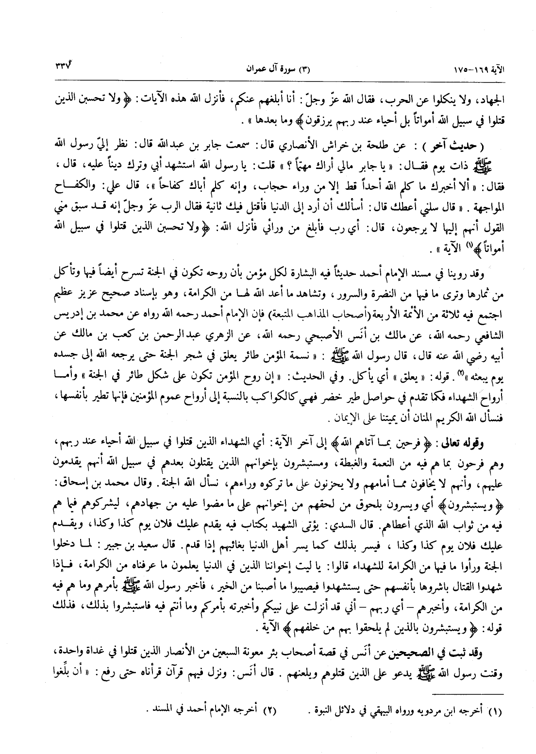(حديث آخر): عن طلحة بن خراش الْأَنْصَارِيَّ قَالَ: سَمِعْتُ جَابِرَ بْنَ عَبْدِ اللَّهِ قَالَ: نَظَرَ إِلَيَّ رَسُولُ اللَّهِ صَلَّى اللَّهُ عَلَيْهِ وَسَلَّمَ ذَاتَ يَوْمٍ فَقَالَ: «يَا جَابِرُ مالي أراك مهتماً؟» قُلْتُ يَا رَسُولَ اللَّهِ اسْتُشْهِدَ أَبِي وَتَرَكَ ديناً عليه، قَالَ، فَقَالَ: «أَلَا أُخْبِرُكَ مَا كَلَّمَ اللَّهُ أَحَدًا قَطُّ إِلَّا مِنْ وَرَاءِ حِجَابٍ، وَإِنَّهُ كلَّم أَبَاكَ كفاحاً»، قال علي: والكفاح المواجهة؟ "قال سَلْنِي أُعْطِكَ قَالَ: أَسْأَلُكَ أَنْ أُرَدَّ إِلَى الدُّنْيَا فَأُقْتَلَ فِيْكَ ثَانِيَةً فَقَالَ الرَّبُّ عزَّ وجلَّ أنه قد سَبَقَ مِنِّي الْقَوْلُ أَنَّهُمْ إِلَيْهَا لَا يُرْجَعُونَ، قَالَ: أَيْ رَبِّ فَأَبْلِغْ مَنْ وَرَائِي فَأَنْزَلَ اللَّهُ: {وَلاَ تَحْسَبَنَّ الَّذِينَ قُتِلُواْ فِي سَبِيلِ اللَّهِ أمواتاً} (أخرجه ابن مردويه ورواه البهيقي في دلائل النبوة) الآية".