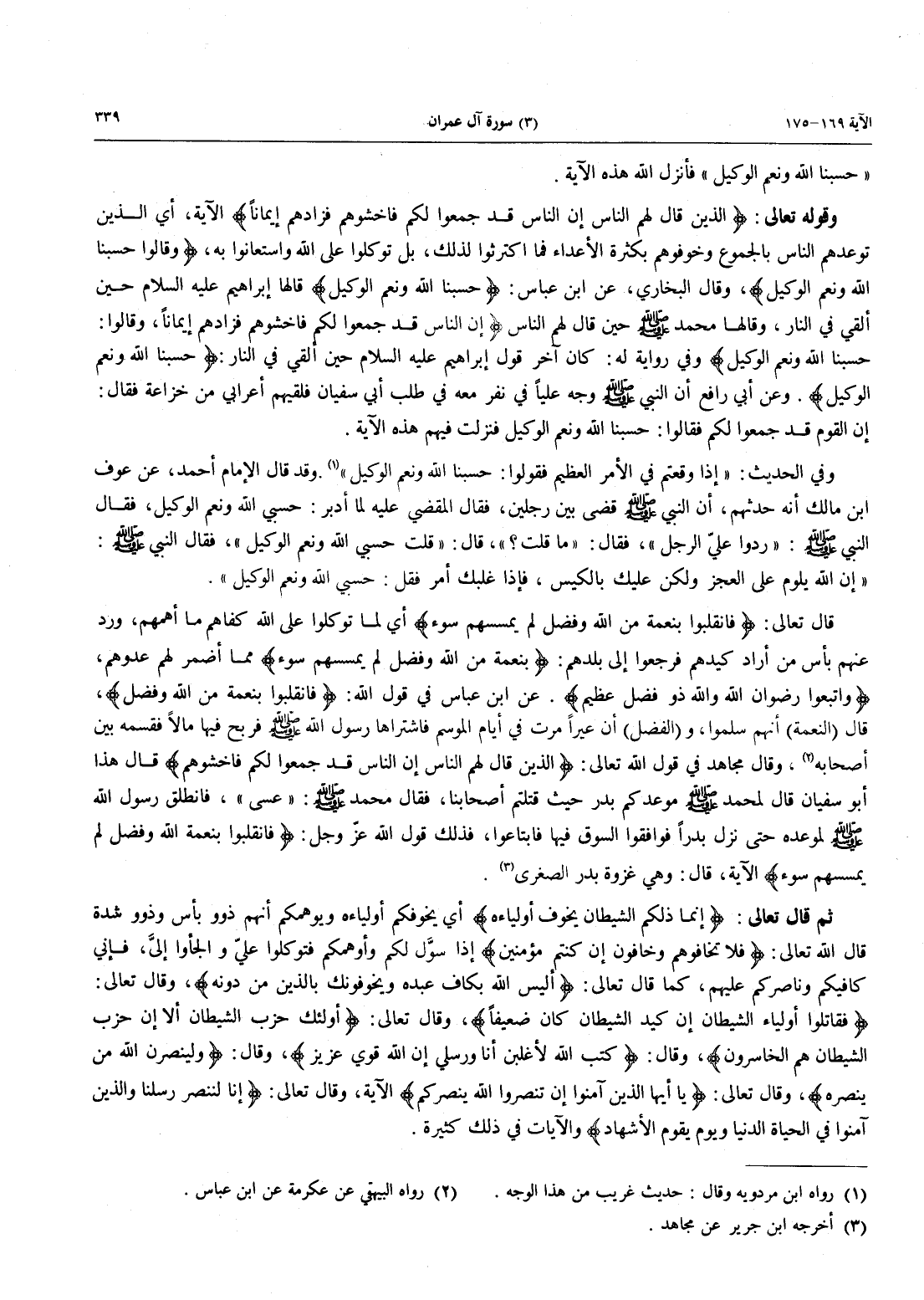 وقوله تعالى: {الَّذِينَ قَالَ لَهُمُ النَّاسُ إِنَّ النَّاسَ قَدْ جَمَعُواْ لَكُمْ فَاخْشَوْهُمْ فَزَادَهُمْ إِيمَاناً} الآية، أَيِ الَّذِينَ تَوَعَّدَهُمُ النَّاسُ بِالْجُمُوعِ وَخَوَّفُوهُمْ بِكَثْرَةِ الْأَعْدَاءِ فَمَا اكْتَرَثُوا لِذَلِكَ، بَلْ تَوَكَّلُوا عَلَى الله واستعانوا به، {وَقَالُواْ حَسْبُنَا الله نعم الوكيل}، وقال البخاري، عَنِ ابْنِ عَبَّاسٍ: {حَسْبُنَا اللَّهُ وَنِعْمَ الْوَكِيلُ} قَالَهَا إِبْرَاهِيمُ عَلَيْهِ السَّلَامُ حِينَ أُلْقِيَ فِي النَّارِ، وَقَالَهَا مُحَمَّدٌ صَلَّى اللَّهُ عَلَيْهِ وَسَلَّمَ حين قَالَ لَهُمُ النَّاسُ {إِنَّ النَّاسَ قَدْ جَمَعُواْ لَكُمْ فَاخْشَوْهُمْ فَزَادَهُمْ إِيمَاناً، وَقَالُواْ: حَسْبُنَا اللَّهُ وَنِعْمَ الوكيل} وفي رواية له: كَانَ آخِرَ قَوْلِ إِبْرَاهِيمَ عَلَيْهِ السَّلَامُ حِينَ ألقي في الناس: {حسبنا الله ونعم الوكيل} وعن أَبِي رَافِعٍ أَنَّ النَّبِيَّ صَلَّى اللَّهُ عَلَيْهِ وَسَلَّمَ وَجَّهَ عَلِيًّا فِي نَفَرٍ مَعَهُ فِي طَلَبِ أَبِي سُفْيَانَ فَلَقِيَهُمْ أَعْرَابِيٌّ مَنْ خُزَاعَةَ فقال: أن القوم قَدْ جَمَعُواْ لَكُمْ فقالوا: حَسْبُنَا اللَّهُ وَنِعْمَ الْوَكِيلُ فَنَزَلَتْ فِيهِمْ هَذِهِ الآية.