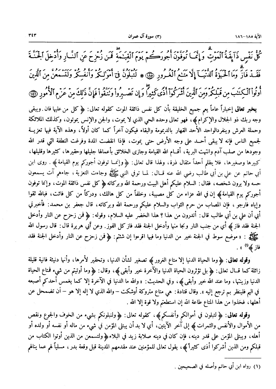 يُخْبِرُ تَعَالَى إِخْبَارًا عَامًّا يَعُمُّ جَمِيعَ الْخَلِيقَةِ بِأَنَّ كُلُّ نَفْسٍ ذَآئِقَةُ الموت كقوله تَعَالَى: {كُلُّ مَنْ عَلَيْهَا فَانٍ. وَيَبْقَى وَجْهُ رَبِّكَ ذُو الجلال والإكرام}، فهو تعالى وحده الحي الذي لا يموت، والجن والإنس يَمُوتُونَ، وَكَذَلِكَ الْمَلَائِكَةُ وَحَمَلَةُ الْعَرْشِ وَيَنْفَرِدُ الْوَاحِدُ الْأَحَدُ الْقَهَّارُ بِالدَّيْمُومَةِ وَالْبَقَاءِ فَيَكُونُ آخِرًا كَمَا كَانَ أَوَّلًا، وَهَذِهِ الْآيَةُ فِيهَا تَعْزِيَةٌ لِجَمِيعِ النَّاسِ فَإِنَّهُ لَا يَبْقَى أَحَدٌ عَلَى وَجْهِ الْأَرْضِ حَتَّى يَمُوتَ، فَإِذَا انْقَضَتِ الْمُدَّةُ وَفَرَغَتِ النُّطْفَةُ الَّتِي قَدَّرَ اللَّهُ وُجُودَهَا مِنْ صُلْبِ آدَمَ وَانْتَهَتِ الْبَرِيَّةُ، أَقَامَ اللَّهُ الْقِيَامَةَ وَجَازَى الْخَلَائِقَ بِأَعْمَالِهَا جَلِيلِهَا وَحَقِيرِهَا، كَثِيرِهَا وَقَلِيلِهَا، كَبِيرِهَا وَصَغِيرِهَا. فَلَا يَظْلِمُ أَحَدًا مِثْقَالَ ذَرَّةٍ، وَلِهَذَا قال تعالى: {وَإِنَّمَا تُوَفَّوْنَ أُجُورَكُمْ يَوْمَ الْقِيَامَةِ}، وَرَوَى ابْنُ أَبِي حَاتِمٍ عَنْ عَلِيِّ بْنِ أَبِي طَالِبٍ رَضِيَ اللَّهُ عَنْهُ قَالَ: لَمَّا تُوُفِّيَ النَّبِيُّ صَلَّى اللَّهُ عَلَيْهِ وَسَلَّمَ وَجَاءَتِ التَّعْزِيَةُ، جَاءَهُمْ آتٍ يَسْمَعُونَ حِسَّهُ وَلَا يَرَوْنَ شَخْصَهُ، فَقَالَ: السَّلَامُ عَلَيْكُمْ أَهْلَ الْبَيْتِ وَرَحْمَةُ اللَّهِ وَبَرَكَاتُهُ {كُلُّ نَفْسٍ ذَآئِقَةُ الْمَوْتِ، وَإِنَّمَا تُوَفَّوْنَ أُجُورَكُمْ يَوْمَ الْقِيَامَةِ} أي فِي اللَّهِ عَزَاءً مِنْ كُلِّ مُصِيبَةٍ، وَخَلَفًا من كل هالك، دركاً من كل فائت، فبالله ثقوا وإياه فارجو، فَإِنَّ الْمُصَابَ مَنْ حُرِمَ الثَّوَابَ وَالسَّلَامُ عَلَيْكُمْ وَرَحْمَةُ اللَّهِ وَبَرَكَاتُهُ، قَالَ جَعْفَرُ بْنُ مُحَمَّدٍ: فَأَخْبَرَنِي أَبِي أَنَّ عَلِيَّ بْنَ أَبِي طَالِبٍ قَالَ: أَتَدْرُونَ مَنْ هَذَا؟ هَذَا الْخَضِرُ عَلَيْهِ السَّلَامُ، وَقَوْلُهُ: {فَمَن زُحْزِحَ عَنِ النَّارِ وَأُدْخِلَ الْجَنَّةَ فَقَدْ فَازَ} أَيْ مَنْ جُنِّبَ النَّارَ وَنَجَا مِنْهَا وَأُدْخِلَ الْجَنَّةَ فَقَدْ فَازَ كُلَّ الفوز. وَعَنْ أَبِي هُرَيْرَةَ قَالَ: قَالَ رَسُولُ اللَّهِ صَلَّى اللَّهُ عَلَيْهِ وَسَلَّمَ: "مَوْضِعُ سَوْطٍ فِي الْجَنَّةِ خَيْرٌ مِنَ الدُّنْيَا وَمَا فِيهَا اقْرَءُوا إِنْ شِئْتُمَ: {فَمَن زُحْزِحَ عَنِ النَّارِ وَأُدْخِلَ الْجَنَّةَ فَقَدْ فاز} (رواه ابن أبي حاتم وأصله في الصحيحين) ".