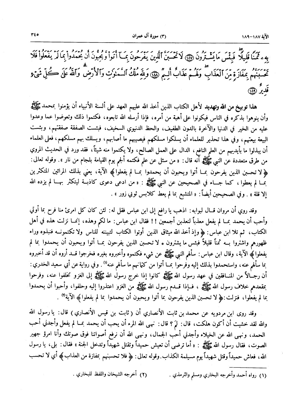 هَذَا تَوْبِيخٌ مِنَ اللَّهِ وَتَهْدِيدٌ لِأَهْلِ الْكِتَابِ الذين أخذ الله عَلَيْهِمُ الْعَهْدَ عَلَى أَلْسِنَةِ الْأَنْبِيَاءِ أَنْ يُؤْمِنُوا بِمُحَمَّدٍ صَلَّى اللَّهُ عَلَيْهِ وَسَلَّمَ وَأَنْ يُنَوِّهُوا بذكره في الناس فيكونوا عَلَى أُهْبَةٍ مِنْ أَمْرِهِ، فَإِذَا أَرْسَلَهُ اللَّهُ تَابَعُوهُ، فَكَتَمُوا ذَلِكَ وَتَعَوَّضُوا عَمَّا وَعَدُوا عَلَيْهِ مِنَ الْخَيْرِ فِي الدُّنْيَا وَالْآخِرَةِ بِالدُّونِ الطَّفِيفِ، والحظ الدنيوي السخيف، فبئس الصَّفْقَةُ صَفْقَتُهُمْ، وَبِئْسَتِ الْبَيْعَةُ بَيْعَتُهُمْ، وَفِي هَذَا تَحْذِيرٌ لِلْعُلَمَاءِ أَنْ يَسْلُكُوا مَسْلَكَهُمْ فَيُصِيبَهُمْ مَا أَصَابَهُمْ، وَيُسْلَكَ بِهِمْ مَسْلَكُهُمْ، فَعَلَى الْعُلَمَاءِ أَنْ يَبْذُلُوا مَا بِأَيْدِيهِمْ مِنَ الْعِلْمِ النَّافِعِ، الدَّالِّ عَلَى الْعَمَلِ الصَّالِحِ، وَلَا يَكْتُمُوا مِنْهُ شَيْئًا، فَقَدْ وَرَدَ فِي الْحَدِيثِ الْمَرْوِيِّ مِنْ طُرُقٍ مُتَعَدِّدَةٍ عَنِ النَّبِيِّ صَلَّى اللَّهُ عَلَيْهِ وَسَلَّمَ أَنَّهُ قَالَ: «مَنْ سُئِلَ عَنْ عِلْمٍ فَكَتَمَهُ أُلْجِمَ يَوْمَ الْقِيَامَةِ بِلِجَامٍ مِنْ نَارٍ» وَقَوْلُهُ تَعَالَى: {لاَ تَحْسَبَنَّ الَّذِينَ يَفْرَحُونَ بِمَآ أَتَوْاْ وَّيُحِبُّونَ أَن يُحْمَدُواْ بِمَا لَمْ يَفْعَلُوا} الْآيَةَ، يَعْنِي بِذَلِكَ الْمُرَائِينَ الْمُتَكَثِّرِينَ بِمَا لَمْ يُعْطَوْا، كما جاء فِي الصَّحِيحَيْنِ عَنِ النَّبِيِّ صَلَّى اللَّهُ عَلَيْهِ وَسَلَّمَ: "مَنِ ادَّعَى دَعْوَى كَاذِبَةً لِيَتَكَثَّرَ بِهَا لم يزده الله إلى قلة} وفي الصحيحين أيضاً: الْمُتَشَبِّعُ بِمَا لَمْ يُعْطَ كَلَابِسِ ثَوْبَيْ زُورٍ".