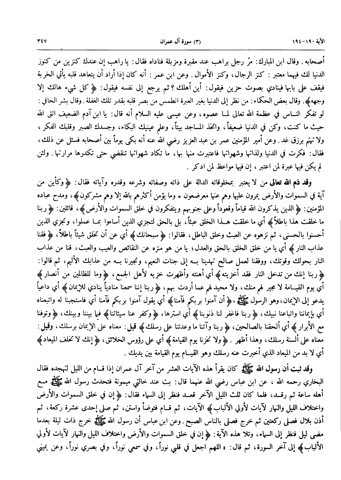 وَقَدْ ثَبَتَ أَنَّ رَسُولَ اللَّهِ صَلَّى اللَّهُ عَلَيْهِ وَسَلَّمَ كَانَ يَقْرَأُ هَذِهِ الْآيَاتِ الْعَشْرَ مِنْ آخِرِ آلِ عِمْرَانَ إِذَا قَامَ مِنَ الليل لتهجده فقال البخاري رحمه الله، عَنِ ابْنِ عَبَّاسٍ رَضِيَ اللَّهُ عَنْهُمَا قَالَ: بِتُّ عِنْدَ خَالَتِي مَيْمُونَةَ فَتَحَدَّثَ رَسُولُ اللَّهِ صَلَّى اللَّهُ عَلَيْهِ وَسَلَّمَ مَعَ أَهْلِهِ سَاعَةً ثُمَّ رَقَدَ، فَلَمَّا كَانَ ثُلُثُ اللَّيْلِ الْآخِرِ قَعَدَ فَنَظَرَ إِلَى السَّمَاءِ فَقَالَ: {إِنَّ فِي خَلْقِ السَّمَوَاتِ وَالْأَرْضِ وَاخْتِلَافِ اللَّيْلِ وَالنَّهَارِ لآيَاتٍ لأُوْلِي الْأَلْبَابِ} الآيات، ثم قام فتوضأ واستن، ثم صلى إِحْدَى عَشْرَةَ رَكْعَةً، ثُمَّ أَذَّنَ بِلَالٌ فَصَلَّى ركعتين ثم خرج فصلى بالناس الصبح. وعن ابْنِ عَبَّاسٍ أَنَّ رَسُولَ اللَّهِ صَلَّى اللَّهُ عليه وسلم خرج ذات ليلة بعدما مَضَى لَيْلٌ فَنَظَرَ إِلَى السَّمَاءِ، وَتَلَا هَذِهِ الآية: {إِنَّ فِي خَلْقِ السَّمَوَاتِ وَالْأَرْضِ وَاخْتِلَافِ اللَّيْلِ وَالنَّهَارِ لآيَاتٍ لأُوْلِي الْأَلْبَابِ} إِلَى آخِرِ السُّورَةِ، ثُمَّ قَالَ: «اللَّهُمَّ اجْعَلْ فِي قَلْبِي نُورًا، وَفِي سَمْعِي نُورًا وَفِي بَصَرِي نُورًا، وَعَنْ يَمِينِي