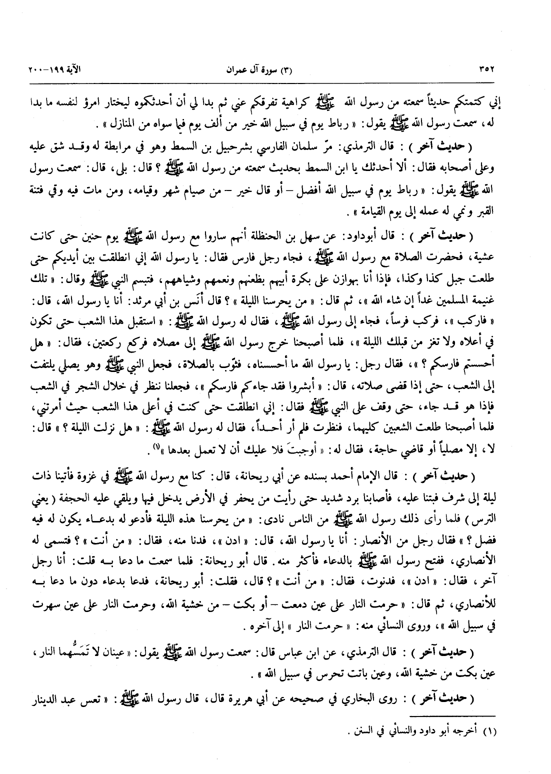(حديث آخر): قال الترمذي: مرّ سلمان الفارسي بشرحبيل بن الصمت وهو في مرابطة لَهُ وَقَدْ شَقَّ عَلَيْهِ وَعَلَى أَصْحَابِهِ فَقَالَ: ألا أحدثك يا ابن الصمت بِحَدِيثٍ سَمِعْتُهُ مِنْ رَسُولِ اللَّهِ صَلَّى اللَّهُ عَلَيْهِ وَسَلَّمَ؟ قَالَ: بَلَى، قَالَ: سَمِعْتُ رَسُولَ اللَّهِ صَلَّى اللَّهُ عَلَيْهِ وَسَلَّمَ يَقُولُ: «رِبَاطُ يَوْمٍ فِي سَبِيلِ اللَّهِ أَفْضَلُ - أَوْ قَالَ خَيْرٌ - مِنْ صِيَامِ شَهْرٍ وَقِيَامِهِ، وَمَنْ مَاتَ فيه وقي فتنة القبر ونمي له عمله إلى يَوْمَ الْقِيَامَةِ».