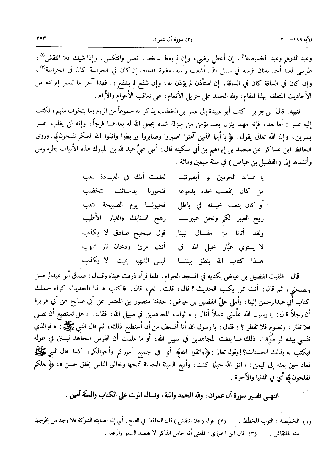 انتهى تَفْسِيرِ سُورَةِ آلِ عِمْرَانَ، وَلِلَّهِ الْحَمْدُ وَالْمِنَّةُ، ونسأله الموت على الكتاب والسنة آمين.