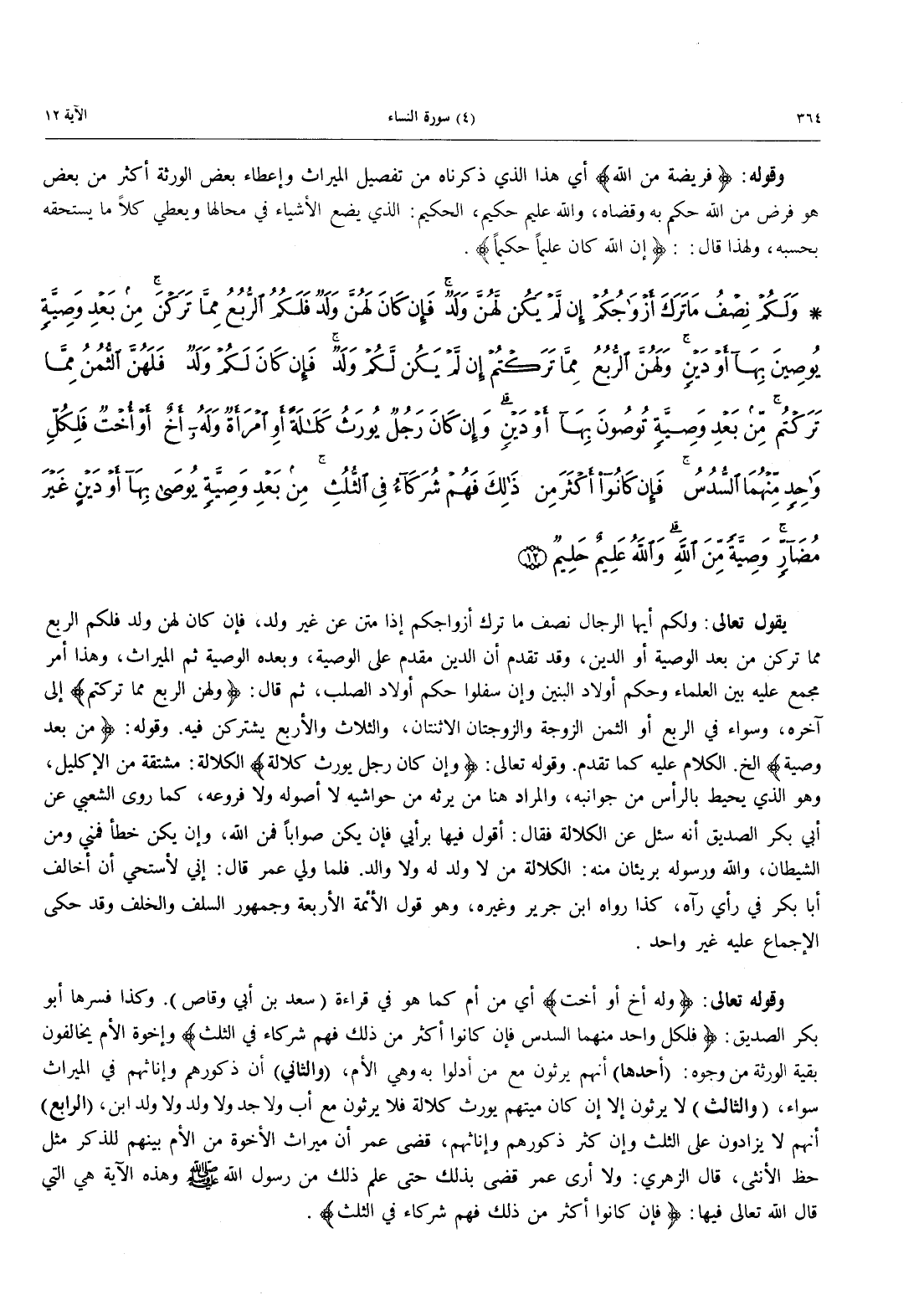 - 12 - وَلَكُمْ نِصْفُ مَا تَرَكَ أَزْوَاجُكُمْ إِنْ لَمْ يَكُنْ لَهُنَّ وَلَدٌ فَإِنْ كَانَ لَهُنَّ وَلَدٌ فَلَكُمُ الرُّبُعُ مِمَّا تَرَكْنَ مِنْ بَعْدِ وَصِيَّةٍ يُوصِينَ بِهَآ أَوْ دَيْنٍ وَلَهُنَّ الرُّبُعُ مِمَّا تَرَكْتُمْ إِن لَّمْ يَكُنْ لَّكُمْ وَلَدٌ فَإِن كَانَ لَكُمْ وَلَدٌ فَلَهُنَّ الثُّمُنُ مِمَّا تَرَكْتُمْ مِنْ بَعْدِ وَصِيَّةٍ تُوصُونَ بِهَآ أَوْ دَيْنٍ وَإِن كَانَ رَجُلٌ يُورَثُ كَلَالَةً أَوِ امْرَأَةٌ وَلَهُ أَخٌ أَوْ أُخْتٌ فَلِكُلِّ وَاحِدٍ مِّنْهُمَا السُّدُسُ فَإِن كَانُوا أَكْثَرَ مِنْ ذَلِكَ فَهُمْ شُرَكَآءُ فِي الثُّلُثِ مِنْ بَعْدِ وَصِيَّةٍ يُوصَى بِهَا أَوْ دَيْنٍ غَيْرَ مُضَآرٍّ وَصِيَّةً مِّنَ اللَّهِ وَاللَّهُ عَلِيمٌ حَلِيمٌ