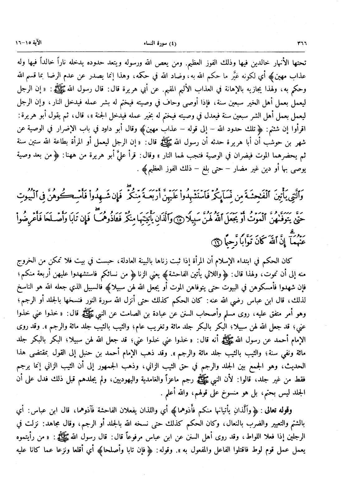 كَانَ الْحُكْمُ فِي ابْتِدَاءِ الْإِسْلَامِ أَنَّ المرأة إذا ثبت زِنَاهَا بِالْبَيِّنَةِ الْعَادِلَةِ، حُبِسَتْ فِي بَيْتٍ فَلَا تُمَكَّنُ مِنَ الْخُرُوجِ مِنْهُ إِلَى أَنْ تَمُوتَ، وَلِهَذَا قَالَ: {وَاللَّاتِي يَأْتِينَ الْفَاحِشَةَ} يَعْنِي الزِّنَا {مِن نِّسَآئِكُمْ فاستشهدوا علين أَرْبَعةً مِّنْكُمْ؛ فَإِن شَهِدُواْ فَأَمْسِكُوهُنَّ فِي الْبُيُوتِ حَتَّى يَتَوَفَّاهُنَّ الْمَوْتُ أَوْ يَجْعَلَ اللَّهُ لَهُنَّ سَبِيلًا} فَالسَّبِيلُ الَّذِي جَعَلَهُ اللَّهُ هُوَ النَّاسِخُ لذلك، قال ابن عباس رضي الله عنه: كَانَ الْحُكْمُ كَذَلِكَ حَتَّى أَنْزَلَ اللَّهُ سُورَةَ النور فنسخها بالجلد أو الرجم؛ وهو أمر متفق عليه، وروى مسلم وأصحاب السنن عَنْ عُبَادَةَ بْنِ الصَّامِتِ عَنِ النَّبِيِّ صَلَّى اللَّهُ عَلَيْهِ وَسَلَّمَ قَالَ: «خُذُوا عَنِّي خُذُوا عَنِّي؛ قَدْ جَعَلَ اللَّهُ لَهُنَّ سَبِيلًا؛ الْبِكْرُ بِالْبِكْرِ جَلْدُ مِائَةٍ وَتَغْرِيبُ عام؛ والثب بالثيب جلد مائة والرجم» وقد روى الْإِمَامِ أَحْمَدَ عَنْ رَسُولِ اللَّهِ صَلَّى اللَّهُ عَلَيْهِ وَسَلَّمَ أنه قال: «خُذُوا عَنِّي خُذُوا عَنِّي؛ قَدْ جَعَلَ اللَّهُ لَهُنَّ سَبِيلًا؛ الْبِكْرُ بِالْبِكْرِ جَلْدُ مِائَةٍ وَنَفْيُ سنة؛ والثيب بالثيب جلد مائة والرجم». وَقَدْ ذَهَبَ الْإِمَامُ أَحْمَدُ بْنُ حَنْبَلٍ إِلَى الْقَوْلِ بِمُقْتَضَى هَذَا الْحَدِيثِ، وَهُوَ الْجَمْعُ بَيْنَ الْجَلْدِ وَالرَّجْمِ فِي حَقِّ الثَّيِّبِ الزَّانِي، وَذَهَبَ الْجُمْهُورُ إِلَى أَنَّ الثَّيِّبَ الزَّانِي إِنَّمَا يُرْجَمُ فَقَطْ مِنْ غَيْرِ جَلْدٍ، قَالُوا: لِأَنَّ النَّبِيَّ صَلَّى اللَّهُ عَلَيْهِ وَسَلَّمَ رَجَمَ مَاعِزًا وَالْغَامِدِيَّةَ وَالْيَهُودِيَّيْنِ، وَلَمْ يَجْلِدْهُمْ قَبْلَ ذَلِكَ فَدَلَّ عَلَى أَنَّ الْجَلْدَ لَيْسَ بِحَتْمٍ، بَلْ هُوَ مَنْسُوخٌ على قولهم، والله أعلم.