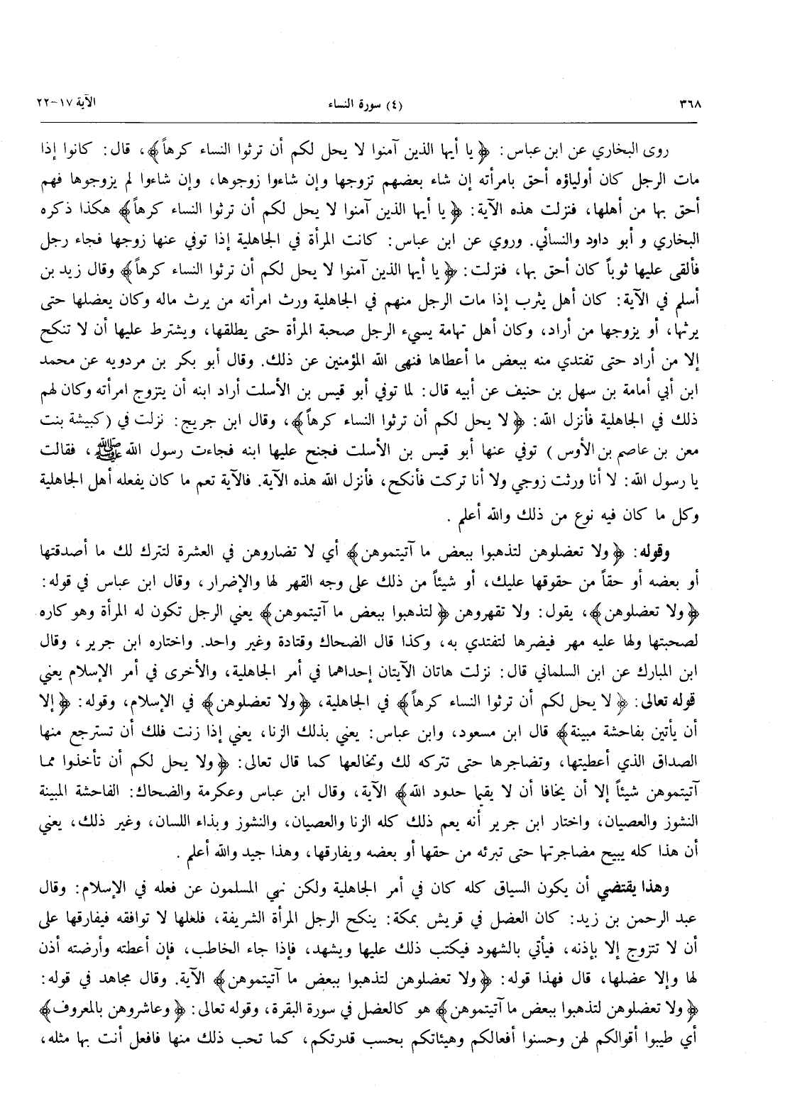 روى البخاري عَنِ ابْنِ عَبَّاسٍ: {يَا أَيُّهَا الَّذِينَ آمَنُوا لَا يَحِلُّ لَكُمْ أَن تَرِثُواْ النِّسَاءَ كَرْهاً} قال: كانوا إذا ات الرَّجُلُ كَانَ أَوْلِيَاؤُهُ أَحَقُّ بِامْرَأَتِهِ إِنْ شَاءَ بَعْضُهُمْ تَزَوَّجَهَا وَإِنْ شَاءُوا زَوَّجُوهَا، وَإِنَّ شَاءُوا لَمْ يُزَوِّجُوهَا فَهُمْ أَحَقُّ بِهَا مِنْ أَهْلِهَا، فَنَزَلَتْ هَذِهِ الْآيَةُ: {يَا أَيُّهَا الَّذِينَ آمَنُواْ لاَ يَحِلُّ لَكُمْ أَن تَرِثُواْ النسآء كَرْهاً} هكذا ذكره البخاري وأبو داود والنسائي وروي عَنِ ابْنِ عَبَّاسٍ: كَانَتِ الْمَرْأَةُ فِي الْجَاهِلِيَّةِ إِذَا تُوُفِّيَ عَنْهَا زَوْجُهَا فَجَاءَ رَجُلٌ فَأَلْقَى عَلَيْهَا ثَوْبًا كَانَ أَحَقَّ بِهَا، فَنَزَلَتْ: {يَا أَيُّهَا الَّذِينَ آمَنُوا لَا يَحِلُّ لَكُمْ أَن تَرِثُواْ النِّسَاءَ كَرْهاً} وَقَالَ زَيْدُ بْنُ أَسْلَمَ في الآية: كَانَ أَهْلُ يَثْرِبَ إِذَا مَاتَ الرَّجُلُ مِنْهُمْ فِي الْجَاهِلِيَّةِ وَرِثَ امْرَأَتَهُ مَنْ يَرِثُ مَالَهُ وَكَانَ يَعْضُلُهَا حَتَّى يَرِثَهَا، أَوْ يُزَوِّجَهَا مَنْ أَرَادَ، وَكَانَ أَهْلُ تِهَامَةَ يُسِيءُ الرَّجُلُ صُحْبَةَ الْمَرْأَةِ حَتَّى يُطَلِّقَهَا، وَيَشْتَرِطَ عَلَيْهَا أَن لاَّ تَنْكِحَ إِلَّا مَنْ أَرَادَ حَتَّى تَفْتَدِيَ مِنْهُ بِبَعْضِ مَا أَعْطَاهَا فَنَهَى اللَّهُ الْمُؤْمِنِينَ عَنْ ذلك. وقال أبو بكر بن مردويه عن محمد ابن أَبِي أُمَامَةَ بْنِ سَهْلِ بْنِ حُنَيْفٍ عَنْ أَبِيهِ قَالَ: لَمَّا تُوُفِّيَ أَبُو قَيْسِ بْنِ الْأَسْلَتِ أَرَادَ ابْنُهُ أَنْ يَتَزَوَّجَ امْرَأَتَهُ وَكَانَ لَهُمْ ذَلِكَ فِي الْجَاهِلِيَّةِ فَأَنْزَلَ اللَّهُ: {لاَ يحل لكم أن رثوا النسآء كَرْهاً} وقال ابن جريرج: نَزَلَتْ فِي (كُبَيْشَةَ بِنْتِ مَعْنِ بْنِ عَاصِمِ بْنِ الْأَوْسِ) تُوُفِّيَ عَنْهَا أَبُو قَيْسِ بْنِ الْأَسْلَتِ فَجَنَحَ عَلَيْهَا ابْنُهُ فَجَاءَتْ رَسُولَ اللَّهِ صَلَّى اللَّهُ عَلَيْهِ وَسَلَّمَ، فَقَالَتْ يَا رَسُولَ اللَّهِ: لَا أَنَا وَرِثْتُ زَوْجِي وَلَا أَنَا تركت فأنكح، فأنزل الله هذه الآية. فَالْآيَةُ تَعُمُّ مَا كَانَ يَفْعَلُهُ أَهْلُ الْجَاهِلِيَّةِ وَكُلَّ مَا كَانَ فِيهِ نَوْعٌ مِنْ ذَلِكَ وَاللَّهُ أَعْلَمُ.