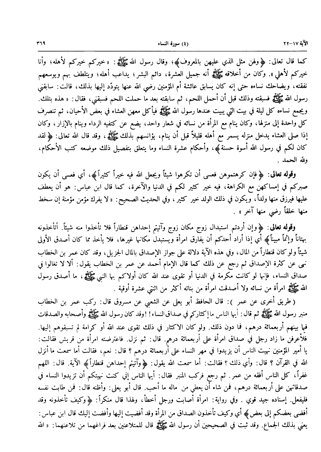 وَقَوْلُهُ تعالى: {وَإِن أَرَدْتُّمُ اسْتِبْدَالَ زَوْجٍ مَّكَانَ زَوْجٍ وَآتَيْتُمْ إِحْدَاهُنَّ قِنْطَاراً فَلاَ تَأْخُذُواْ مِنْهُ شَيْئاً أَتَأْخُذُونَهُ بُهْتَاناً وَإِثْماً مُّبِيناً} أَيْ إِذَا أَرَادَ أَحَدُكُمْ أَنْ يُفَارِقَ امْرَأَةً وَيَسْتَبْدِلَ مَكَانَهَا غَيْرَهَا، فَلَا يأخذ مِمَّا كَانَ أَصْدَقَ الْأُولَى شَيْئًا وَلَوْ كَانَ قنطاراً من المال، وَفِي هَذِهِ الْآيَةِ دَلَالَةٌ عَلَى جَوَازِ الْإِصْدَاقِ بِالْمَالِ الْجَزِيلِ، وَقَدْ كَانَ عُمَرُ بْنُ الْخَطَّابِ نَهَى عَنْ كَثْرَةِ الْإِصْدَاقِ ثُمَّ رَجَعَ عَنْ ذلك كما قال الإمام أحمد عن عمر بن الخطاب يقول: ألا لا تغالوا فِي صَدَاقِ النِّسَاءِ، فَإِنَّهَا لَوْ كَانَتْ مَكْرُمَةً فِي الدُّنْيَا أَوْ تَقْوًى عِنْدَ اللَّهِ كَانَ أَوْلَاكُمْ بِهَا النَّبِيُّ صَلَّى اللَّهُ عَلَيْهِ وَسَلَّمَ، مَا أَصْدَقَ رَسُولُ اللَّهِ صَلَّى اللَّهُ عَلَيْهِ وَسَلَّمَ امْرَأَةً مِنْ نِسَائِهِ وَلَا أُصْدِقَتِ امْرَأَةٌ مِنْ بَنَاتِهِ أَكْثَرَ مِنِ اثْنَتَيْ عَشْرَةَ أُوقِيَّةً.