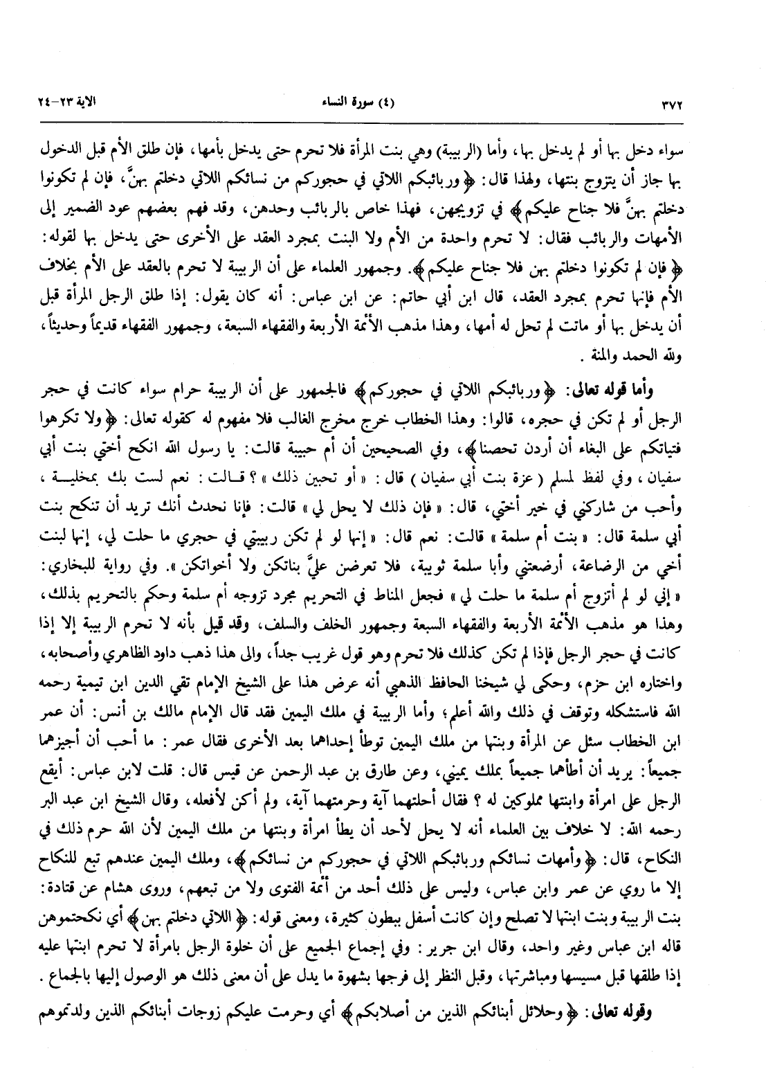 سواء دخل بها أو لم يدخل بها، وَأَمَّا (الرَّبِيبَةُ) وَهِيَ بِنْتُ الْمَرْأَةِ فَلَا تَحْرُمُ حتى يدخل بأمها، فَإِنْ طَلَّقَ الْأُمَّ قَبْلَ الدُّخُولِ بِهَا جَازَ أَنْ يَتَزَوَّجَ بِنْتَهَا، وَلِهَذَا قَالَ: {وَرَبَائِبُكُمُ اللَّاتِي فِي حُجُورِكُمْ مِّن نِّسَآئِكُمُ اللَّاتِي دَخَلْتُمْ بهنَّ، فَإِنْ لَمْ تَكُونُوا دَخَلْتُمْ بهنَّ فَلاَ جُنَاحَ عليكم} فِي تَزْوِيجِهِنَّ، فَهَذَا خَاصٌّ بِالرَّبَائِبِ وَحْدَهُنَّ، وَقَدْ فهم بعضهم عود الضمير إلى الأمهات والربائب فَقَالَ: لَا تَحْرُمُ وَاحِدَةٌ مِنَ الْأُمِّ وَلَا الْبِنْتِ بِمُجَرَّدِ الْعَقْدِ عَلَى الْأُخْرَى حَتَّى يَدْخُلَ بِهَا لِقَوْلِهِ: {فَإِن لَّمْ تَكُونُواْ دَخَلْتُمْ بِهِنَّ فَلاَ جُنَاحَ عَلَيْكُمْ} وجمهور العلماء على أن الربيبة لا تحرم بالعقد على الأم بخلاف الأم فإنها تحرم بمجرد العقد، قال ابن أبي حاتم: عَنِ ابْنِ عَبَّاسٍ: أَنَّهُ كَانَ يَقُولُ: إِذَا طلق الرجل المرأة قَبْلَ أَنْ يَدْخُلَ بِهَا أَوْ مَاتَتْ لَمْ تحل لها أمها، وَهَذَا مَذْهَبُ الْأَئِمَّةِ الْأَرْبَعَةِ وَالْفُقَهَاءِ السَّبْعَةِ، وَجُمْهُورُ الفقهاء قديماً وحديثاً، ولله الحمد والمنة.