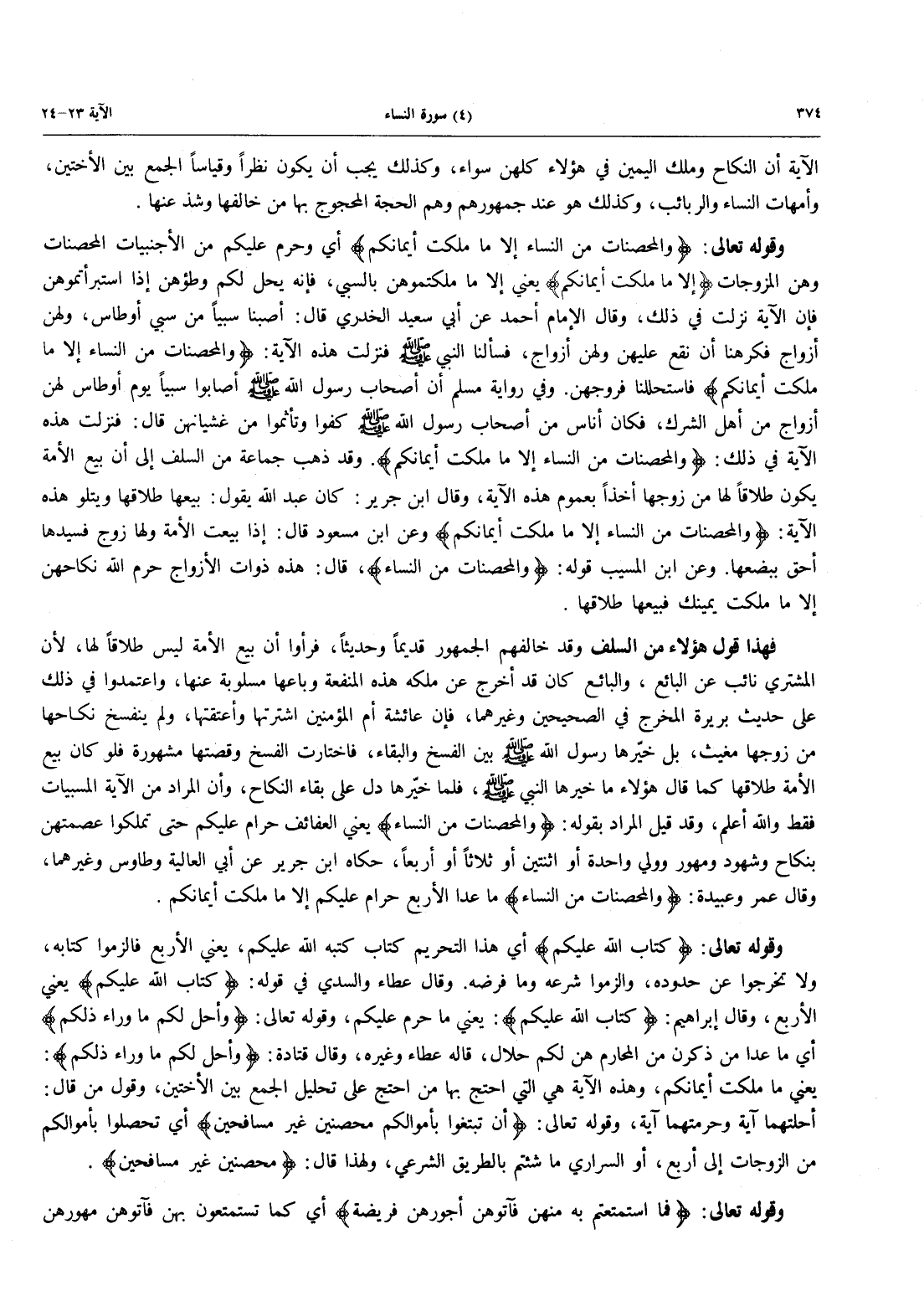 وَقَوْلُهُ تَعَالَى: {وَالْمُحْصَنَاتُ مِنَ النِّسَاءِ إِلاَّ مَا مَلَكَتْ أَيْمَانُكُمْ} أي وحرم عليكم من الْأَجْنَبِيَّاتُ الْمُحْصَنَاتُ وَهُنَّ الْمُزَوَّجَاتُ {إِلاَّ مَا مَلَكْتَ أَيْمَانُكُمْ} يَعْنِي إِلَّا مَا مَلَكْتُمُوهُنَّ بِالسَّبْيِ فَإِنَّهُ يَحِلُّ لَكُمْ وَطْؤُهُنَّ إِذَا اسْتَبْرَأْتُمُوهُنَّ فَإِنَّ الْآيَةَ نزلت في ذلك، وقال الإمام أحمد عن أبي سعيد الخدري قال: أصبنا سبياً مِنْ سَبْيِ أَوْطَاسَ، وَلَهُنَّ أَزْوَاجٌ فَكَرِهْنَا أَنْ نَقَعَ عَلَيْهِنَّ وَلَهُنَّ أَزْوَاجٌ، فَسَأَلْنَا النَّبِيَّ صَلَّى اللَّهُ عَلَيْهِ وَسَلَّمَ فَنَزَلَتْ هَذِهِ الْآيَةُ: {وَالْمُحْصَنَاتُ مِنَ النِّسَاءِ إلاّ مَّا مَلَكَتْ أَيْمَانُكُمْ} فاستحللنا فروجهن. وفي رواية مسلم أَنَّ أَصْحَابَ رَسُولِ اللَّهِ صَلَّى اللَّهُ عَلَيْهِ وسلم أصابوا سبياً يَوْمَ أَوَطَاسَ لَهُنَّ أَزْوَاجٌ مِنْ أَهْلِ الشِّرْكِ، فكان أُنَاسٍ مِنْ أَصْحَابِ رَسُولِ اللَّهِ صَلَّى اللَّهُ عَلَيْهِ وَسَلَّمَ كَفُّوا وَتَأَثَّمُوا مِنْ غَشَيَانِهِنَّ قَالَ: فَنَزَلَتْ هَذِهِ الْآيَةُ فِي ذَلِكَ: {وَالْمُحْصَنَاتُ مِنَ النساء إِلاَّ مَا مَلَكْتَ أَيْمَانُكُمْ} وَقَدْ ذَهَبَ جَمَاعَةٌ مِنَ السَّلَفِ إِلَى أَنَّ بَيْعَ الْأَمَةِ يَكُونُ طَلَاقًا لَهَا مِنْ زَوْجِهَا أخذاً بعموم هذه الآية، وقال ابن جرير: كَانَ عَبْدُ اللَّهِ يَقُولُ: بَيْعُهَا طَلَاقُهَا وَيَتْلُو هذه الآية: {والمحصنات من النساء إلا مَّا مَلَكَتْ أَيْمَانُكُمْ} وعن ابْنِ مَسْعُودٍ قَالَ: إِذَا بِيعَتِ الْأَمَةُ وَلَهَا زوج فسيدها أحق ببضعها وعن ابن المسيب قوله: {المحصنات مِنَ النساء}، قال: هذه ذَوَاتُ الْأَزْوَاجِ حَرَّمَ اللَّهُ نِكَاحَهُنَّ إِلاَّ مَا مَلَكَتْ يمينك فبيعها طلاقها.