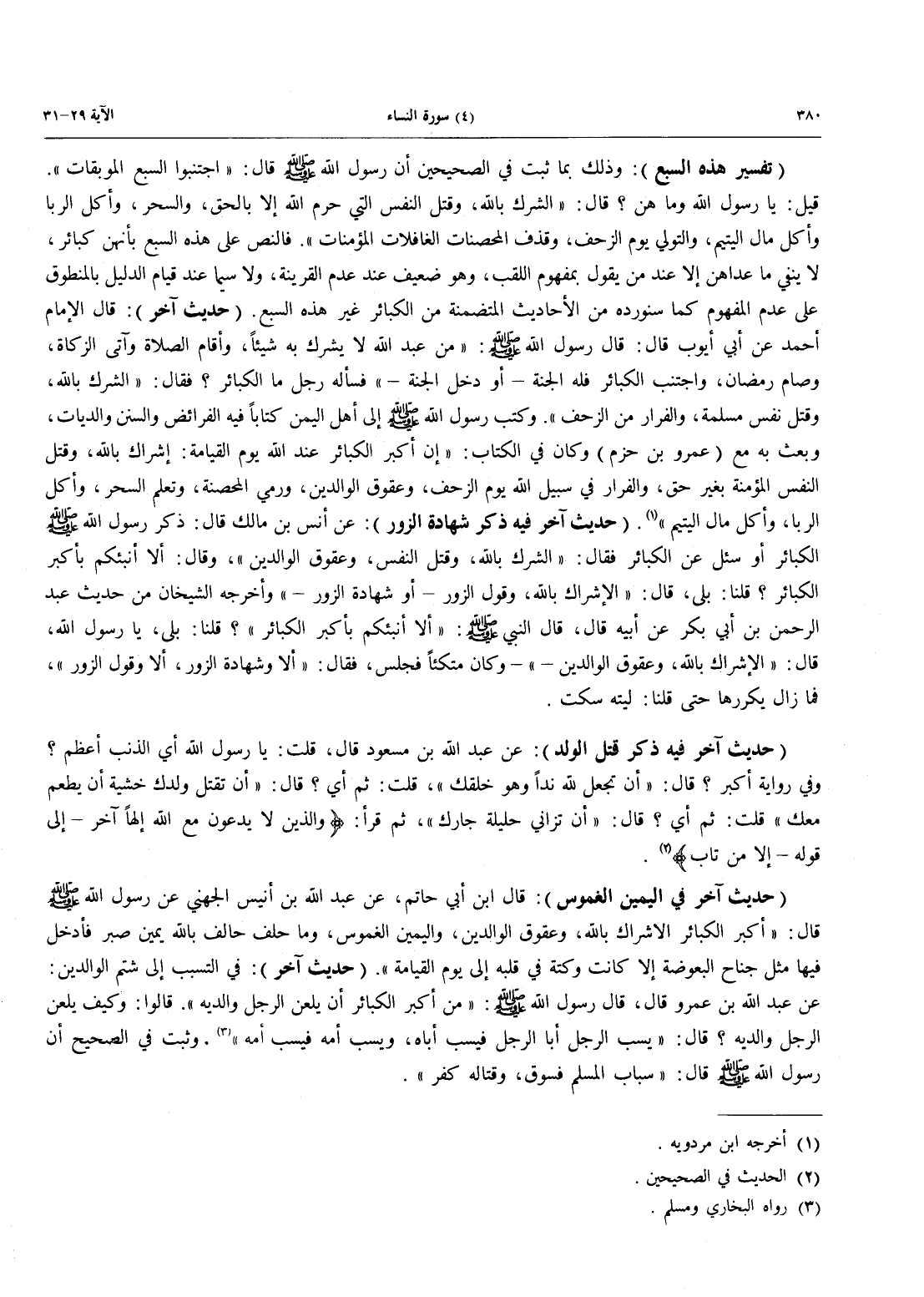 (تَفْسِيرُ هَذِهِ السَّبْعِ): وَذَلِكَ بِمَا ثَبَتَ فِي الصَّحِيحَيْنِ أَنَّ رَسُولَ اللَّهِ صَلَّى اللَّهُ عَلَيْهِ وَسَلَّمَ قَالَ: «اجْتَنِبُوا السَّبْعَ الْمُوبِقَاتِ». قِيلَ: يَا رَسُولَ اللَّهِ وَمَا هُنَّ؟ قَالَ: «الشِّرْكُ بِاللَّهِ وَقَتْلُ النَّفْسِ الَّتِي حَرَّمَ اللَّهُ إِلاَّ بِالْحَقِّ، وَالسِّحْرُ، وَأَكْلُ الرِّبَا وَأَكْلُ مَالِ الْيَتِيمِ، وَالتَّوَلِّي يَوْمَ الزحف، وقذف المحصنات الغافلات المؤمنات». فَالنَّصُّ عَلَى هَذِهِ السَّبْعِ بِأَنَّهُنَّ كَبَائِرُ، لَا يَنْفِي مَا عَدَاهُنَّ إِلَّا عِنْدَ مَنْ يَقُولُ بِمَفْهُومِ اللَّقَبِ، وَهُوَ ضَعِيفٌ عِنْدَ عَدَمِ الْقَرِينَةِ، وَلَا سِيَّمَا عِنْدَ قِيَامِ الدَّلِيلِ بِالْمَنْطُوقِ عَلَى عَدَمِ الْمَفْهُومِ كَمَا سَنُورِدُهُ مِنَ الْأَحَادِيثِ الْمُتَضَمَّنَةِ من الكبائر غير هذه السبع (حديث آخر): قال الإمام أحمد عَنْ أَبِي أَيُّوبَ قَالَ: قَالَ رَسُولُ اللَّهِ صَلَّى اللَّهُ عَلَيْهِ وَسَلَّمَ: "مَنْ عَبَدَ اللَّهَ لَا يُشْرِكُ بِهِ شَيْئًا، وَأَقَامَ الصَّلَاةَ وَآتَى الزَّكَاةَ، وَصَامَ رَمَضَانَ وَاجْتَنَبَ الْكَبَائِرَ فَلَهُ الْجَنَّةُ - أَوْ دَخَلَ الْجَنَّةَ - فَسَأَلَهُ رَجُلٌ مَا الْكَبَائِرُ؟ فَقَالَ: «الشِّرْكُ بِاللَّهِ وَقَتْلُ نَفْسٍ مُسْلِمَةٍ، وَالْفِرَارُ من الزحف». وكتب رسول الله صلى الله عليه وسلم إلى أَهْلِ الْيَمَنِ كِتَابًا فِيهِ الْفَرَائِضُ وَالسُّنَنُ وَالدِّيَاتُ، وبعث به مع (عمرو بن حزم) وَكَانَ فِي الْكِتَابِ: "إِنَّ أَكْبَرَ الْكَبَائِرِ عِنْدَ اللَّهِ يَوْمَ الْقِيَامَةِ: إِشْرَاكٌ بِاللَّهِ، وَقَتْلُ النَّفْسِ الْمُؤْمِنَةِ بِغَيْرِ حَقٍّ، وَالْفِرَارُ فِي سَبِيلِ اللَّهِ يَوْمَ الزَّحْفِ، وَعُقُوقُ الْوَالِدَيْنِ، وَرَمْيُ الْمُحْصَنَةِ، وَتَعَلُّمُ السحر، وأكل الربا، وأكل مال اليتيم" (أخرجه ابن مردويه) (حديث آخر فيه ذكر شهادة الزور): عن أَنَسَ بْنَ مَالِكٍ قَالَ: ذَكَرَ رَسُولُ اللَّهِ صَلَّى اللَّهُ عَلَيْهِ وَسَلَّمَ الْكَبَائِرَ أَوْ سُئِلَ عَنِ الْكَبَائِرِ فَقَالَ: «الشِّرْكُ بِاللَّهِ، وَقَتْلُ النَّفْسِ، وَعُقُوقُ الْوَالِدَيْنِ»، وَقَالَ: أَلَا أُنْبِئُكُمْ بِأَكْبَرِ الْكَبَائِرِ؟ قلنا: بلى، قال: «الإشراك بالله، وقول الزور - أو شهادة الزور -» وأخرجه الشَّيْخَانِ مِنْ حَدِيثِ عَبْدِ الرَّحْمَنِ بْنِ أَبِي بكر عَنْ أَبِيهِ قَالَ، قَالَ النَّبِيُّ صَلَّى اللَّهُ عَلَيْهِ وَسَلَّمَ: «أَلَا أُنْبِئُكُمْ بِأَكْبَرِ الْكَبَائِرِ»؟ قُلْنَا: بَلَى، يَا رَسُولَ اللَّهِ، قَالَ: «الْإِشْرَاكُ بِاللَّهِ، وَعُقُوقُ الْوَالِدَيْنِ -» - وَكَانَ مُتَّكِئًا فَجَلَسَ، فَقَالَ: «أَلَا وَشَهَادَةُ الزُّورِ، أَلَا وَقَوْلُ الزُّورِ»، فَمَا زَالَ يُكَرِّرُهَا حَتَّى قُلْنَا: لَيْتَهُ سَكَتَ.