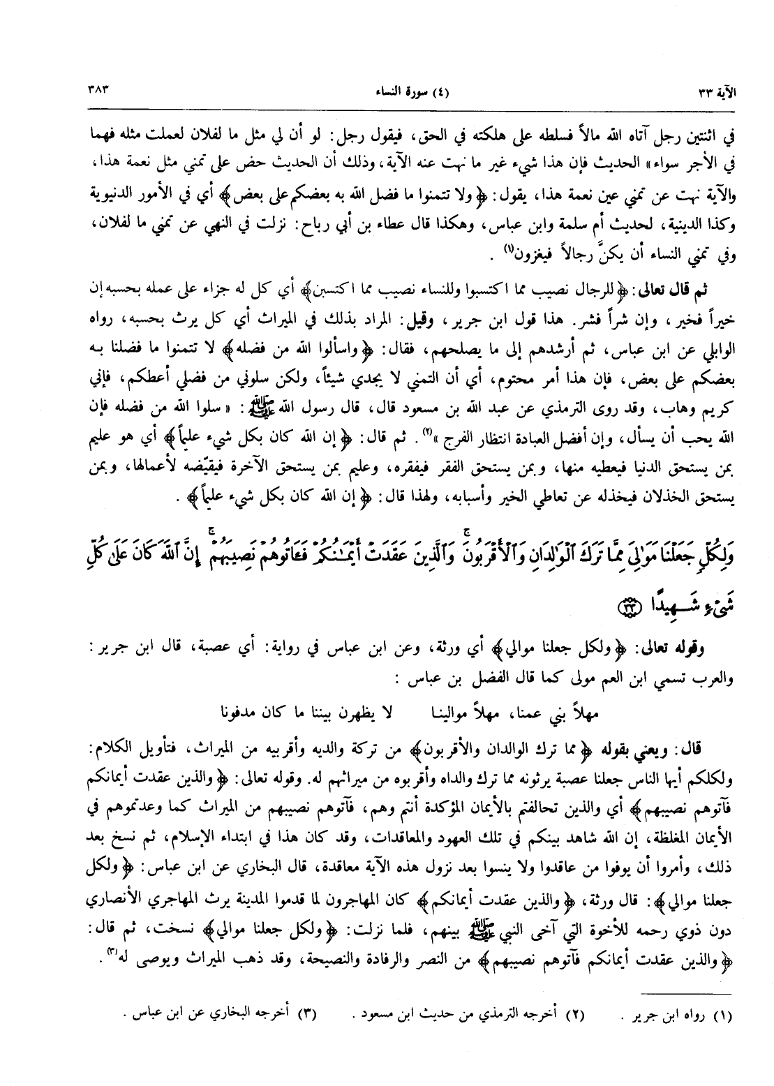 - 33 - وَلِكُلٍّ جَعَلْنَا مَوَالِيَ مما ترك الوالدان والأقربون وَالَّذِينَ عَقَدَتْ أَيْمَانُكُمْ فَآتُوهُمْ نَصِيبَهُمْ إِنَّ اللَّهَ كَانَ عَلَى كُلِّ شَيْءٍ شَهِيدًا