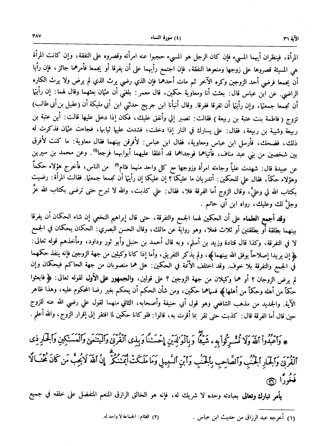 الْمَرْأَةِ، فَيَنْظُرَانِ أَيُّهُمَا الْمُسِيءُ فَإِنْ كَانَ الرَّجُلُ هُوَ الْمُسِيءُ حَجَبُوا عَنْهُ امْرَأَتَهُ وَقَصَرُوهُ عَلَى النَّفَقَةِ، وَإِنْ كَانَتِ الْمَرْأَةُ هِيَ الْمُسِيئَةُ قَصَرُوهَا عَلَى زَوْجِهَا وَمَنَعُوهَا النَّفَقَةَ، فَإِنِ اجْتَمَعَ رَأْيُهُمَا عَلَى أَنْ يُفَرَّقَا أَوْ يُجْمَعَا فَأَمْرُهُمَا جَائِزٌ، فَإِنْ رَأَيَا أَنْ يُجْمَعَا فَرَضِيَ أَحَدُ الزَّوْجَيْنِ وكره الْآخَرُ ثُمَّ مَاتَ أَحَدُهُمَا فَإِنَّ الَّذِي رَضِيَ يرث الذي لم يرض ولا يرث الكاره الراضي عَنِ ابْنِ عَبَّاسٍ قَالَ: بُعِثْتُ أَنَا وَمُعَاوِيَةُ حَكَمَيْنِ، قَالَ مَعْمَرٌ: بَلَغَنِي أَنَّ عُثْمَانَ بَعَثَهُمَا وَقَالَ لَهُمَا: إِنْ رَأَيْتُمَا أَنْ تُجْمَعَا جُمِعْتُمَا، وإن رأيتمان أن تفرقا ففرقا. وَقَالَ أَنْبَأَنَا ابْنُ جُرَيْجٍ حَدَّثَنِي ابْنُ أَبِي مُلَيْكَةَ أَنَّ (عَقِيلَ بْنَ أَبِي طَالِبٍ) تَزَوَّجَ (فاطمة بنت عتبة بن ربيعة) فقالت: تصبر إِلَيَّ وَأُنْفِقُ عَلَيْكَ، فَكَانَ إِذَا دَخَلَ عَلَيْهَا قَالَتْ: أَيْنَ عُتْبَةُ بْنُ رَبِيعَةَ وَشَيْبَةُ بْنُ ربيعة) فقال: عَلَى يَسَارِكِ فِي النَّارِ إِذَا دَخَلْتِ؛ فَشَدَّتْ عَلَيْهَا ثِيَابَهَا، فَجَاءَتْ عُثْمَانَ فَذَكَرَتْ لَهُ ذَلِكَ فضحك، فأرسل ابْنَ عَبَّاسٍ وَمُعَاوِيَةَ، فَقَالَ ابْنُ عَبَّاسٍ: لَأُفَرِّقَنَّ بَيْنَهُمَا فَقَالَ مُعَاوِيَةُ: مَا كُنْتُ لِأُفَرِّقَ بَيْنَ شخصين من بني عبد مناف، فأتياهما فوجاهما قد أغلقا عليهما أبوابهما فرجعا (أخرجه عبد الرزاق من حديث ابن عباس) وعن مُحَمَّدِ بْنِ سِيرِينَ عَنْ عُبَيْدَةَ قَالَ: شَهِدْتُ عَلِيَّا وَجَاءَتْهُ امْرَأَةٌ وَزَوْجُهَا مَعَ كُلِّ وَاحِدٍ منهما فئام (الفئام: الجماعة لا واحد له) مِنَ النَّاسِ، فَأَخْرَجَ هَؤُلَاءِ حَكَمًا وَهَؤُلَاءِ حَكَمًا، فَقَالَ عَلِيٌّ لِلْحَكَمَيْنِ: أَتَدْرِيَانِ مَا عَلَيْكُمَا؟ إِنَّ عَلَيْكُمَا إِنْ رَأَيْتُمَا أَنْ تُجْمَعَا جُمِعْتُمَا. فَقَالَتِ الْمَرْأَةُ رَضِيتُ بِكِتَابِ اللَّهِ لِي وعليَّ، وَقَالَ الزَّوْجُ أَمَّا الْفُرْقَةُ فَلَا، فَقَالَ: عَلِيٌّ كَذَبْتَ، وَاللَّهِ لَا تَبْرَحْ حَتَّى تَرْضَى بِكِتَابِ اللَّهِ عزَّ وجلَّ لَكَ وَعَلَيْكَ، رَوَاهُ ابْنُ أَبِي حاتم.