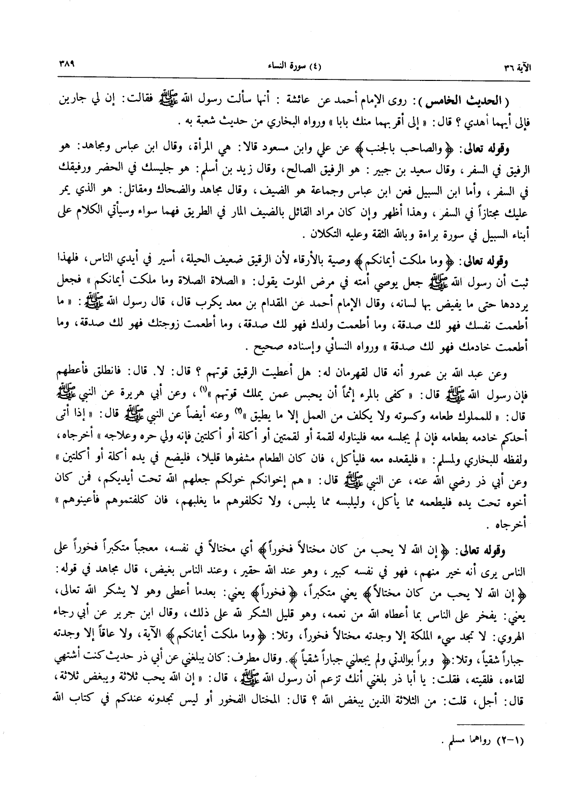 وقوله تعالى: {وَمَا مَلَكَتْ أَيْمَانُكُمْ} وَصِيَّةٌ بِالْأَرِقَّاءِ لِأَنَّ الرَّقِيقَ ضعيف الحيلة، أسير في أيدي الناس، فلهذا ثَبَتَ أَنَّ رَسُولَ اللَّهِ صَلَّى اللَّهُ عَلَيْهِ وَسَلَّمَ جَعَلَ يُوصِي أُمَّتَهُ فِي مَرَضِ الْمَوْتِ يَقُولُ: «الصَّلَاةَ الصَّلَاةَ وَمَا مَلَكَتْ أَيْمَانُكُمْ» فَجَعَلَ يُرَدِّدُهَا حَتَّى مَا يَفِيضُ بِهَا لِسَانُهُ، وَقَالَ الإمام أحمد عَنِ الْمِقْدَامِ بْنِ مَعْدِ يَكَرِبَ قَالَ، قَالَ رَسُولُ اللَّهِ صَلَّى اللَّهُ عَلَيْهِ وسلم: «ما أَطْعَمْتَ نَفْسَكَ فَهُوَ لَكَ صَدَقَةٌ، وَمَا أَطْعَمْتَ ولدك فهو لك صدقة، وما أطعمت زووجتك فَهُوَ لَكَ صَدَقَةٌ، وَمَا أَطْعَمْتَ خَادِمَكَ فَهُوَ لك صدقة» ورواه النسائي وإسناده صحيح.