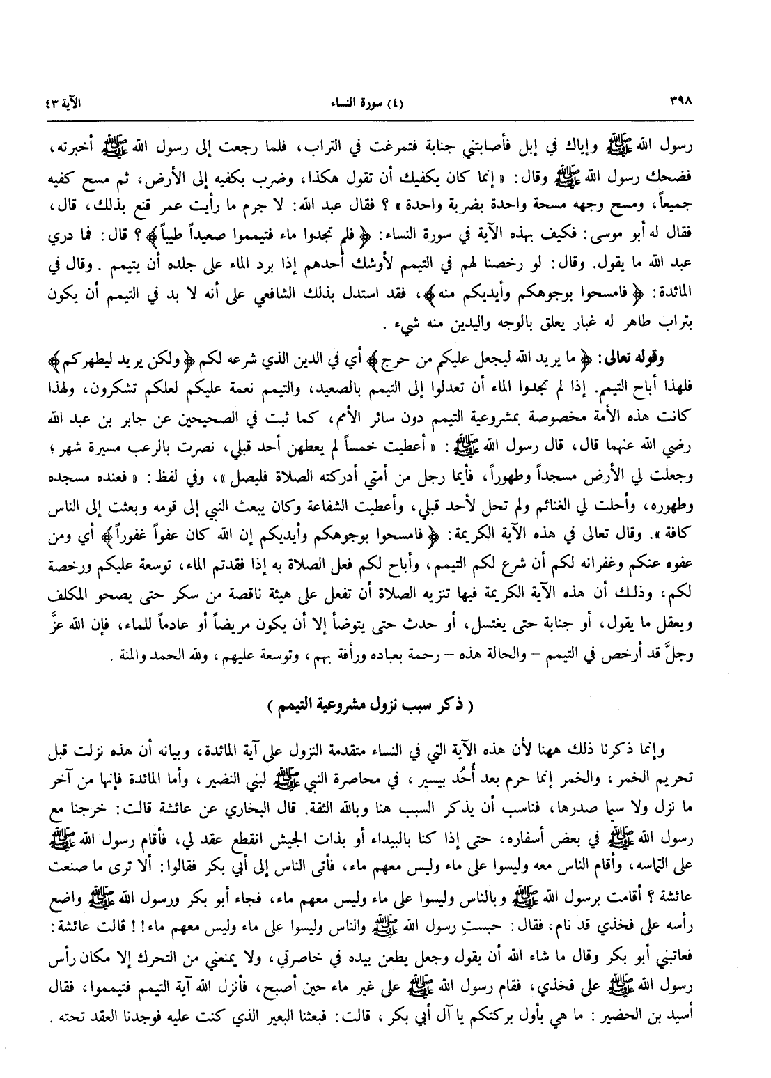 وإنما ذكرنا ذلك ههنا لِأَنَّ هَذِهِ الْآيَةَ الَّتِي فِي النِّسَاءِ مُتَقَدِّمَةُ النُّزُولِ عَلَى آيَةِ الْمَائِدَةِ، وَبَيَانُهُ أَنَّ هَذِهِ نزلت قبل تَحْرِيمِ الْخَمْرِ، وَالْخَمْرُ إِنَّمَا حُرِّمَ بَعْدَ أُحُد بيسير، فِي مُحَاصَرَةِ النَّبِيِّ صَلَّى اللَّهُ عَلَيْهِ وَسَلَّمَ لبني النضير، وأما المائدة فإنها من آخر مانزل وَلَا سِيَّمَا صَدْرُهَا، فَنَاسَبَ أَنْ يُذْكَرَ السَّبَبُ هنا وبالله الثقة. قال البخاري عَنْ عَائِشَةَ قَالَتْ: خَرَجْنَا مَعَ رَسُولِ اللَّهِ صَلَّى اللَّهُ عَلَيْهِ وَسَلَّمَ فِي بَعْضِ أَسْفَارِهِ، حتى إذا كنا بالبيداء أَوْ بِذَاتِ الْجَيْشِ انْقَطَعَ عِقْدٌ لِي، فَأَقَامَ رسول الله صلى الله عليه وسلم على الْتِمَاسِهِ، وَأَقَامَ النَّاسُ مَعَهُ وَلَيْسُوا عَلَى مَاءٍ وَلَيْسَ مَعَهُمْ مَاءٌ، فَأَتَى النَّاسُ إِلَى أَبِي بَكْرٍ فَقَالُوا: أَلَا تَرَى مَا صَنَعَتْ عَائِشَةُ؟ أَقَامَتْ بِرَسُولِ اللَّهِ صَلَّى اللَّهُ عَلَيْهِ وَسَلَّمَ وَبِالنَّاسِ وَلَيْسُوا عَلَى مَاءٍ وَلَيْسَ مَعَهُمْ مَاءٌ، فَجَاءَ أَبُو بَكْرٍ وَرَسُولُ اللَّهِ صَلَّى اللَّهُ عَلَيْهِ وَسَلَّمَ وَاضِعٌ رَأْسَهُ عَلَى فَخِذِي قَدْ نَامَ، فَقَالَ: حبستِ رَسُولَ اللَّهِ صَلَّى اللَّهُ عَلَيْهِ وَسَلَّمَ وَالنَّاسَ وَلَيْسُوا عَلَى مَاءٍ وَلَيْسَ مَعَهُمْ مَاءٌ!! قَالَتْ عَائِشَةُ: فَعَاتَبَنِي أَبُو بَكْرٍ وَقَالَ مَا شَاءَ اللَّهُ أَنْ يَقُولَ وَجَعَلَ يَطْعَنُ بِيَدِهِ فِي خَاصِرَتِي، وَلَا يَمْنَعُنِي مِنَ التحرك إلا مكان رَأْسِ رَسُولِ اللَّهِ صَلَّى اللَّهُ عَلَيْهِ وَسَلَّمَ عَلَى فَخِذِي، فَقَامَ رَسُولُ اللَّهِ صَلَّى اللَّهُ عَلَيْهِ وَسَلَّمَ على غير ماء حين أصبح، فأنزل الله آية التيمم فتيموا، فَقَالَ أُسَيْدُ بْنُ الْحُضَيْرِ: مَا هِيَ بِأَوَّلِ بَرَكَتِكُمْ يَا آلَ أَبِي بَكْرٍ، قَالَتْ: فَبَعَثْنَا الْبَعِيرَ الَّذِي كُنْتُ عَلَيْهِ فَوَجَدْنَا الْعِقْدَ تَحْتَهُ.