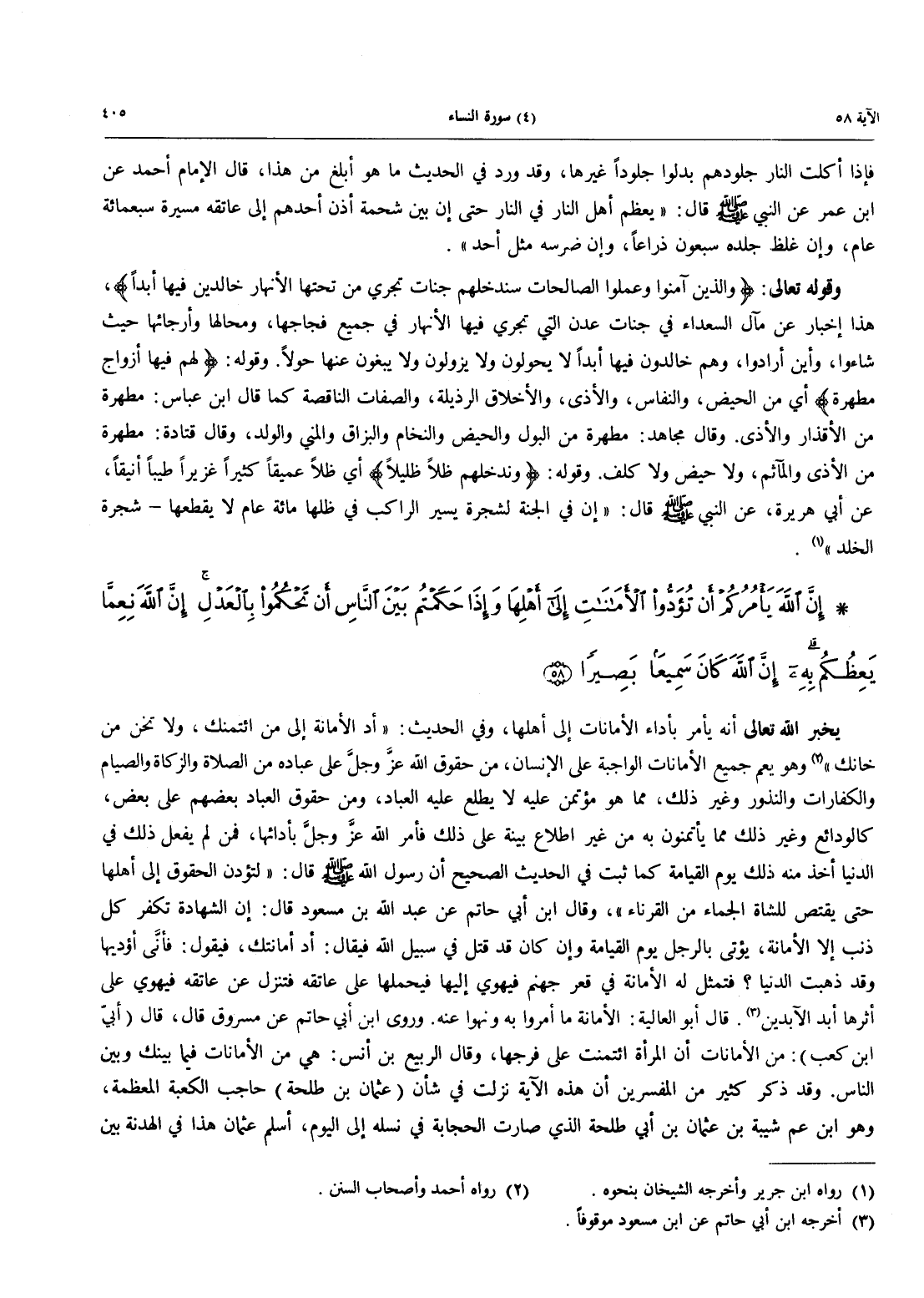 - 58 - إِنَّ اللَّهَ يَأْمُرُكُمْ أَن تُؤدُّواْ الْأَمَانَاتِ إِلَى أَهْلِهَا وَإِذَا حَكَمْتُمْ بَيْنَ النَّاسِ أَن تَحْكُمُواْ بِالْعَدْلِ إِنَّ اللَّهَ نِعِمَّا يَعِظُكُمْ بِهِ إِنَّ الله كَانَ سميعا بصيرا
