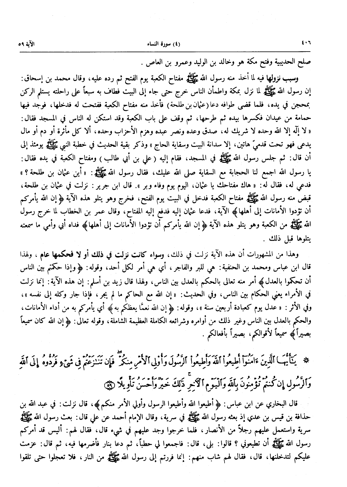 وَهَذَا مِنَ الْمَشْهُورَاتِ أَنَّ هَذِهِ الْآيَةَ نَزَلَتْ في ذلك، وسواء كانت فِي ذَلِكَ أَوْ لَا فَحَكَمُهَا عَامٌّ، وَلِهَذَا قَالَ ابْنُ عَبَّاسٍ وَمُحَمَّدُ بْنُ الْحَنَفِيَّةِ: هِيَ لِلْبَرِّ وَالْفَاجِرِ، أَيْ هِيَ أَمْرٌ لِكُلِّ أَحَدٍ، وَقَوْلُهُ: {وَإِذَا حَكَمْتُمْ بَيْنَ النَّاسِ أَن تَحْكُمُواْ بِالْعَدْلِ} أَمْرٌ مِنْهُ تَعَالَى بِالْحُكْمِ بِالْعَدْلِ بَيْنَ الناس، ولهذا قال زيد بن أسلم: أن هذه الآية: إِنَّمَا نَزَلَتْ فِي الْأُمَرَاءِ يَعْنِي الْحُكَّامِ بَيْنَ النَّاسِ، وَفِي الْحَدِيثِ: «إِنِ اللَّهَ مَعَ الْحَاكِمِ مَا لَمْ يَجُرْ، فَإِذَا جَارَ وَكَلَهُ إِلَى نَفْسِهِ»، وَفِي الْأَثَرِ: «عَدْلُ يَوْمٍ كَعِبَادَةِ أَرْبَعِينَ سَنَةً»، وَقَوْلُهُ: {إِنَّ اللَّهَ نعمَّا يَعِظُكُمْ بِهِ} أَيْ يَأْمُرُكُمْ بِهِ مِنْ أَدَاءِ الْأَمَانَاتِ، وَالْحُكْمِ بِالْعَدْلِ بَيْنَ النَّاسِ وَغَيْرِ ذَلِكَ مِنْ أَوَامِرِهِ وشرائعه الكاملة العظيمة الشاملة، وقوله تعالى: {إِنَّ الله كَانَ سَمِيعاً بَصِيراً} سميعاً لأقوالكم، بصيراً بأفعالكم.
