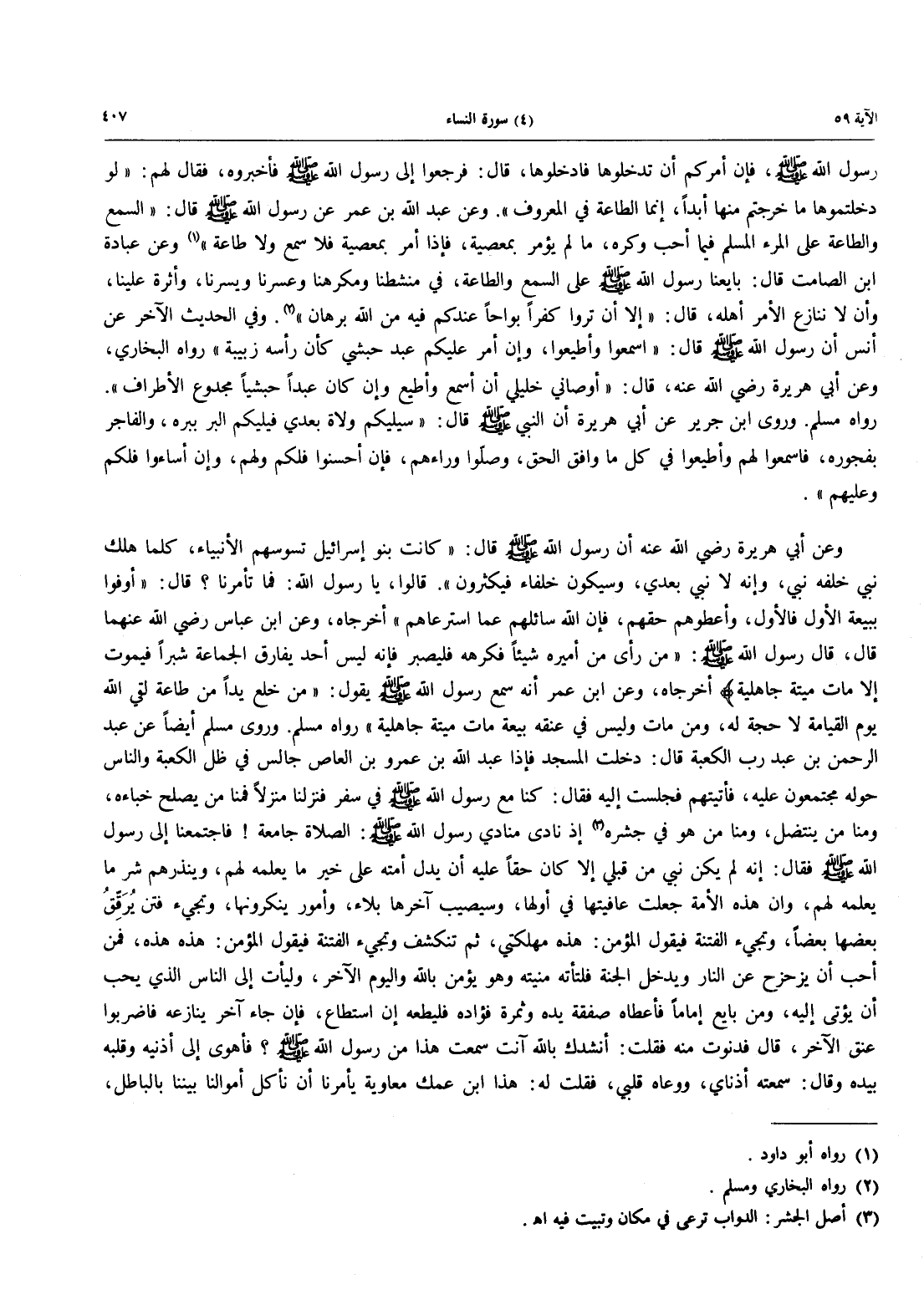 وَعَنْ أَبِي هُرَيْرَةَ رَضِيَ اللَّهُ عَنْهُ أَنَّ رَسُولَ اللَّهِ صَلَّى اللَّهُ عَلَيْهِ وسلم قال: «كانت بنوا إِسْرَائِيلَ تَسُوسُهُمُ الْأَنْبِيَاءُ، كُلَّمَا هَلَكَ نَبِيٌّ خَلَفَهُ نَبِيٌّ، وَإِنَّهُ لَا نَبِيَّ بَعْدِي، وَسَيَكُونُ خُلَفَاءُ فَيَكْثُرُونَ». قَالُوا، يَا رَسُولَ اللَّهِ: فَمَا تَأْمُرُنَا؟ قَالَ: «أَوْفُوا بِبَيْعَةِ الْأَوَّلِ فَالْأَوَّلِ، وَأَعْطَوْهُمْ حَقَّهُمْ، فَإِنَّ اللَّهَ سَائِلُهُمْ عَمَّا اسْتَرْعَاهُمْ» أَخْرَجَاهُ، وَعَنِ ابْنِ عَبَّاسٍ رَضِيَ اللَّهُ عَنْهُمَا قَالَ، قَالَ رَسُولُ اللَّهِ صلى الله عليه وسلم: "من رَأَى مِنْ أَمِيرِهِ شَيْئًا فَكَرِهَهُ فَلْيَصْبِرْ فَإِنَّهُ لَيْسَ أَحَدٌ يُفَارِقُ الْجَمَاعَةَ شِبْرًا فَيَمُوتُ إِلَّا مَاتَ مِيتَةً جَاهِلِيَّةً} أَخْرَجَاهُ، وَعَنِ ابْنِ عُمَرَ أَنَّهُ سَمِعَ رَسُولَ اللَّهِ صَلَّى اللَّهُ عَلَيْهِ وَسَلَّمَ يَقُولُ: «مَنْ خَلَعَ يَدًا مِنْ طَاعَةٍ لَقِيَ اللَّهَ يَوْمَ الْقِيَامَةِ لَا حُجَّةَ لَهُ، وَمَنْ مَاتَ وَلَيْسَ فِي عُنُقِهِ بَيْعَةٌ مَاتَ مِيتَةً جَاهِلِيَّةً» رَوَاهُ مُسْلِمٌ وَرَوَى مُسْلِمٌ أَيْضًا عَنْ عَبْدِ الرَّحْمَنِ بْنِ عَبْدِ رَبِّ الْكَعْبَةِ قَالَ: دَخَلْتُ الْمَسْجِدَ فَإِذَا عَبْدُ اللَّهِ بْنُ عَمْرِو بْنِ الْعَاصِ جَالِسٌ فِي ظِلِّ الْكَعْبَةِ وَالنَّاسُ حَوْلَهُ مُجْتَمِعُونَ عَلَيْهِ، فَأَتَيْتُهُمْ فَجَلَسْتُ إِلَيْهِ فَقَالَ: كُنَّا مَعَ رَسُولِ اللَّهِ صَلَّى اللَّهُ عَلَيْهِ وَسَلَّمَ في سفر فنزلنا منزلاً فما مَنْ يُصْلِحُ خِبَاءَهُ، وَمِنَّا مَنْ يَنْتَضِلُ، وَمِنَّا من هو في جشره (أصل الجشر: الدواب ترعى في مكان وتبيت فيه اهـ) إذا نَادَى مُنَادِي رَسُولِ اللَّهِ صَلَّى اللَّهُ عَلَيْهِ وَسَلَّمَ الصَّلَاةُ جَامِعَةٌ! فَاجْتَمَعْنَا إِلَى رَسُولِ اللَّهِ صَلَّى اللَّهُ عَلَيْهِ وَسَلَّمَ فَقَالَ: إِنَّهُ لَمْ يكن نبي من قَبْلِي إِلَّا كَانَ حَقًا عَلَيْهِ أَنْ يَدُلَّ أُمَّتَهُ عَلَى خَيْرِ مَا يَعْلَمُهُ لَهُمْ، وَيُنْذِرَهُمْ شر ما يعلمه لهم، وإن هذه الأمة جعلت عَافِيَتُهَا فِي أَوَّلِهَا، وَسَيُصِيبُ آخِرَهَا بَلَاءٌ، وَأُمُورٌ ينكرونها، وتجيء فتن يُرَقِّقُ بَعْضُهَا بَعْضًا، وَتَجِيءُ الْفِتْنَةُ فَيَقُولُ الْمُؤْمِنُ: هَذِهِ مُهْلِكَتِي، ثُمَّ تَنْكَشِفُ وَتَجِيءُ الْفِتْنَةُ فَيَقُولُ الْمُؤْمِنُ: هَذِهِ هَذِهِ، فَمَنْ أَحَبَّ أَنْ يُزَحْزَحَ عَنِ النَّارِ وَيَدْخُلَ الْجَنَّةَ فَلْتَأْتِهِ مَنِيَّتُهُ وَهُوَ يُؤْمِنُ بالله واليوم الآخر، وليأتي إِلَى النَّاسِ الَّذِي يُحِبُّ أَنْ يُؤْتَى إِلَيْهِ، وَمَنْ بَايَعَ إِمَامًا فَأَعْطَاهُ صَفْقَةَ يَدِهِ وَثَمَرَةَ فؤاده فَلْيُطِعْهُ إِنِ اسْتَطَاعَ، فَإِنْ جَاءَ آخَرُ يُنَازِعُهُ فَاضْرِبُوا عُنُقَ الْآخَرِ، قَالَ فَدَنَوْتُ مِنْهُ فَقُلْتُ: أَنْشُدُكَ بِاللَّهِ أَنْتَ؟؟ سَمِعْتَ هَذَا مِنْ رَسُولِ اللَّهِ صَلَّى اللَّهُ عَلَيْهِ وَسَلَّمَ؟ فَأَهْوَى إِلَى أذنيه وقلبه بيده وَقَالَ: سَمِعَتْهُ أُذُنَايَ، وَوَعَاهُ قَلْبِي، فَقُلْتُ لَهُ: هَذَا ابْنُ عَمِّكَ مُعَاوِيَةُ يَأْمُرُنَا أَنْ نَأْكُلَ أموالنا بيننا بالباطل،