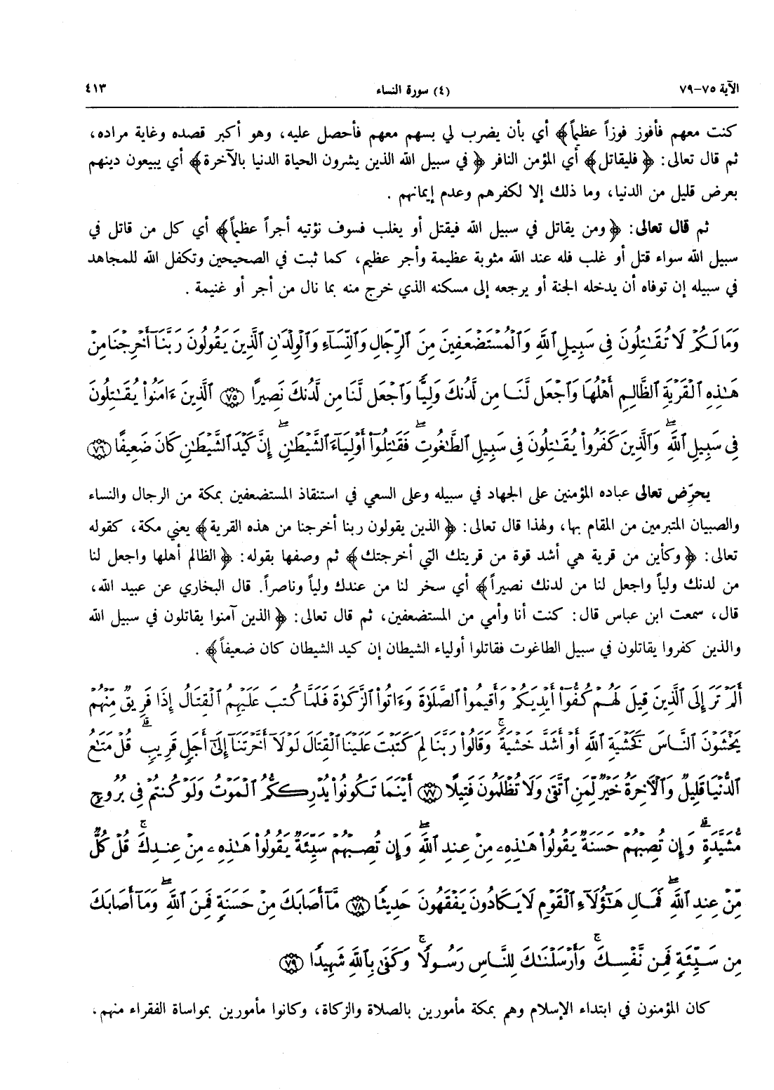 يحرِّض تَعَالَى عِبَادَهُ الْمُؤْمِنِينَ عَلَى الْجِهَادِ فِي سَبِيلِهِ وَعَلَى السَّعْيِ فِي اسْتِنْقَاذِ الْمُسْتَضْعَفِينَ بِمَكَّةَ مِنَ الرِّجَالِ وَالنِّسَاءِ وَالصِّبْيَانِ الْمُتَبَرِّمِينَ من المقام بِهَا، وَلِهَذَا قَالَ تَعَالَى: {الَّذِينَ يَقُولُونَ رَبَّنَآ أَخْرِجْنَا مِنْ هَذِهِ الْقَرْيَةِ} يَعْنِي مَكَّةَ، كَقَوْلِهِ تَعَالَى: {وَكَأَيِّن مِّن قَرْيَةٍ هِيَ أَشَدُّ قُوَّةً مِّن قَرْيَتِكَ التي أخرجتك} ثُمَّ وَصَفَهَا بِقَوْلِهِ: {الظَّالِمِ أَهْلُهَا وَاجْعَلْ لَنَا مِن لَّدُنْكَ وَلِيّاً واجعل لَّنَا مِن لَّدُنْكَ نَصِيراً} أَيْ سَخِّرْ لَنَا مِنْ عِنْدِكَ وَلِيًّا وناصراً. قال البخاري عَنْ عُبَيْدِ اللَّهِ، قَالَ، سَمِعْتُ ابْنَ عَبَّاسٍ قال: كنت أنا وأمي من المستضعفين، ثُمَّ قَالَ تَعَالَى: {الَّذِينَ آمَنُوا يُقَاتِلُونَ فِي سَبِيلِ الله والذي كَفَرُواْ يُقَاتِلُونَ فِي سَبِيلِ الطَّاغُوتِ فَقَاتِلُوا أَوْلِيَاءَ الشَّيْطَانِ إِنَّ كَيْدَ الشَّيْطَانِ كَانَ ضَعِيفًا}.