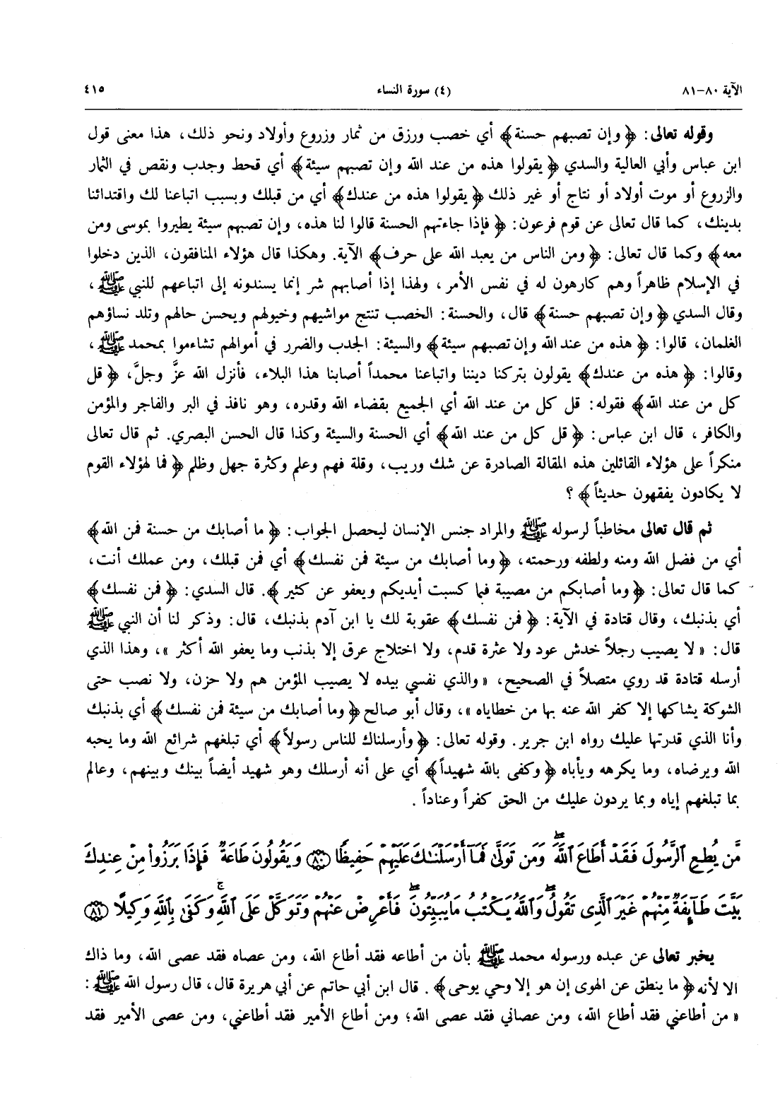وقوله تعالى: {وَإِن تُصِبْهُمْ حَسَنَةٌ} أَيْ خِصْبٌ وَرِزْقٌ مِنْ ثمار وزروع وأولاد ونحو ذلك، وهذا مَعْنَى قَوْلِ ابْنِ عَبَّاسٍ وَأَبِي الْعَالِيَةِ وَالسُّدِّيِّ {يَقُولُواْ هَذِهِ مِنْ عِندِ اللَّهِ وَإِن تُصِبْهُمْ سَيِّئَةٌ} أَيْ قَحْطٌ وَجَدْبٌ وَنَقْصٌ فِي الثِّمَارِ وَالزُّرُوعِ أَوْ مَوْتُ أَوْلَادٍ أَوْ نَتَاجٍ أَوْ غير ذلك {يَقُولُواْ هَذِهِ مِنْ عِندِكَ} أَيْ مِنْ قِبَلِكَ وَبِسَبَبِ اتِّبَاعِنَا لَكَ وَاقْتِدَائِنَا بِدِينِكَ، كَمَا قَالَ تَعَالَى عَنْ قَوْمِ فِرْعَوْنَ: {فَإِذَا جَآءَتْهُمُ الْحَسَنَةُ قَالُواْ لَنَا هَذِهِ، وَإِن تُصِبْهُمْ سَيِّئَةٌ يَطَّيَّرُواْ بِمُوسَى وَمَن معه} وَكَمَا قَالَ تَعَالَى: {وَمِنَ النَّاسِ مَنْ يَعْبُدُ اللَّهَ عَلَى حَرْفٍ} الآية. وَهَكَذَا قَالَ هَؤُلَاءِ الْمُنَافِقُونَ، الَّذِينَ دَخَلُوا فِي الْإِسْلَامِ ظَاهِرًا وَهُمْ كَارِهُونَ لَهُ فِي نَفْسِ الْأَمْرِ، وَلِهَذَا إِذَا أَصَابَهُمْ شَرٌّ إِنَّمَا يَسْنُدُونَهُ إِلَى اتِّبَاعِهِمْ لِلنَّبِيِّ صَلَّى اللَّهُ عَلَيْهِ وَسَلَّمَ، وَقَالَ السُّدِّيُّ {وَإِن تُصِبْهُمْ حَسَنَةٌ} قَالَ، وَالْحَسَنَةُ: الخصب تنتج مواشيهم وخيولهم ويحسن حالهم وَتَلِدُ نِسَاؤُهُمُ الْغِلْمَانَ، قَالُوا: {هَذِهِ مِنْ عِندِ اللَّهِ وَإِن تُصِبْهُمْ سَيِّئَةٌ} وَالسَّيِّئَةُ: الْجَدْبُ وَالضَّرَرُ فِي أَمْوَالِهِمْ تَشَاءَمُوا بِمُحَمَّدٍ صَلَّى اللَّهُ عَلَيْهِ وَسَلَّمَ وَقَالُوا: {هَذِهِ مِنْ عِندِكَ} يَقُولُونَ بِتَرْكِنَا ديننا وَاتِّبَاعِنَا مُحَمَّدًا أَصَابَنَا هَذَا الْبَلَاءُ، فَأَنْزَلَ اللَّهُ عزَّ وجلَّ، {قُلْ كُلٌّ مِّنْ عِنْدِ اللَّهِ} فَقَوْلُهُ: قُلْ كُلٌّ مِّنْ عِندَ اللَّهِ أَيِ الْجَمِيعُ بِقَضَاءِ اللَّهِ وَقَدَرِهِ، وَهُوَ نَافِذٌ فِي البر والفاجر والمؤمن والكافر، قال ابْنِ عَبَّاسٍ: {قُلْ كُلٌّ مِّنْ عِندَ اللَّهِ} أَيِ الْحَسَنَةُ وَالسَّيِّئَةُ وَكَذَا قَالَ الْحَسَنُ الْبَصْرِيُّ. ثُمَّ قَالَ تَعَالَى مُنْكِرًا عَلَى هَؤُلَاءِ الْقَائِلِينَ هَذِهِ الْمَقَالَةِ الصَّادِرَةِ عَنْ شَكٍّ وَرَيْبٍ، وَقِلَّةِ فهم وعلم وكثرة جهل وظلم {فما لهؤلاء القوم لاَ يَكَادُونَ يَفْقَهُونَ حَدِيثاً}؟