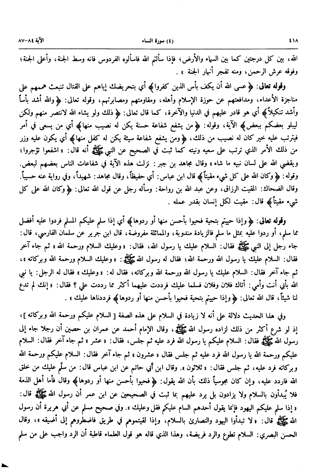 وقوله تَعَالَى: {وَإِذَا حُيِّيتُم بِتَحِيَّةٍ فَحَيُّواْ بِأَحْسَنَ مِنْهَآ أَوْ رُدُّوهَآ} أَيْ إِذَا سَلَّمَ عَلَيْكُمُ الْمُسْلِمُ فَرَدُّوا عَلَيْهِ أَفْضَلَ مِمَّا سَلَّمَ، أَوْ رَدُّوا عَلَيْهِ بِمِثْلِ مَا سلم فَالزِّيَادَةُ مَنْدُوبَةٌ، وَالْمُمَاثَلَةُ مَفْرُوضَةٌ، قَالَ ابْنُ جَرِيرٍ عَنْ سَلْمَانَ الْفَارِسِيِّ، قَالَ: جَاءَ رَجُلٌ إِلَى النَّبِيِّ صَلَّى اللَّهُ عَلَيْهِ وَسَلَّمَ فَقَالَ: السَّلَامُ عَلَيْكَ يَا رَسُولَ اللَّهِ، فَقَالَ: «وَعَلَيْكَ السَّلَامُ ورحمة الله» ثُمَّ جَاءَ آخَرُ فَقَالَ: السَّلَامُ عَلَيْكَ يَا رَسُولَ اللَّهِ وَرَحْمَةُ اللَّهِ؛ فَقَالَ لَهُ رَسُولُ اللَّهِ صَلَّى اللَّهُ عَلَيْهِ وَسَلَّمَ: «وَعَلَيْكَ السَّلَامُ وَرَحْمَةُ اللَّهِ وَبَرَكَاتُهُ»، ثُمَّ جَاءَ آخَرُ فَقَالَ: السَّلَامُ عَلَيْكَ يَا رَسُولَ اللَّهِ وَرَحْمَةُ اللَّهِ وبركات، فَقَالَ لَهُ: «وَعَلَيْكَ» فَقَالَ لَهُ الرَّجُلُ: يَا نَبِيَّ اللَّهِ بِأَبِي أَنْتَ وَأُمِّي: أَتَاكَ فُلَانٌ وفلان فسلما عليك فرددت عليهم أَكْثَرَ مِمَّا رَدَدْتَ عَلَيَّ؟ فَقَالَ: "إِنَّكَ لَمْ تَدَعْ لَنَا شَيْئًا، قَالَ اللَّهُ تَعَالَى: {وَإِذَا حُيِّيتُم بِتَحِيَّةٍ فَحَيُّواْ بِأَحْسَنَ مِنْهَآ أَوْ رُدُّوهَآ} فرددناها عليك"