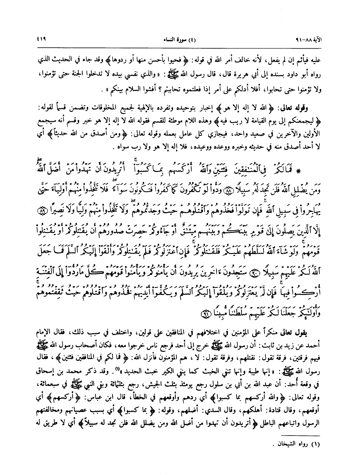 يَقُولُ تَعَالَى مُنْكِرًا عَلَى الْمُؤْمِنِينَ فِي اخْتِلَافِهِمْ فِي الْمُنَافِقِينَ عَلَى قَوْلَيْنِ، وَاخْتُلِفَ في سبب ذلك، فقال الإمام أحمد عَنْ زَيْدِ بْنِ ثَابِتٍ: أَنَّ رَسُولَ اللَّهِ صَلَّى اللَّهُ عَلَيْهِ وَسَلَّمَ خَرَجَ إِلَى أُحُدٍ فَرَجَعَ نَاسٌ خَرَجُوا مَعَهُ، فَكَانَ أَصْحَابُ رَسُولِ اللَّهِ صَلَّى اللَّهُ عَلَيْهِ وَسَلَّمَ فِيهِمْ فِرْقَتَيْنِ، فرقة تقول: نقتلهم، وفرقة تقول: لا، هم المؤمنون فأنزل الله: {فما لهم فِي الْمُنَافِقِينَ فِئَتَيْنِ}، فَقَالَ رَسُولُ اللَّهِ صَلَّى اللَّهُ عَلَيْهِ وَسَلَّمَ: «إِنَّهَا طَيْبَةُ وَإِنَّهَا تَنْفِي الخبث كما ينفي الكير خبث الحديد» (رواه الشيخان) وقد ذكر محمد بن إسحاق فِي وَقْعَةِ أُحد: أَنَّ عَبْدَ اللَّهِ بْنَ أُبي بْنِ سَلُولٍ رجع يومئذ بثلث الجيش، رجع بثلثمائة وَبَقِيَ النَّبِيُّ صَلَّى اللَّهُ عَلَيْهِ وَسَلَّمَ فِي سبعمائة، وقوله تعالى: {وَاللَّهُ أَرْكَسَهُمْ بِمَا كَسَبُوا} أَيْ رَدَّهُمْ وَأَوْقَعَهُمْ فِي الْخَطَأِ، قَالَ ابْنُ عَبَّاسٍ: {أَرْكَسَهُمْ} أَيْ أَوْقَعَهُمْ، وَقَالَ قَتَادَةُ: أَهْلَكَهُمْ، وَقَالَ السُّدِّيُّ: أَضَلَّهُمْ، وَقَوْلُهُ: {بِمَا كَسَبُوا} أَيْ بِسَبَبِ عِصْيَانِهِمْ وَمُخَالَفَتِهِمُ الرَّسُولَ وَاتِّبَاعِهِمُ الْبَاطِلَ {أَتُرِيدُونَ أَن تَهْدُواْ مَنْ أَضَلَّ اللَّهُ وَمَن يُضْلِلِ اللَّهُ فَلَن تَجِدَ لَهُ سَبِيلاً} أَيْ لَا طَرِيقَ لَهُ