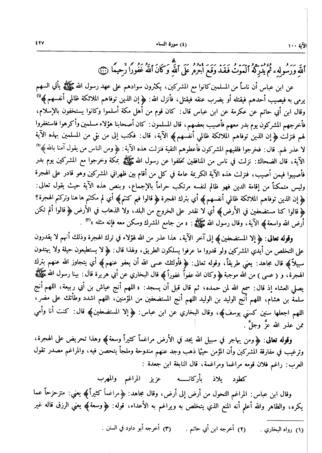 عن ابْنُ عَبَّاسٍ أَنَّ نَاسًا مِنَ الْمُسْلِمِينَ كَانُوا مع المشركين، يكثرون سوادهم عَلَى عَهْدِ رَسُولِ اللَّهِ صَلَّى اللَّهُ عَلَيْهِ وسلم يأتي السهم يرمى بِهِ فَيُصِيبُ أَحَدَهُمْ فَيَقْتُلُهُ أَوْ يُضْرَبُ عُنُقُهُ فيقتل، فأنزل الله: {إِنَّ الَّذِينَ تَوَفَّاهُمُ الْمَلَائِكَةُ ظَالِمِي أَنْفُسِهِمْ} (رَوَاهُ البخاري) وقال ابن أبي حاتم عَنْ عِكْرِمَةَ عَنِ ابْنِ عَبَّاسٍ قَالَ: كَانَ قَوْمٌ مِنْ أَهْلِ مَكَّةَ أَسْلَمُوا وَكَانُوا يَسْتَخِفُونَ بِالْإِسْلَامِ، فَأَخْرَجَهُمُ الْمُشْرِكُونَ يَوْمَ بَدْرٍ مَعَهُمْ فَأُصِيبَ بعضهم، قَالَ الْمُسْلِمُونَ: كَانَ أَصْحَابُنَا هَؤُلَاءِ مُسْلِمِينَ وَأُكْرِهُوا فَاسْتَغْفَرُوا لَهُمْ فَنَزَلَتْ {إِنَّ الَّذِينَ تَوَفَّاهُمُ الْمَلَائِكَةُ ظالمي أَنْفُسِهِمْ} الْآيَةِ، قَالَ: فَكَتَبَ إِلَى مَنْ بَقِيَ مِنَ الْمُسْلِمِينَ بِهَذِهِ الْآيَةِ لَا عُذْرَ لَهُمْ. قَالَ: فخرجوا فلقيهم المشركون فأعطوهم التقية فَنَزَلَتْ هَذِهِ الْآيَةُ: {وَمِنَ النَّاسِ مَنْ يِقُولُ آمَنَّا بالله} (أخرجه ابن أبي حاتم) الآية، قال الضَّحَّاكُ: نَزَلَتْ فِي نَاسٍ مِنَ الْمُنَافِقِينَ تَخَلَّفُوا عَنْ رَسُولِ اللَّهِ صَلَّى اللَّهُ عَلَيْهِ وَسَلَّمَ بِمَكَّةَ وَخَرَجُوا مَعَ الْمُشْرِكِينَ يَوْمَ بَدْرٍ فَأُصِيبُوا فِيمَنْ أُصِيبَ، فَنَزَلَتْ هَذِهِ الْآيَةُ الْكَرِيمَةُ عَامَّةً فِي كُلِّ مَنْ أَقَامَ بَيْنَ ظَهَرَانَيِ الْمُشْرِكِينَ وَهُوَ قَادِرٌ عَلَى الْهِجْرَةِ وَلَيْسَ مُتَمَكِّنًا مِنْ إِقَامَةِ الدِّينِ فَهُوَ ظَالِمٌ لِنَفْسِهِ مُرْتَكِبٌ حَرَامًا بِالْإِجْمَاعِ، وَبِنَصِّ هَذِهِ الْآيَةِ حَيْثُ يَقُولُ تَعَالَى: {إِنَّ الَّذِينَ تَوَفَّاهُمُ الْمَلَائِكَةُ ظَالِمِي أَنْفُسِهِمْ} أَيْ بِتَرْكِ الْهِجْرَةِ {قَالُواْ فِيمَ كُنتُمْ} أَيْ لِمَ مكثتم ها هنا وَتَرَكْتُمُ الْهِجْرَةَ؟ {قَالُواْ كُنَّا مُسْتَضْعَفِينَ فِي الْأَرْضِ} أَيْ لَا نَقْدِرُ عَلَى الْخُرُوجِ مِنَ الْبَلَدِ، وَلَا الذَّهَابِ فِي الْأَرْضِ {قَالُوا أَلَمْ تَكُنْ أَرْضُ الله وَاسِعَةً} الآية، وَقَالَ رَسُولُ اللَّهِ صَلَّى اللَّهُ عَلَيْهِ وَسَلَّمَ: «مَنْ جَامَعَ الْمُشْرِكَ وَسَكَنَ مَعَهُ فَإِنَّهُ مِثْلُهُ» (أخرجه أبو داود في السنن)