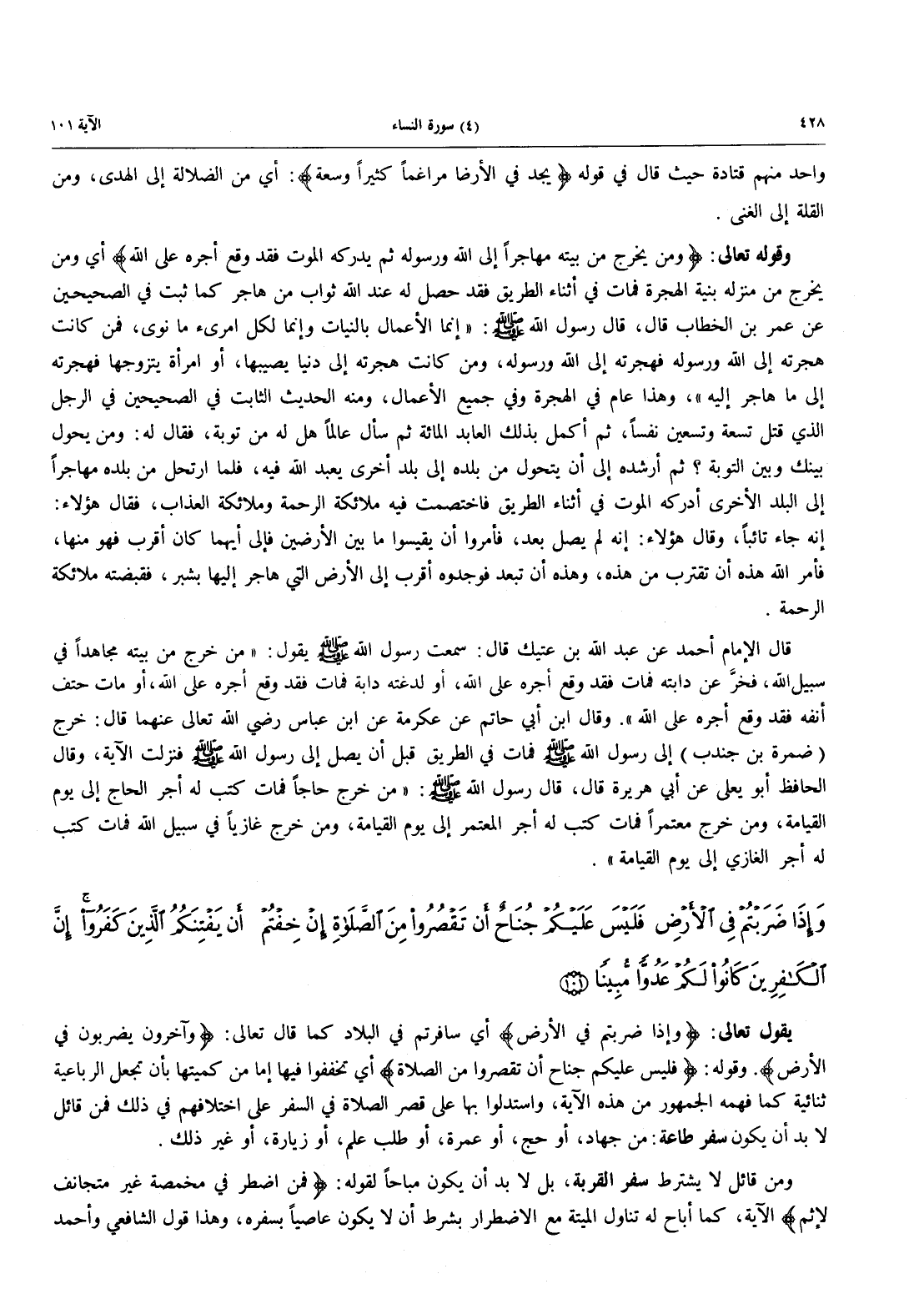- 101 - وَإِذَا ضَرَبْتُمْ فِي الْأَرْضِ فَلَيْسَ عَلَيْكُمْ جُنَاحٌ أَن تَقْصُرُواْ مِنَ الصَّلَاةِ إِنْ خِفْتُمْ أَن يَفْتِنَكُمُ الَّذِينَ كَفَرُوا إِنَّ الْكَافِرِينَ كَانُوا لَكُمْ عَدُوًّا مُّبِيناً