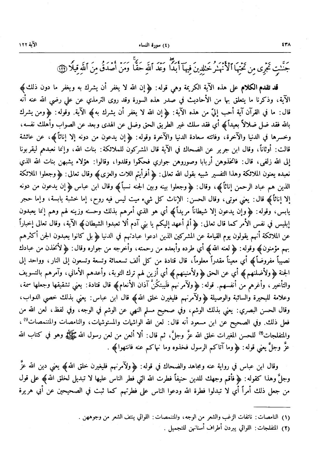 قَدْ تَقَدَّمَ الْكَلَامُ عَلَى هَذِهِ الْآيَةِ الْكَرِيمَةِ وَهِيَ قَوْلُهُ: {إِنَّ اللَّهَ لَا يَغْفِرُ أَنْ يُشْرَكَ بِهِ وَيَغْفِرُ مَا دُونَ ذلك} الآية، وَذَكَرْنَا مَا يَتَعَلَّقُ بِهَا مِنَ الْأَحَادِيثِ فِي صدر هذه السورة وقد روى الترمذي عَنْ عَلِيٍّ رَضِيَ اللَّهُ عَنْهُ أَنَّهُ قَالَ: مَا فِي الْقُرْآنِ آيَةٌ أَحَبَّ إِلَيَّ مِنْ هذه الآية: {إِنَّ اللَّهَ لَا يَغْفِرُ أَنْ يُشْرَكَ بِهِ} الآية. وَقَوْلُهُ: {وَمَن يُشْرِكْ بِاللَّهِ فَقَدْ ضَلَّ ضَلاَلاً بَعِيداً} أَيْ فَقَدْ سَلَكَ غَيْرَ الطَّرِيقِ الْحَقِّ وَضَلَّ عَنِ الْهُدَى وَبَعُدَ عَنِ الصَّوَابِ وَأَهْلَكَ نفسه، وخسرها في الدنيا والآخرة، فاتته سَعَادَةُ الدُّنْيَا وَالْآخِرَةِ وَقَوْلُهُ: {إِن يَدْعُونَ مِن دُونِهِ إِلاَّ إِنَاثاً}، عن عائشة قالت: أوثاناً، وقال ابن جرير عن الضحاك في الآية قال المشركون للملائكة: بَنَاتُ اللَّهِ، وَإِنَّمَا نَعْبُدُهُمْ لِيُقَرِّبُونَآ إِلَى اللَّهِ زلفى، قال: فاتخذوهن أبابا وصوروهن جواري فَحَكَمُوا وَقَلَّدُوا، وَقَالُوا: هَؤُلَاءِ يُشْبِهْنَ بَنَاتَ اللَّهِ الَّذِي نَعْبُدُهُ يَعْنُونُ الْمَلَائِكَةَ وَهَذَا التَّفْسِيرُ شَبِيهٌ بقول الله تعالى: {أَفَرَأَيْتُمُ اللات والعزى} وَقَالَ تَعَالَى: {وَجَعَلُواْ الْمَلَائِكَةَ الَّذِينَ هُمْ عِبَادُ الرَّحْمَنِ إِنَاثاً}، وقال: {وَجَعَلُواْ بَيْنَهُ وَبَيْنَ الجنة نَسَباً} وقال ابْنِ عَبَّاسٍ {إِن يَدْعُونَ مِن دُونِهِ إِلاَّ إِنَاثاً} قال: عني موتى، وقال الْحَسَنُ: الْإِنَاثُ كُلُّ شَيْءٍ مَيِّتٍ لَيْسَ فِيهِ رُوحٌ، إِمَّا خَشَبَةٌ يَابِسَةٌ، وَإِمَّا حَجَرٌ يَابِسٌ، وَقَوْلُهُ: {وَإِن يَدْعُونَ إِلاَّ شَيْطَانًا مَّرِيداً} أَيْ هو الذي أمرهم بذلك وحسنه وزينه لهم وهم إنما يعبدون إبليس في نفسه الأمر كما قال تعالى: {أَلَمْ أَعْهَدْ إليك يا بني آدم إلا تعبدوا الشيطان} الآية، وَقَالَ تَعَالَى إِخْبَارًا عَنِ الْمَلَائِكَةِ أَنَّهُمْ يَقُولُونَ يوم القيامة عن المشركني الذي ادَّعَوْا عِبَادَتَهُمْ فِي الدُّنْيَا {بَلْ كَانُواْ يَعْبُدُونَ الْجِنَّ أَكْثَرُهُم بِهِم مُّؤْمِنُونَ} وقول: {لَّعَنَهُ اللَّهُ} أَيْ طَرَدَهُ وَأَبْعَدَهُ مِنْ رَحْمَتِهِ، وَأَخْرَجَهُ مِنْ جِوَارِهِ وَقَالَ: {لأَتَّخِذَنَّ مِنْ عِبَادِكَ نَصِيباً مَّفْرُوضاً} أَيْ مُعَيَّنًا مُقَدَّرًا مَعْلُومًا، قَالَ قتادة مِنْ كُلِّ أَلْفٍ تِسْعُمِائَةٌ وَتِسْعَةٌ وَتِسْعُونَ إِلَى النَّارِ، وَوَاحِدٌ إِلَى الْجَنَّةِ {وَلأُضِلَّنَّهُمْْ} أَيْ عَنِ الْحَقِّ {وَلأُمَنِّيَنَّهُمْ} أَيْ أُزَيِّنُ لَهُمْ تَرْكَ التَّوْبَةِ، وَأَعِدُهُمُ الْأَمَانِيَ، وَآمُرُهُمْ بِالتَّسْوِيفِ وَالتَّأْخِيرِ، وَأَغُرُّهُمْ مِنْ أنفسهم. قوله: {وَلأَمُرَنَّهُمْ فلّيبتكنَّ آذَانَ الأنعام} قال قتادة يَعْنِي تَشْقِيقَهَا وَجَعْلَهَا سِمَةً، وَعَلَامَةً لِلْبَحِيرَةِ وَالسَّائِبَةِ والوصيلة {وَلأَمُرَنَّهُمْ فَلَيُغَيِّرُنَّ خَلْقَ اللَّهِ} قَالَ ابْنُ عَبَّاسٍ: يعني بذللك خصي الدواب، وقال الْحَسَنِ الْبَصْرِيُّ: يَعْنِي بِذَلِكَ الْوَشْمَ، وَفِي صَحِيحِ مُسْلِمٍ النَّهْيُ عَنِ الْوَشْمِ فِي الْوَجْهِ، وَفِي لَفْظٍ، لَعَنَ اللَّهُ مَنْ فَعَلَ ذَلِكَ. وَفِي الصَّحِيحِ عَنِ ابْنِ مَسْعُودٍ أَنَّهُ قَالَ: لَعَنَ الله الواشمات والمستوشمات، والنامصات والمتنمصات (النامصات: ناتفات الزغب والشعر من الوجه، والمتنمصات: اللواتي ينتف الشعر من وجوههن) والمتفلجات (المتفلجات: اللواتي يبردن أطراف أسنانهن للتجميل) للحُسْن الْمُغَيِّرَاتِ خَلْقَ اللَّهِ عزَّ وجلَّ، ثُمَّ قَالَ أَلَا أَلْعَنُ مَنْ لَعَنَ رَسُولُ اللَّهِ صَلَّى اللَّهُ عَلَيْهِ وَسَلَّمَ وَهُوَ فِي كِتَابِ اللَّهِ عزَّ وجلَّ يَعْنِي قَوْلَهُ: {وَمَآ آت