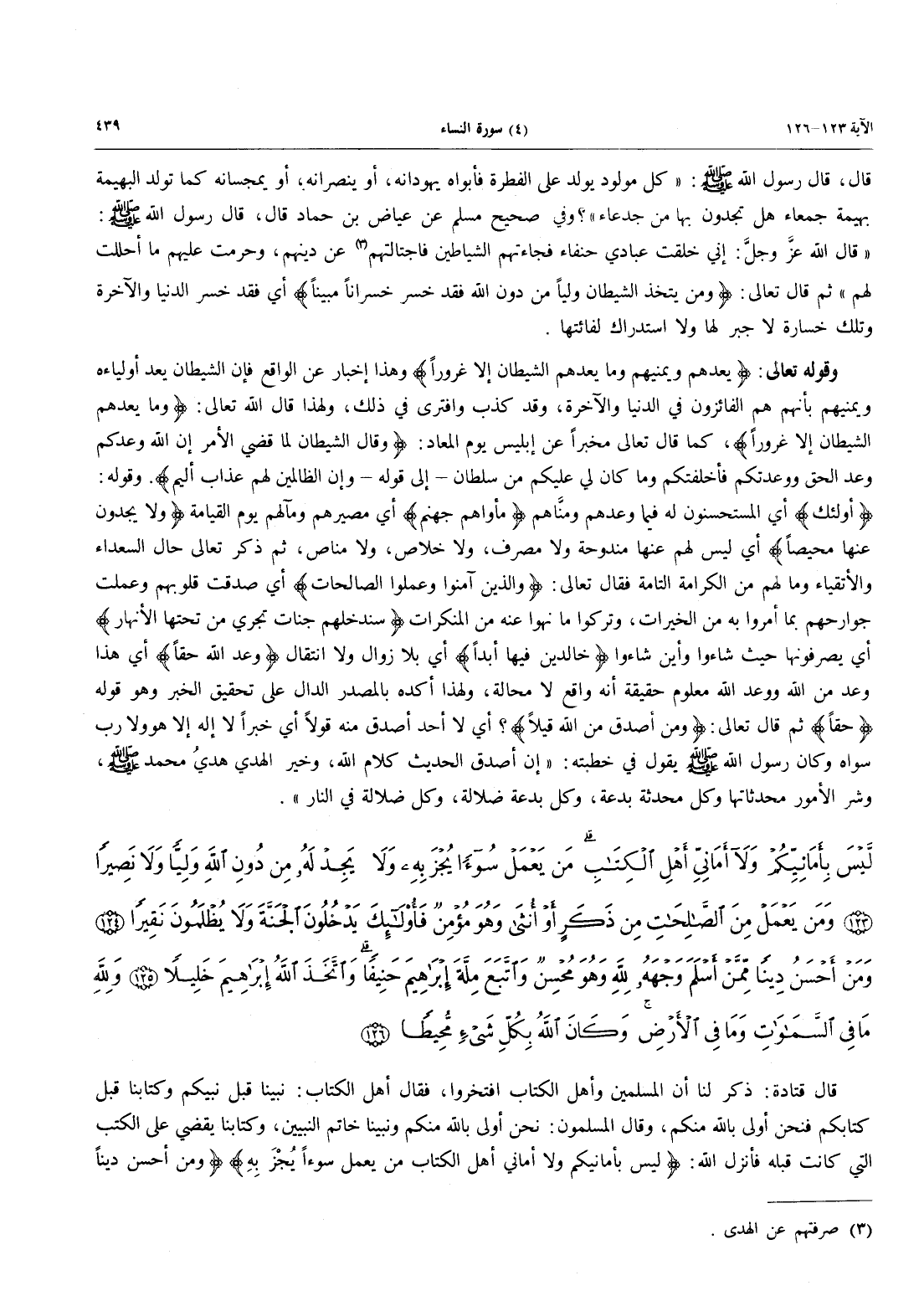 قَالَ، قَالَ رَسُولُ اللَّهِ صَلَّى اللَّهُ عَلَيْهِ وَسَلَّمَ: «كُلُّ مَوْلُودٍ يُولَدُ عَلَى الْفِطْرَةِ فَأَبَوَاهُ يُهَوِّدَانِهِ، أَوْ يُنَصِّرَانِهِ، أَوْ يُمَجِّسَانِهِ كَمَا تُولَدُ البهيمة بهيمة جمعاء هل تجدون بها مِنْ جَدْعَاءَ»؟ وَفِي صَحِيحِ مُسْلِمٍ عَنْ عِيَاضِ بن حماد قَالَ، قَالَ رَسُولُ اللَّهِ صَلَّى اللَّهُ عَلَيْهِ وَسَلَّمَ: "قَالَ اللَّهُ عَزَّ وجلَّ: إِنِّي خَلَقْتُ عِبَادِي حُنَفَاءَ فجاءتهم الشياطين فاجتالتهم (صرفتهم عن الهدى) عَنْ دِينِهِمْ، وَحَرَّمَتْ عَلَيْهِمْ مَا أَحْلَلْتُ لَهُمْ" ثم قال تَعَالَى: {وَمَن يَتَّخِذِ الشَّيْطَانَ وَلِيّاً مِّن دُونِ اللَّهِ فَقَدْ خَسِرَ خُسْرَاناً مُّبِيناً} أَيْ فَقَدْ خَسِرَ الدُّنْيَا وَالْآخِرَةِ وَتِلْكَ خَسَارَةٌ لَا جَبْرَ لها ولا استدراك لفائتها.