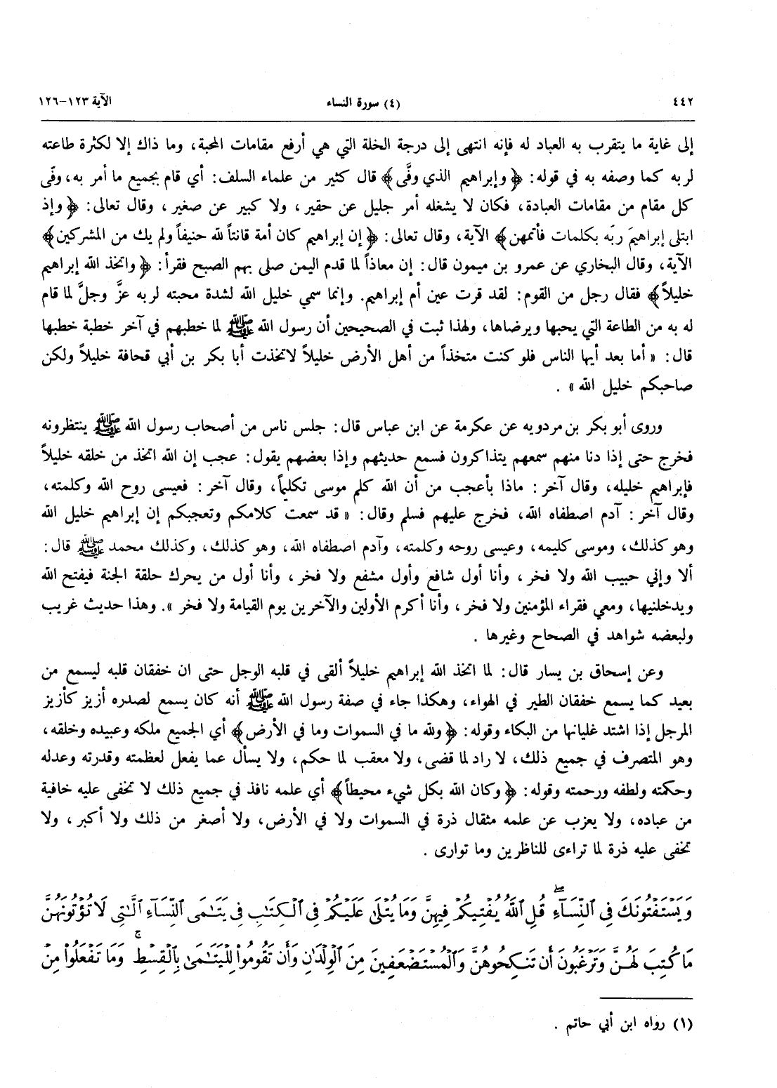 إلى غاية ما يتقرب به العباد فإنه انتهى إلى درجة الخلة التي أَرْفَعُ مَقَامَاتِ الْمُحِبَّةِ، وَمَا ذَاكَ إِلَّا لِكَثْرَةِ طَاعَتِهِ لِرَبِّهِ كَمَا وَصَفَهُ بِهِ فِي قَوْلِهِ: {وَإِبْرَاهِيمَ الذي وفَّى} قال كثير من علماء السَّلَفِ: أَيْ قَامَ بِجَمِيعِ مَا أُمِرَ بِهِ، وفي كُلَّ مَقَامٍ مِنْ مَقَامَاتِ الْعِبَادَةِ، فَكَانَ لَا يَشْغَلُهُ أَمْرٌ جَلِيلٌ عَنْ حَقِيرٍ، وَلَا كَبِيرٌ عَنْ صَغِيرٍ، وَقَالَ تَعَالَى: {وَإِذِ ابْتَلَى إبراهيمَ ربُه بِكَلِمَاتٍ فَأَتَمَّهُنَّ} الآية، وَقَالَ تَعَالَى: {إِنَّ إِبْرَاهِيمَ كَانَ أُمَّةً قَانِتاً لِلَّهِ حَنِيفاً وَلَمْ يَكُ مِنَ المشركين} الآية، وقال البخاري عَنْ عَمْرِو بْنِ مَيْمُونٍ قَالَ: إِنَّ مُعَاذًا لما قدم اليمن صلى بهم الصبح فَقَرَأَ: {وَاتَّخَذَ اللَّهُ إِبْرَاهِيمَ خَلِيلًا} فَقَالَ رَجُلٌ مِنَ الْقَوْمِ: لَقَدْ قَرَّتْ عَيْنُ أُمِّ إِبْرَاهِيمَ، وإنما سمي خليل الله لشدة محبته لربه عزّض وجلَّ لما قام به مِنَ الطَّاعَةِ الَّتِي يُحِبُّهَا وَيَرْضَاهَا، وَلِهَذَا ثَبَتَ فِي الصَّحِيحَيْنِ أَنَّ رَسُولَ اللَّهِ صَلَّى اللَّهُ عَلَيْهِ وَسَلَّمَ لَمَّا خَطَبَهُمْ فِي آخِرِ خُطْبَةٍ خَطَبَهَا قَالَ: «أَمَّا بَعْدُ أَيُّهَا النَّاسُ فَلَوْ كُنْتُ مُتَّخِذًا مِنْ أَهْلِ الْأَرْضِ خَلِيلًا لَاتَّخَذْتُ أَبَا بَكْرِ بْنَ أَبِي قُحَافَةَ خَلِيلًا وَلَكِنَّ صاحبكم خليل الله».