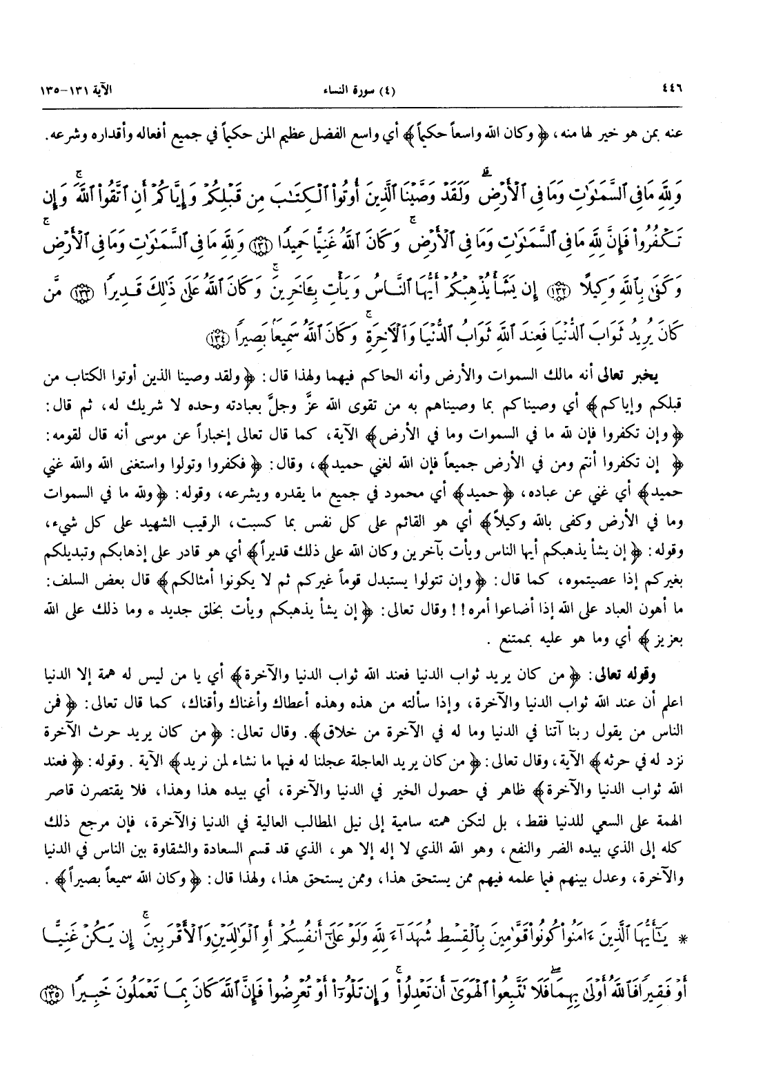 يُخْبِرُ تَعَالَى أنه مالك السموات وَالْأَرْضِ وَأَنَّهُ الْحَاكِمُ فِيهِمَا وَلِهَذَا قَالَ: {وَلَقَدْ وَصَّيْنَا الَّذِينَ أُوتُواْ الْكِتَابَ مِن قَبْلِكُمْ وَإِيَّاكُمْ} أَيْ وَصَّيْنَاكُمْ بِمَا وَصَّيْنَاهُمْ بِهِ مِنْ تَقْوَى الله عزّض وجلَّ بِعِبَادَتِهِ وَحْدَهُ لَا شَرِيكَ لَهُ، ثُمَّ قَالَ: {وَإِن تَكْفُرُواْ فَإِنَّ للَّهِ مَا فِي السموات وما في الأرض} الآية، كَمَا قَالَ تَعَالَى إِخْبَارًا عَنْ مُوسَى أَنَّهُ قَالَ لِقَوْمِهِ: {إِن تَكْفُرُوا أَنتُمْ وَمَن فِي الْأَرْضِ جَمِيعاً فَإِنَّ الله لَغَنِيٌّ حَمِيدٌ} وَقَالَ: {فَكَفَرُواْ وَتَوَلَّواْ وَاسْتَغْنَى اللَّهُ وَاللَّهُ غَنِيٌّ حَمِيدٌ} أَيْ غَنِيٌّ عَنْ عِبَادِهِ، {حَمِيدٌ أَيْ مَحْمُودٌ فِي جَمِيعِ مَا يُقَدِّرُهُ وَيَشْرَعُهُ، وَقَوْلُهُ: {وَللَّهِ مَا فِي السموات وما في الأرض الْأَرْضِ وَكَفَى بِاللَّهِ وَكِيلاً} أَيْ هُوَ الْقَائِمُ عَلَى كُلِّ نَفْسٍ بِمَا كَسَبَتْ، الرَّقِيبُ الشَّهِيدُ عَلَى كُلِّ شَيْءٍ، وَقَوْلُهُ: {إِن يَشَأْ يُذْهِبْكُمْ أَيُّهَا النَّاسُ وَيَأْتِ بِآخَرِينَ وَكَانَ اللَّهُ عَلَى ذَلِكَ قَدِيراً} أَيْ هُوَ قَادِرٌ عَلَى إِذْهَابِكُمْ وتبديلكم بغيركم إذا عصيتموه، كما قال: {وَإِن تَتَوَلَّوْاْ يَسْتَبْدِلْ قَوْماً غَيْرَكُمْ ثُمَّ لاَ يكونوا أَمْثَالَكُم} قال بَعْضُ السَّلَفِ: مَا أَهْوَنَ الْعِبَادَ عَلَى اللَّهِ إِذَا أَضَاعُوا أَمْرَهُ!! وَقَالَ تَعَالَى: {إِن يَشَأْ يُذْهِبْكُمْ وَيَأْتِ بِخَلْقٍ جَدِيدٍ* وَمَا ذَلِكَ عَلَى الله بِعَزِيزٍ} أي وما هو عليه بممتنع.